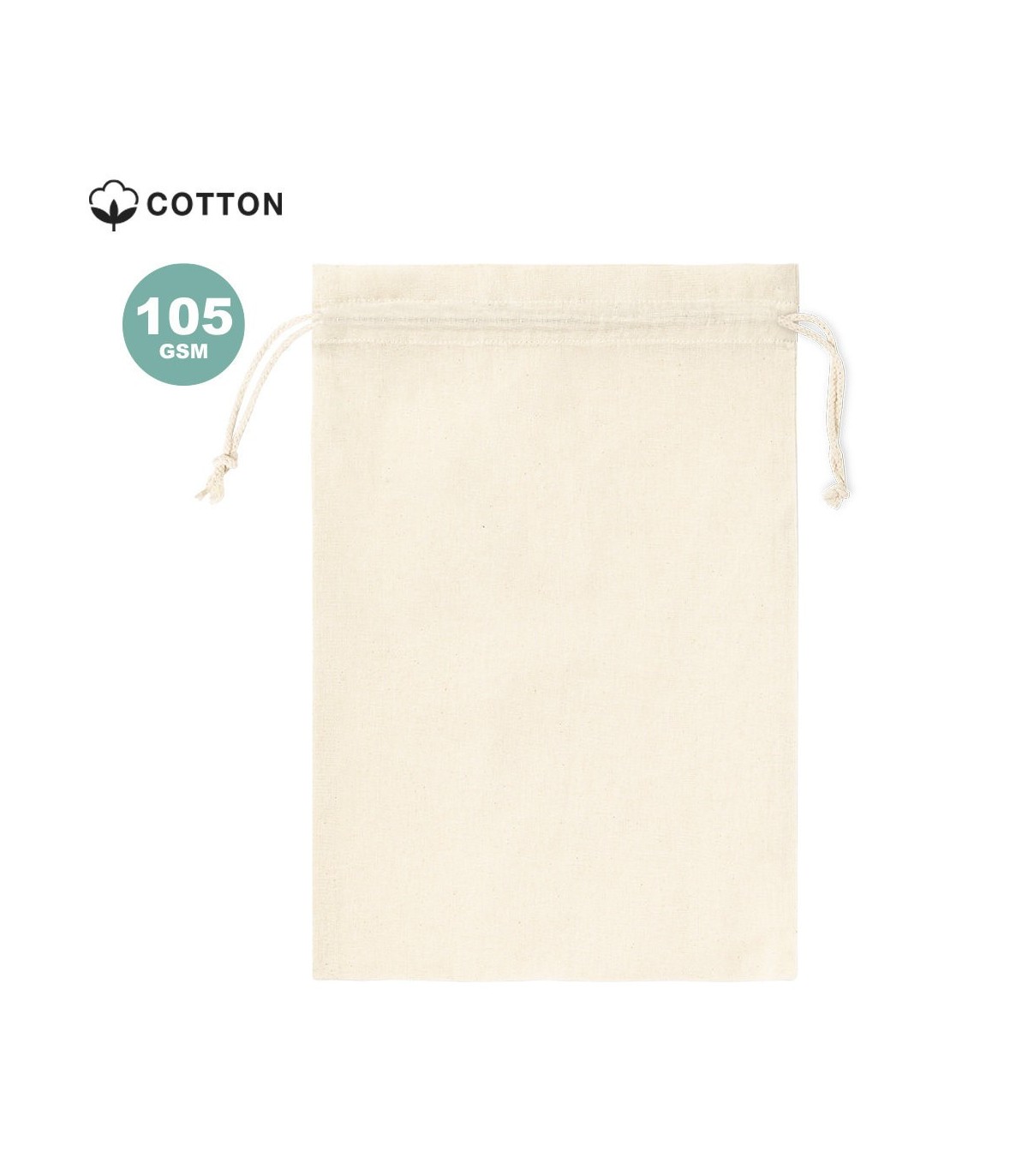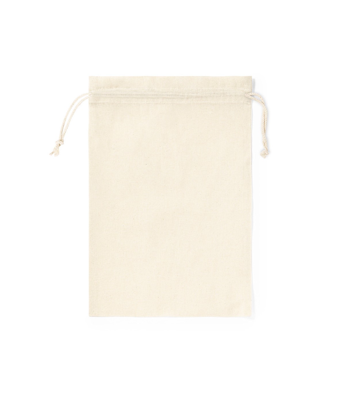 Bolsas de fabricación ecológica en resistente material 100% algodón de 105g/m², con acabado en color natural. Cierre de cordón de algodón y acabado cosido.