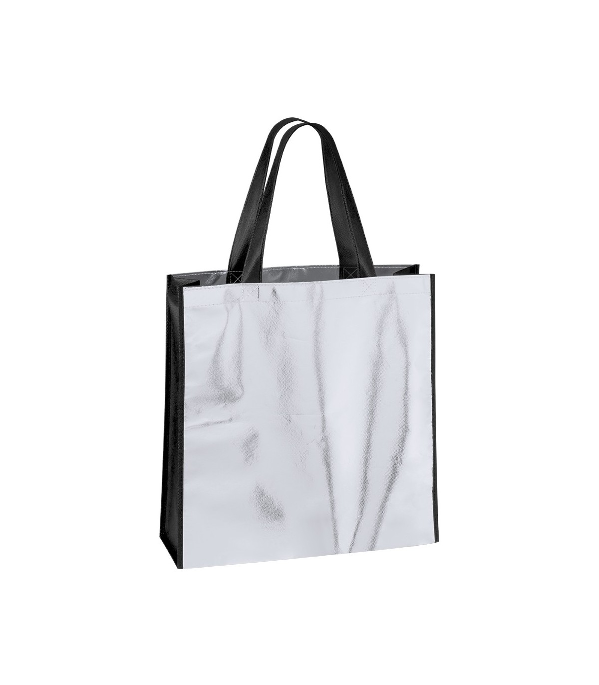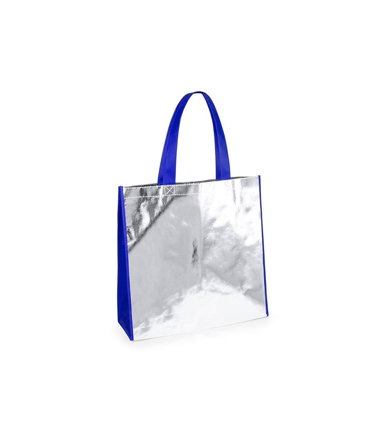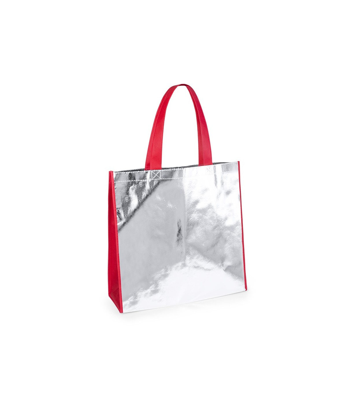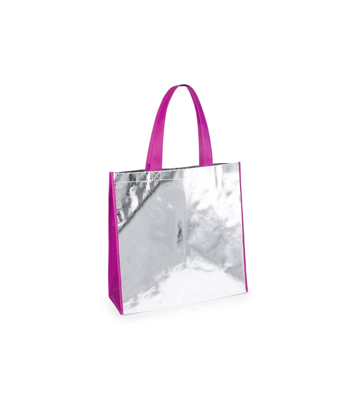 Bolsas en non-woven laminado de acabado metalizado de 120g/m², en combinación de cuerpo en color plateado y asas y fuelles en diferentes colores llamativos para personalizar. Con asas reforzadas medianas de 55cm, fuelle reforzado con ribete y acabado cosido. Con capacidad de almacenaje de hasta 9kg de peso.