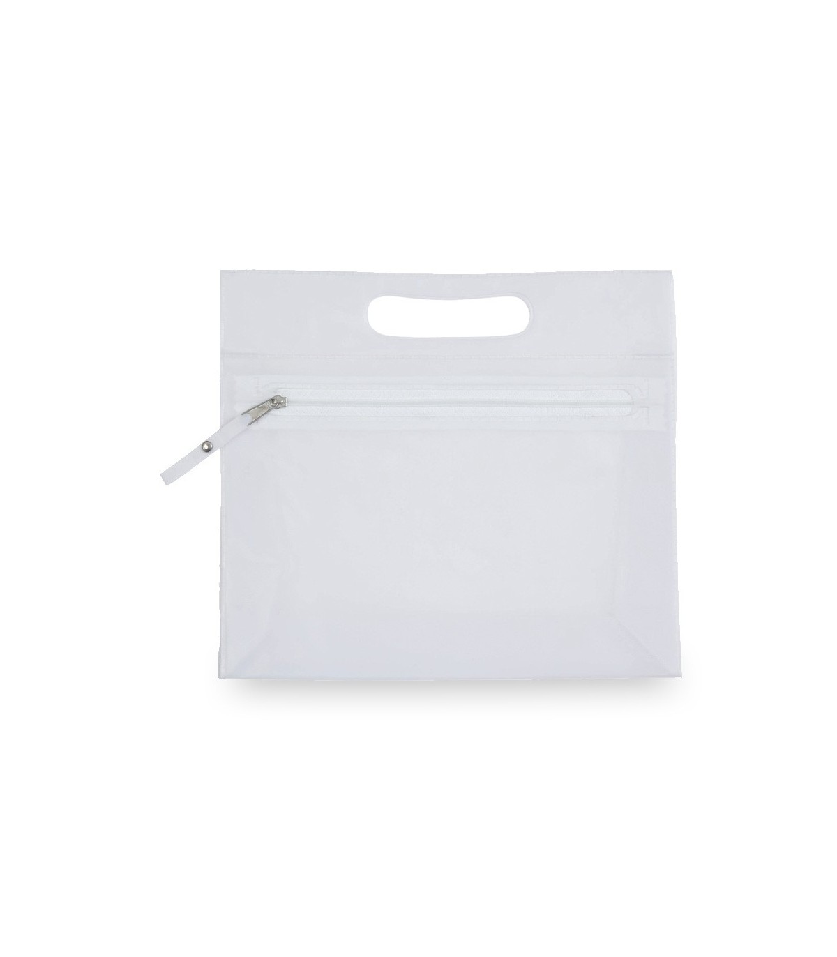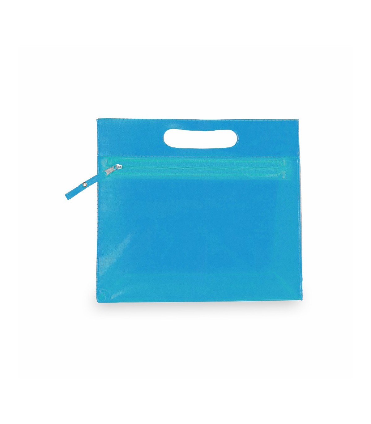 Neceser multiusos en resistente PVC translúcido de variada gama en originales colores para imprimir. Con resistente asa troquelada y cierre de cremallera a juego, con cinta en tirador para fácil apertura.