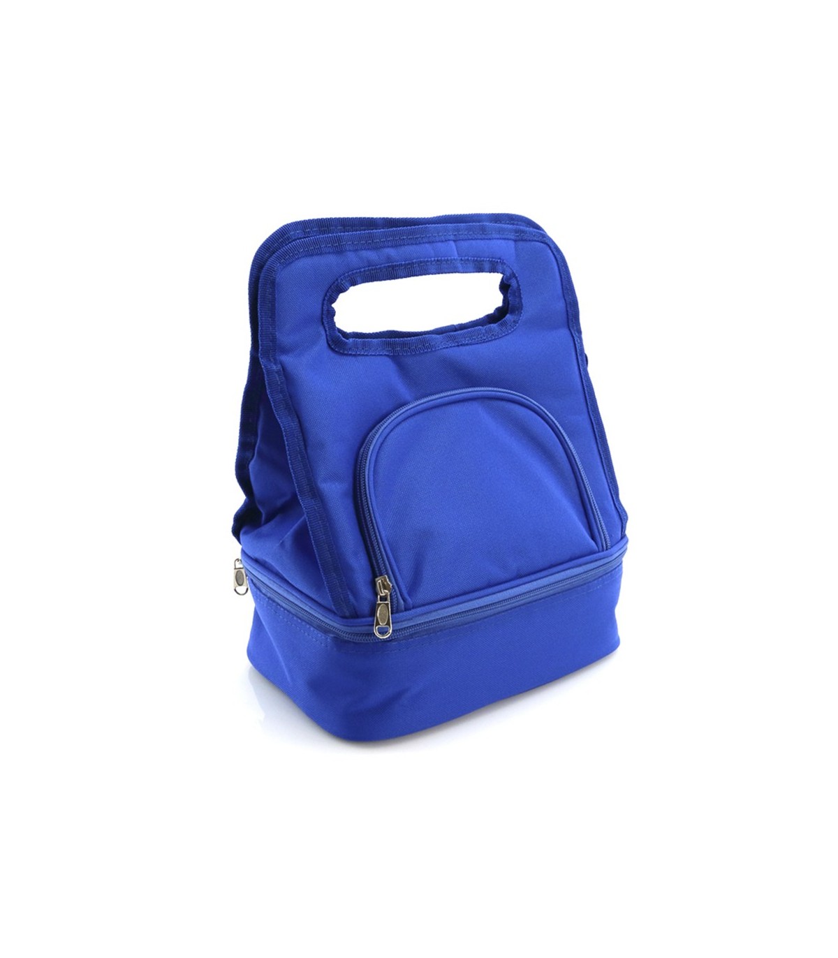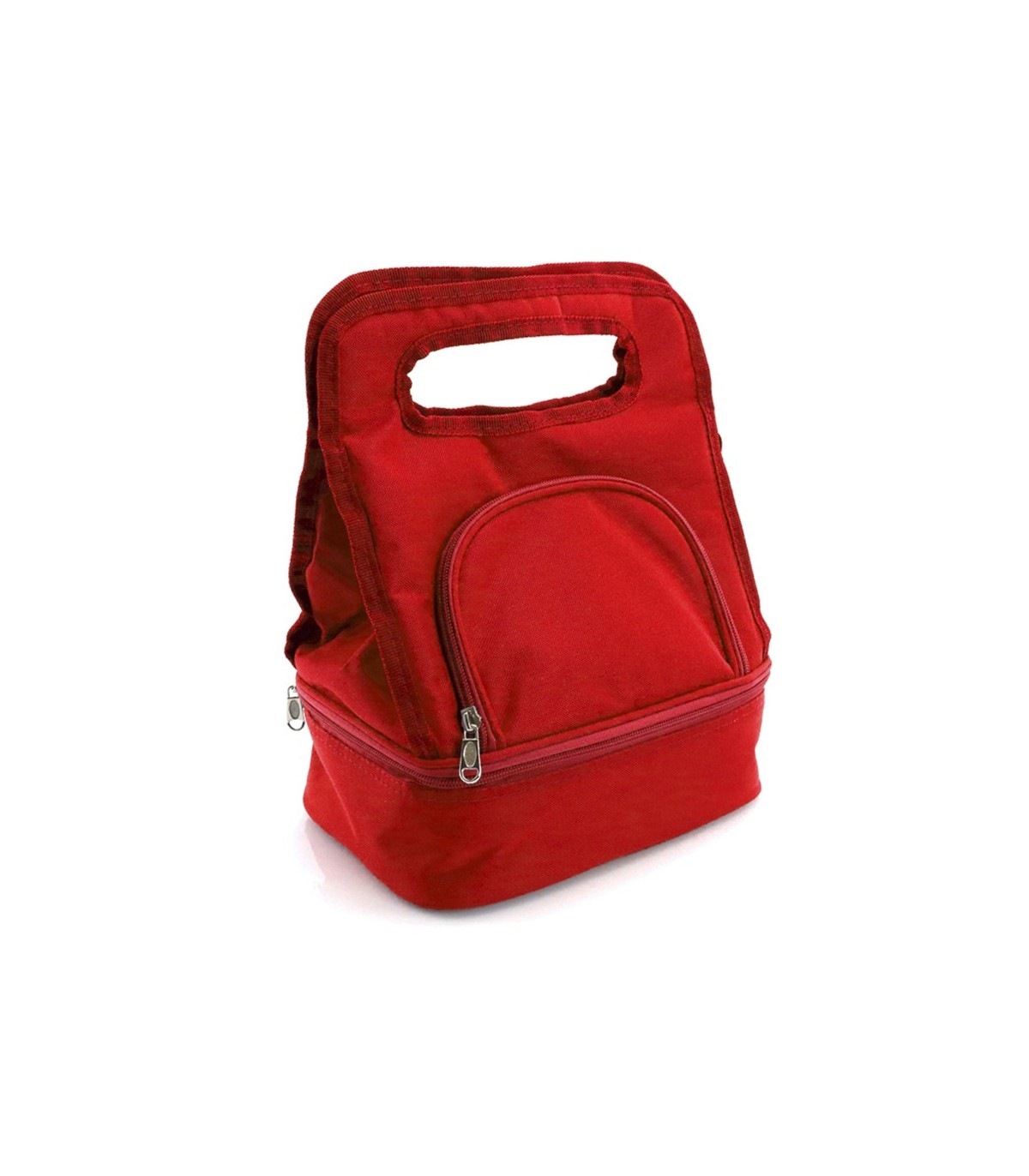 Bolsa nevera dos compartimentos independientes de cierre de cremallera. Con asa troquelada y fiambrera hermética de 1,5l Interior isotermo en acabado de PVC.