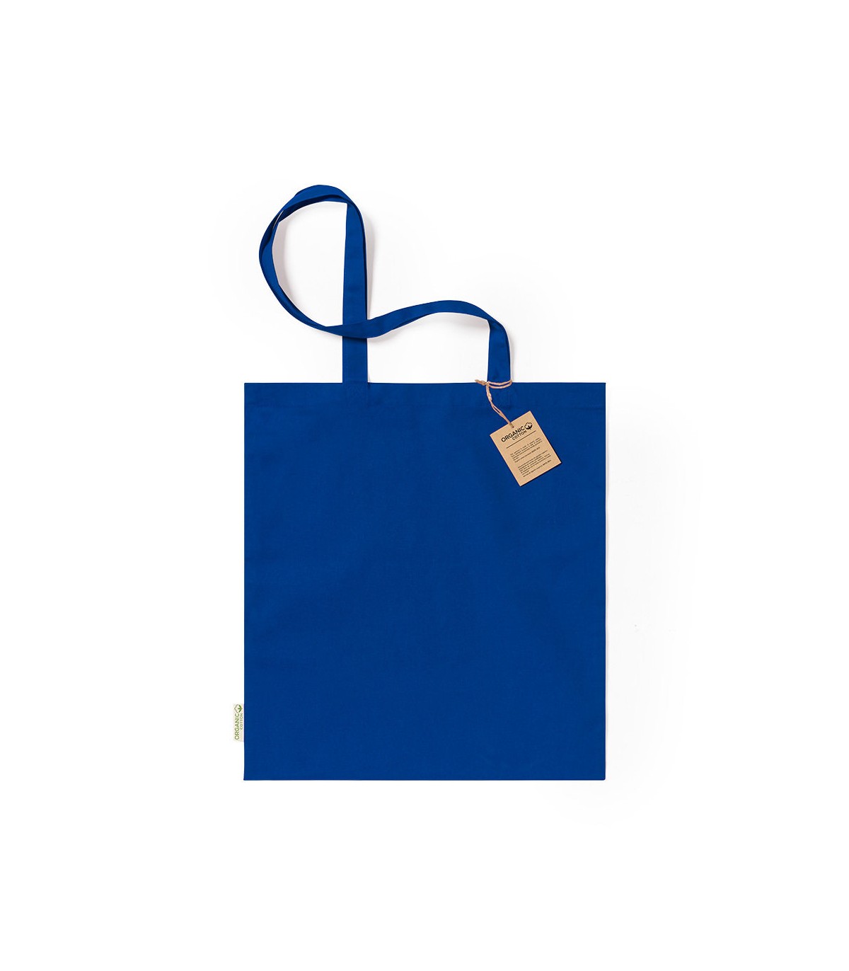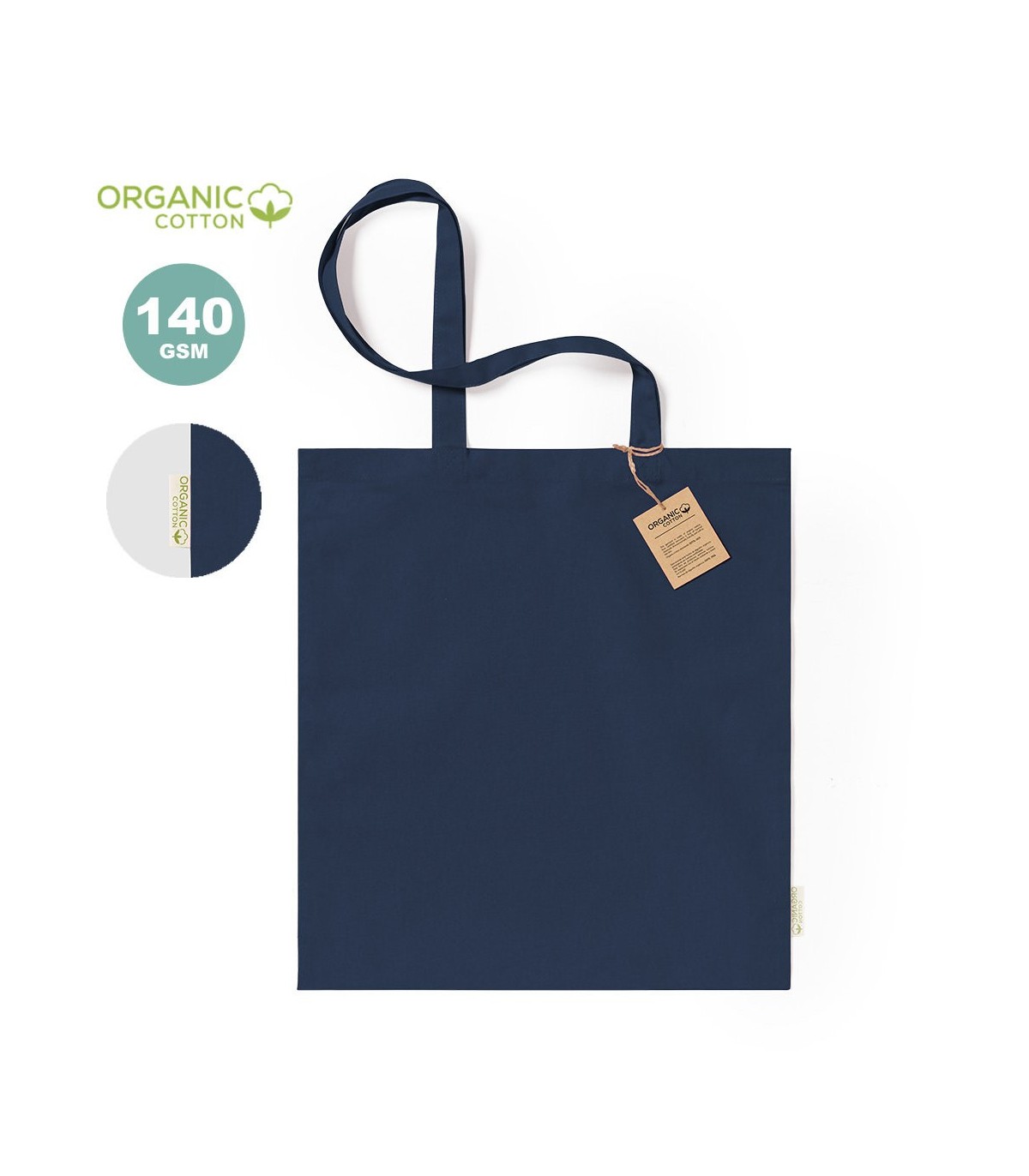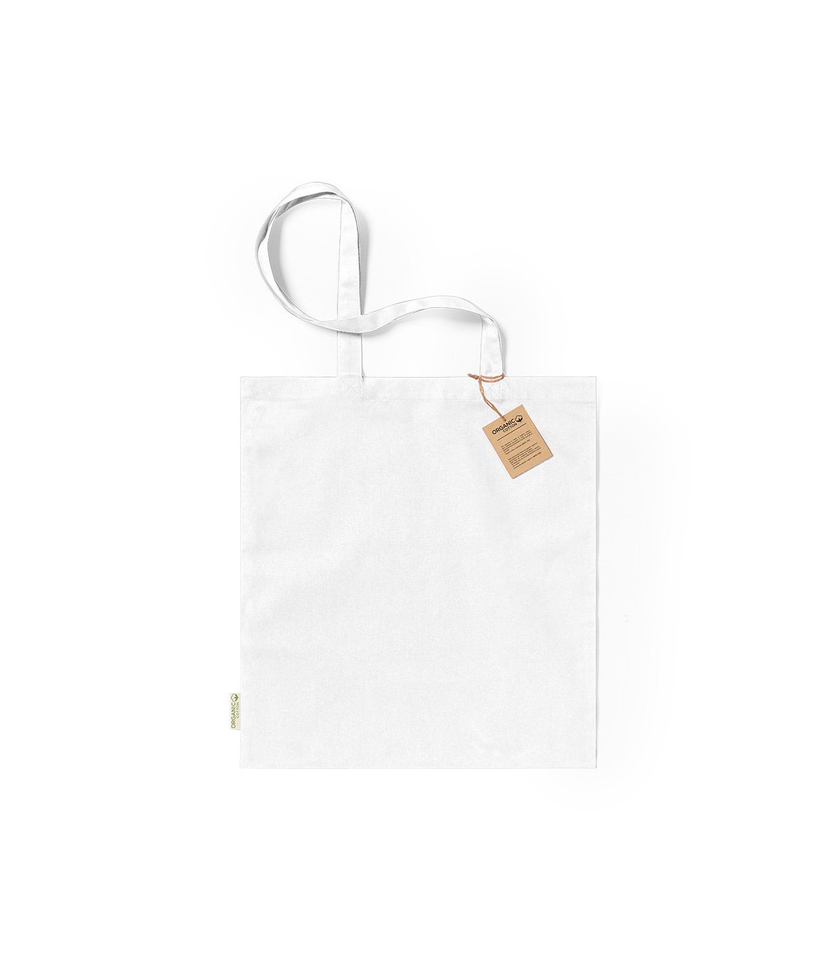 Bolsas hechas en material100% algodón orgánico de 140g/m². Con certificación GOTS (Global Organic Textile Standard, ó Norma Mundial de Textiles Orgánicos) que garantiza que los tejidos están hechos de fibras orgánicas. De acabado cosido, con asas largas reforzadas de 70 cm y disponible en variada gama de colores. Resistencia hasta 8kg, incluida etiqueta con distintivo de algodón orgánico y hangtag en cartón reciclado.