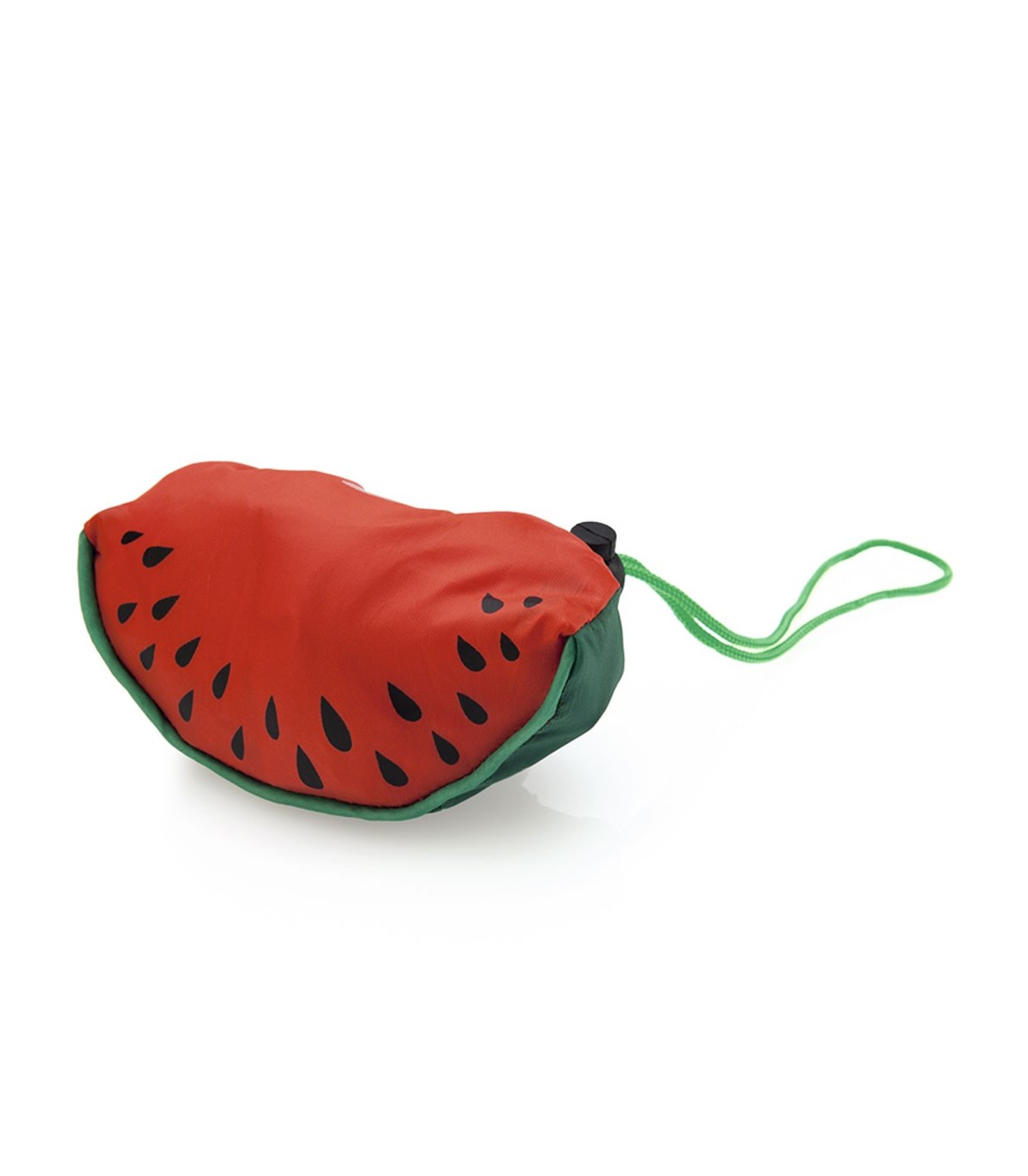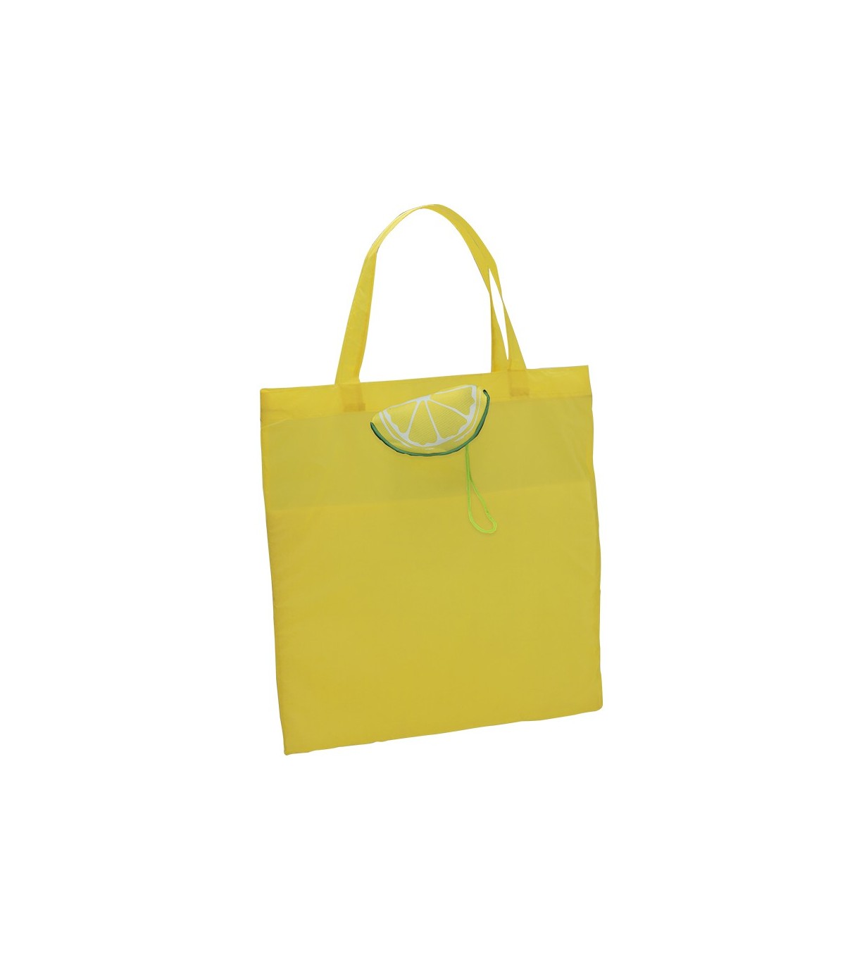 Bolsas plegables de divertidos diseños de frutas en llamativos colores. De suave poliéster 170T y con cordón a juego con accesorio de ajuste. De acabado cosido.