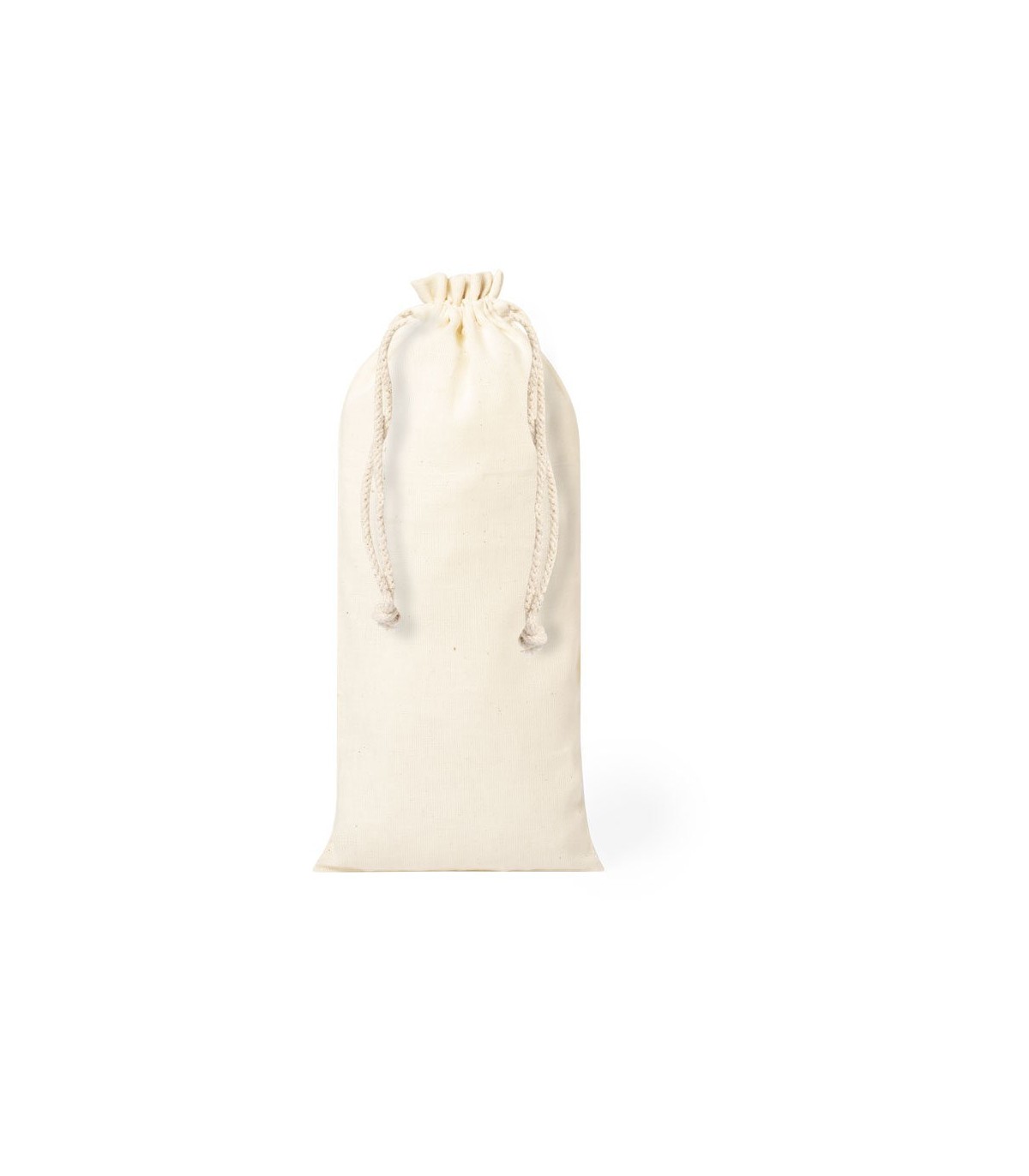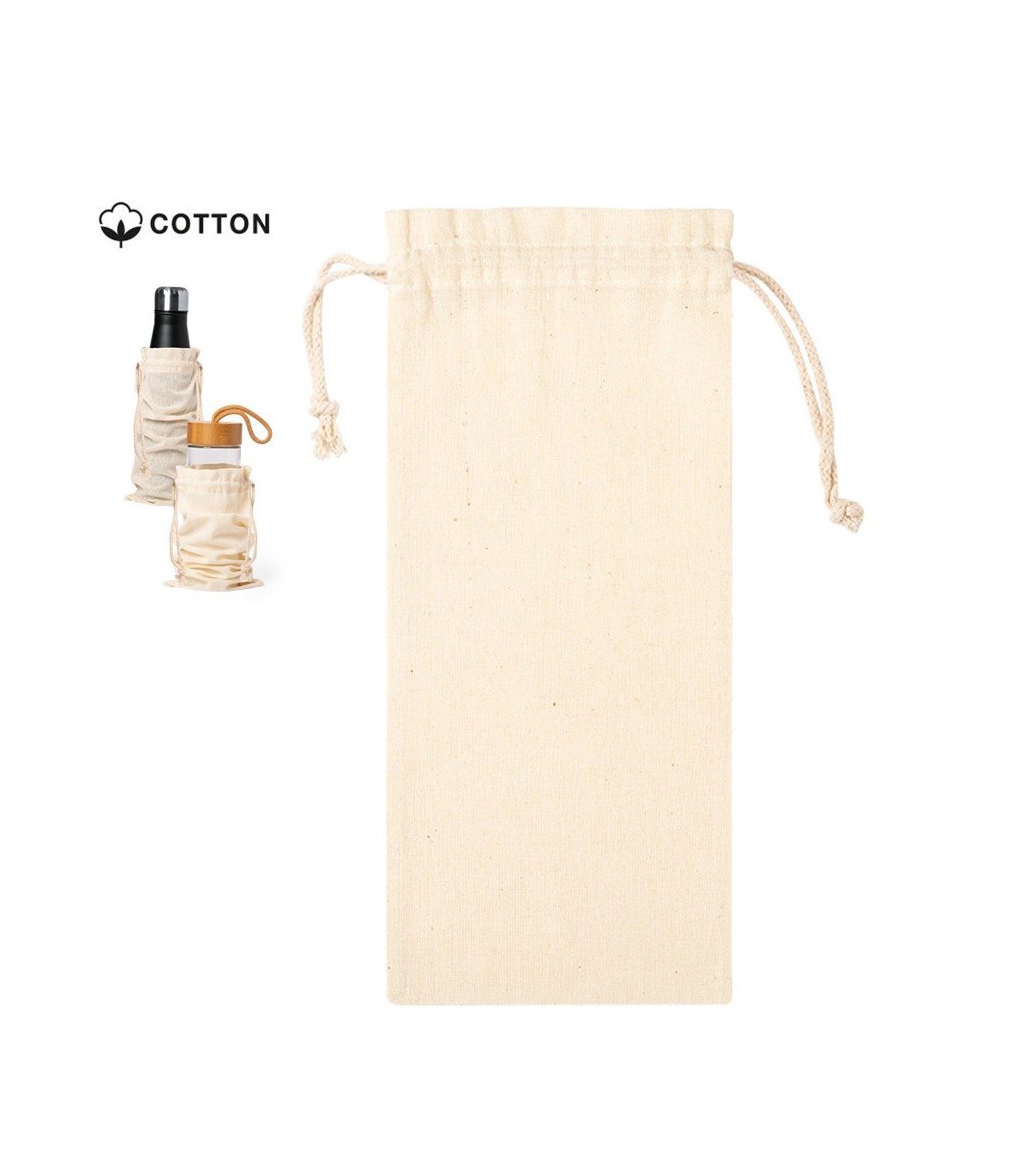 Bolsa de fabricación ecológica en material 100% algodón de 105g/m². Tamaño 12x33 cm, de acabado cosido y con cordones autocierre de algodón. Especialmente diseñada para packaging en botellas y termos.