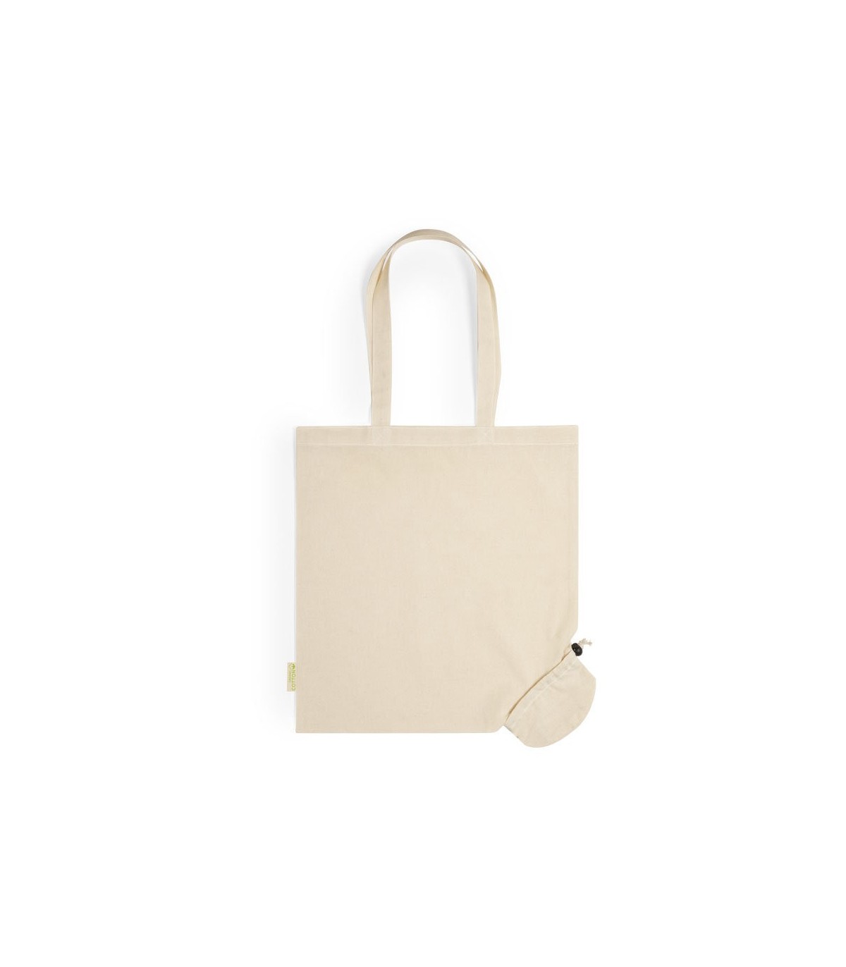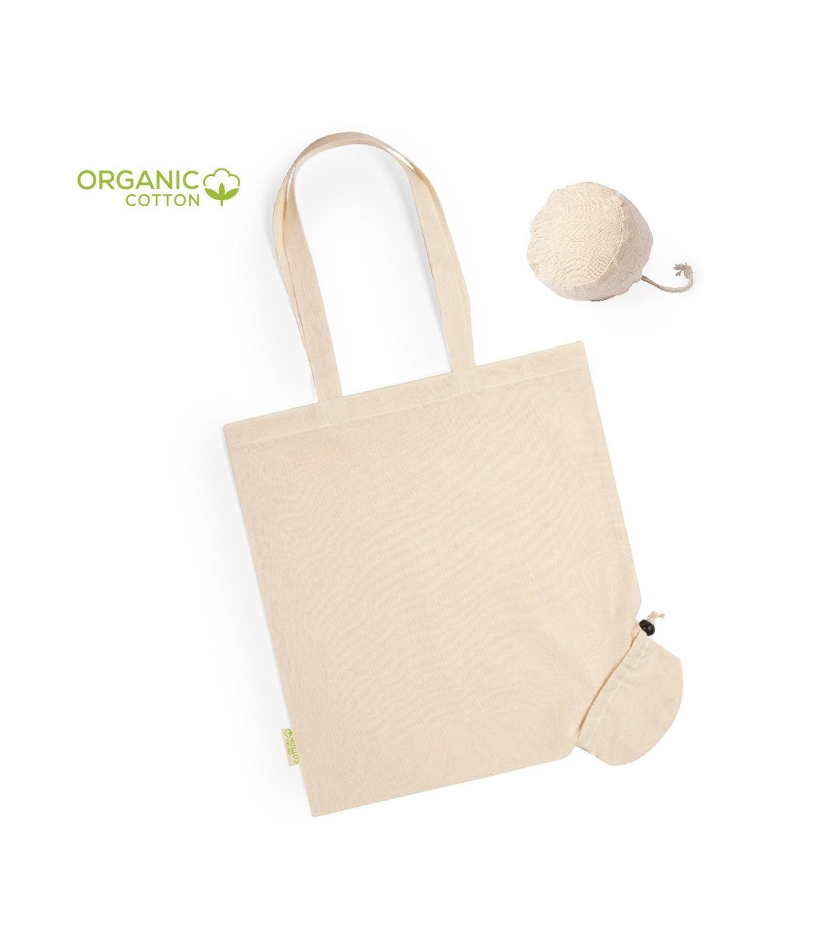 plegables de línea ecológica en material 100% algodón orgánico natural de 120 g/m². Asas largas de 70cm con refuerzo y de acabado cosido. Distintivo orgánic en etiqueta lateral y Con capacidad de almacenaje de hasta 9 kg de peso. Plegado de pequeño tamaño para fácil transporte.