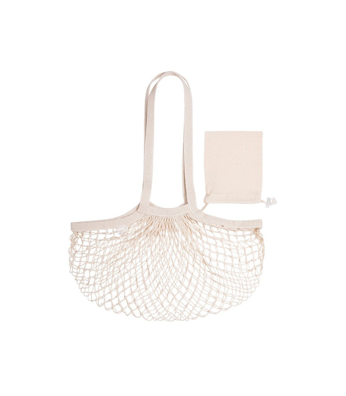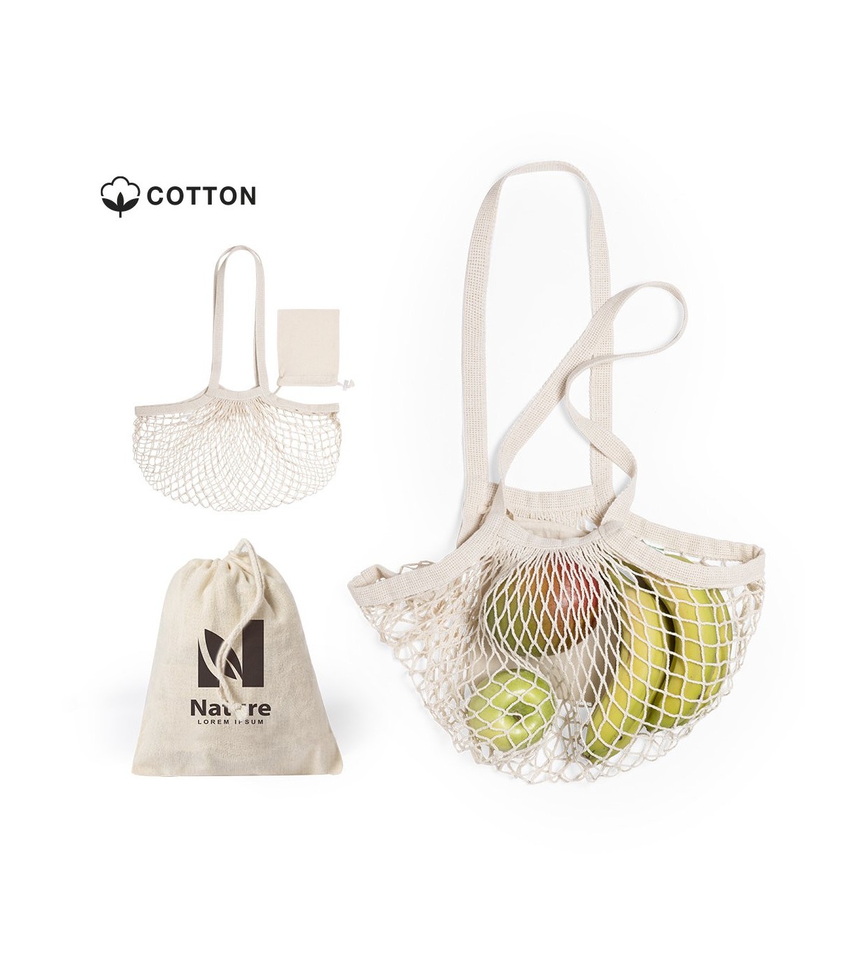 Bolsas plegables de redecilla de gran capacidad. de fabricación ecológica en algodón crudo, con bolsita lisa para impresión de cierre de cordón. Asas largas y plegado de pequeño tamaño para fácil transporte.