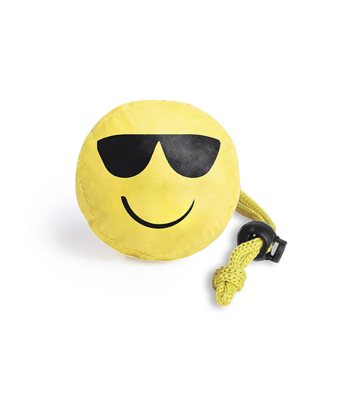 Bolsa plegable de divertidos diseños emoji en llamativo color amarillo. De suave poliéster 190T y con cordón a juego con accesorio de ajuste.