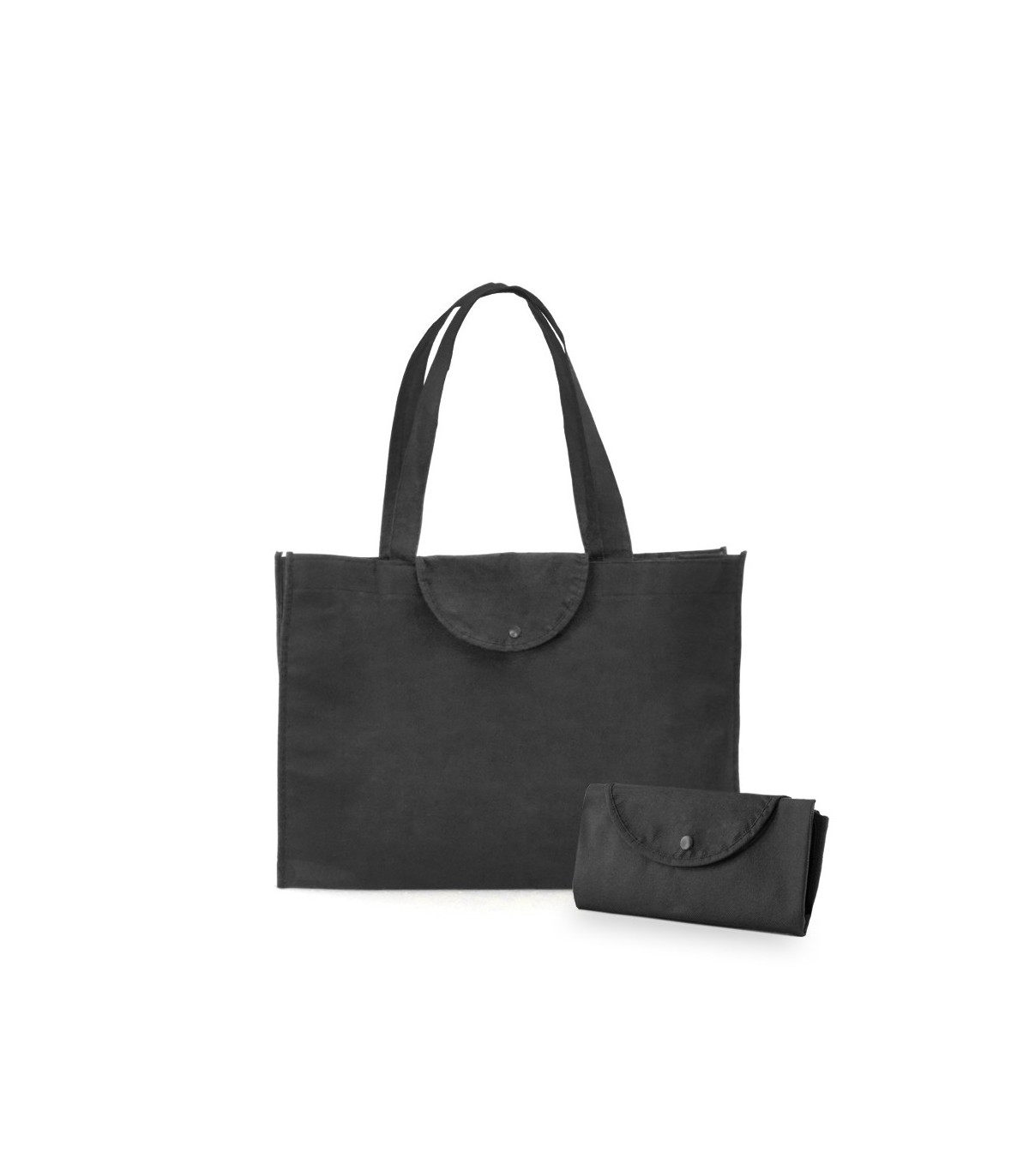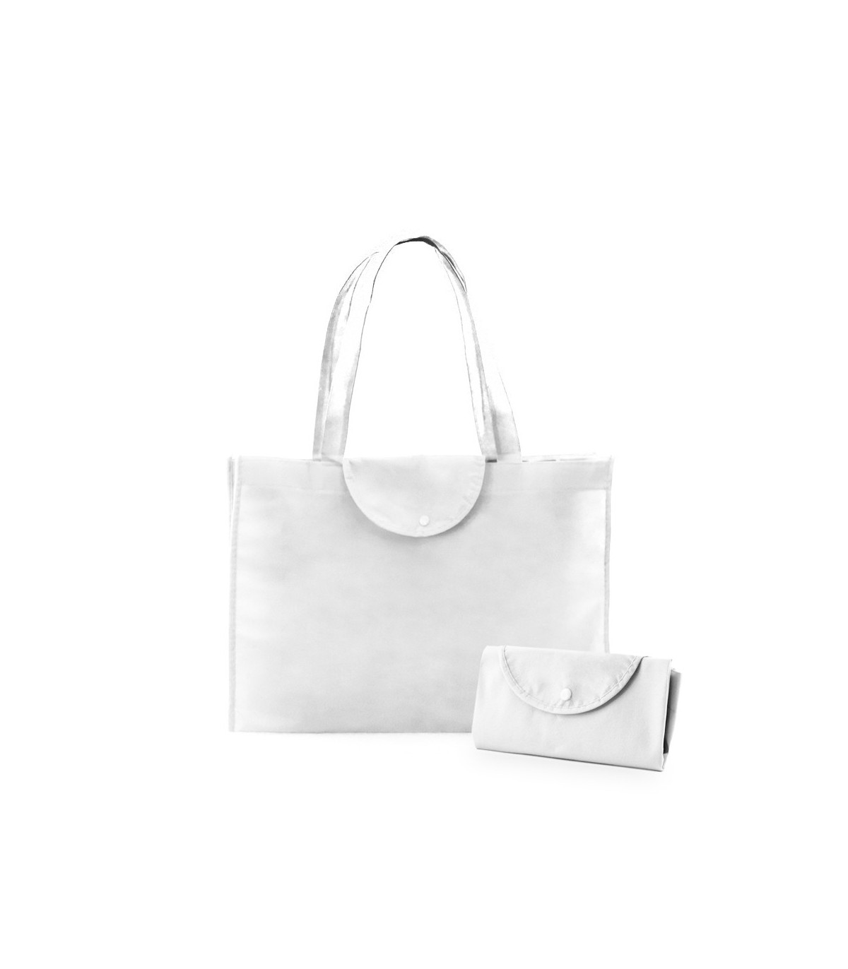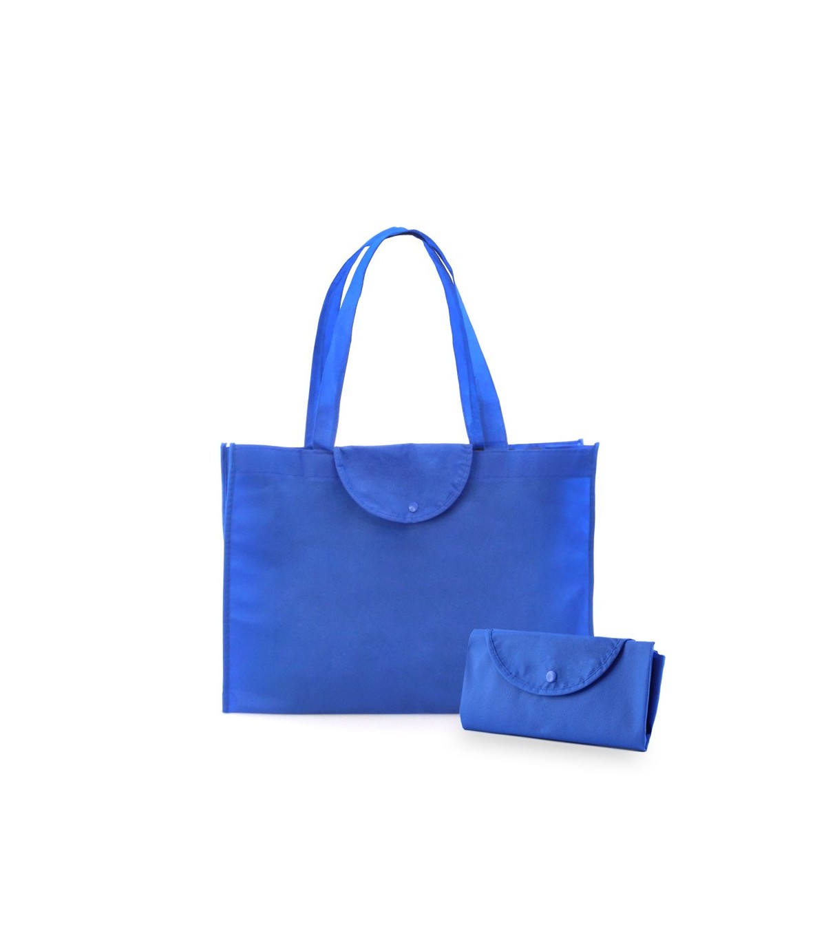 Bolsas plegables en non-woven de 90 g/m² en diferentes colores llamativos para personalizar. Con asas medianas de 56cm, cierre de solapa con botón a juego, fuelles reforzados con ribetes y acabado cosido. Plegado de pequeño tamaño y Con capacidad de almacenaje de hasta 9kg de peso.