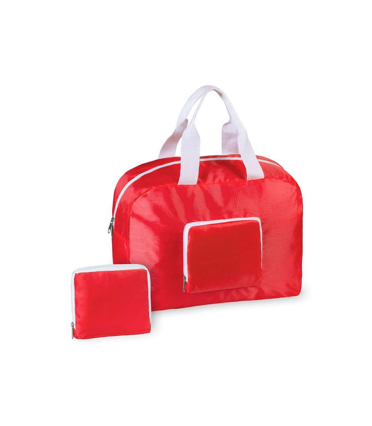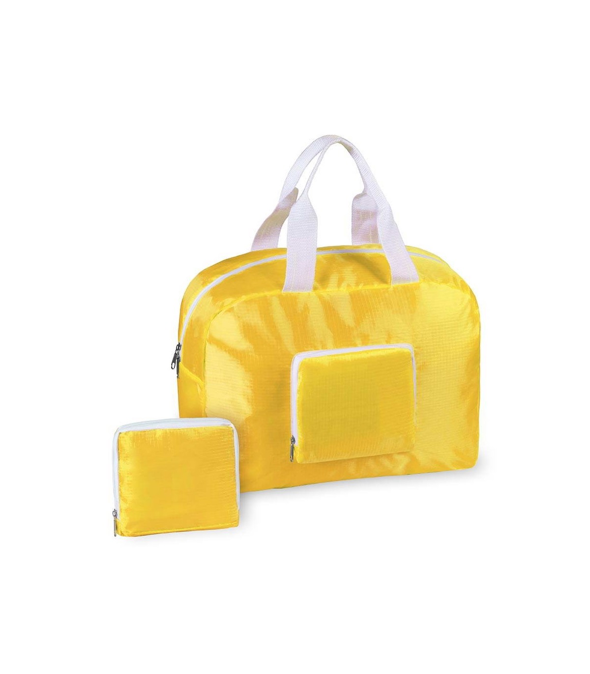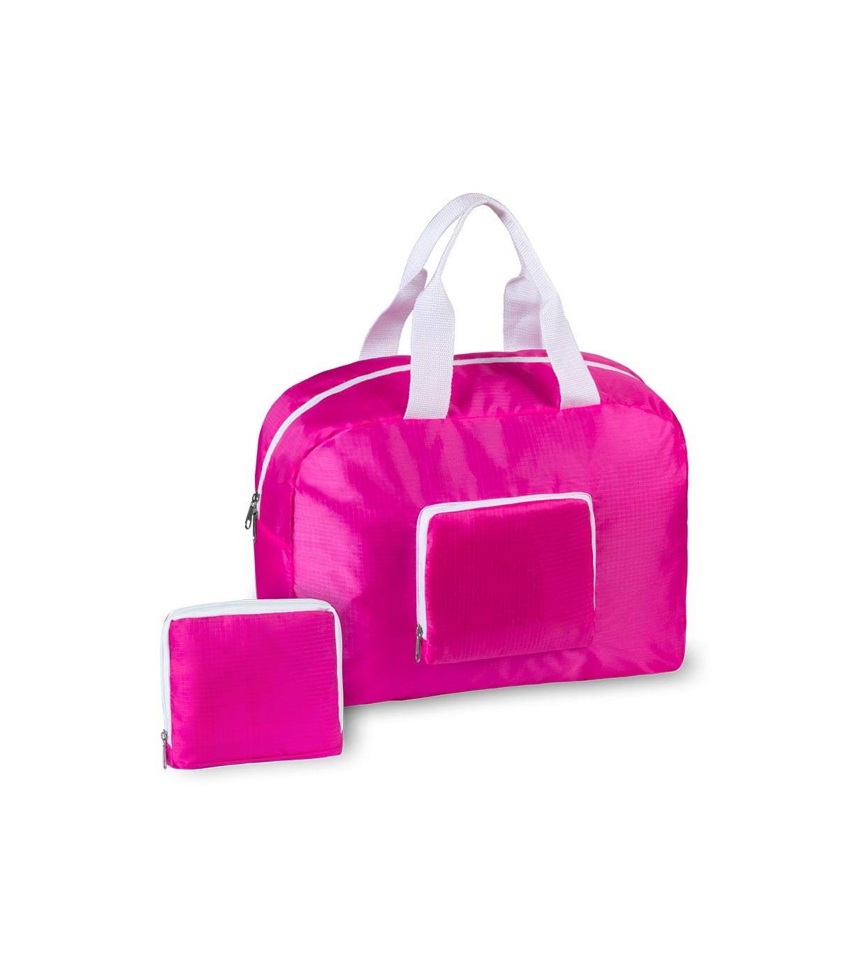 Bolso plegable multiusos en suave material ripstop en desenfadado y vivo diseño bicolor. Bolsillos principal y frontal con cierre de cremallera en color blanco. Con resistentes asas de nylon a juego y plegado de pequeño tamaño.