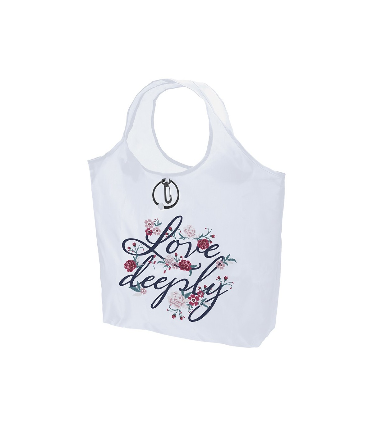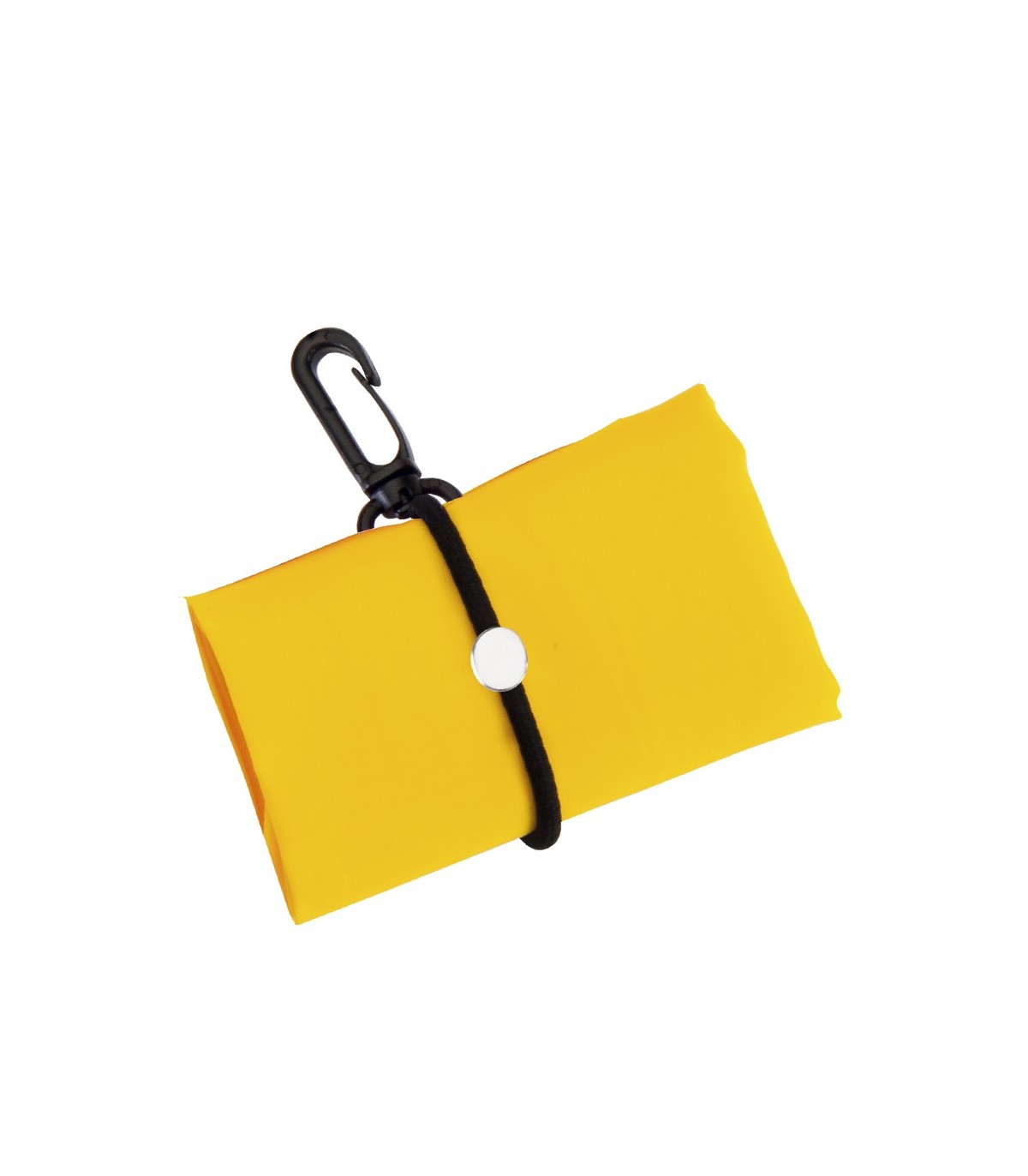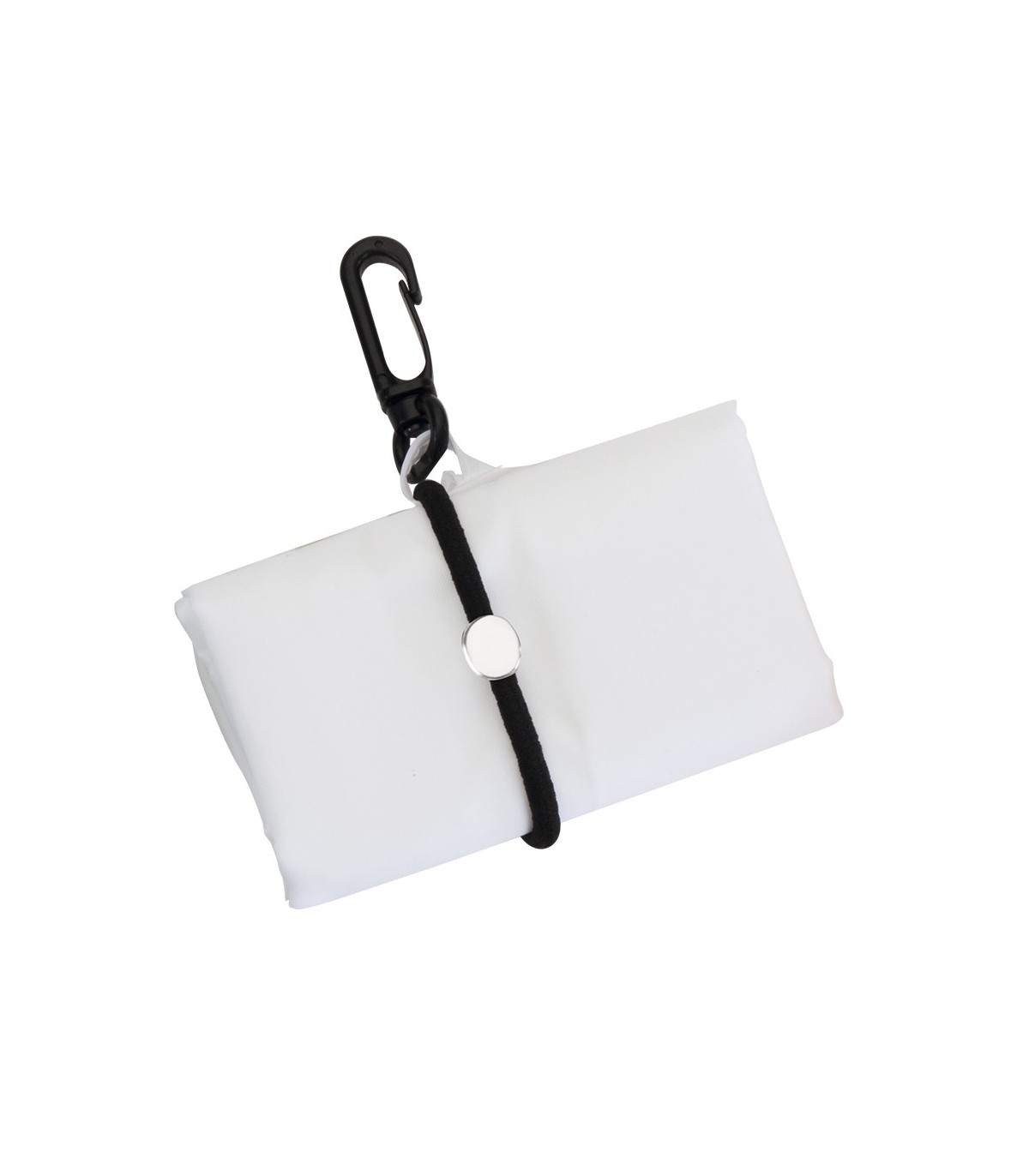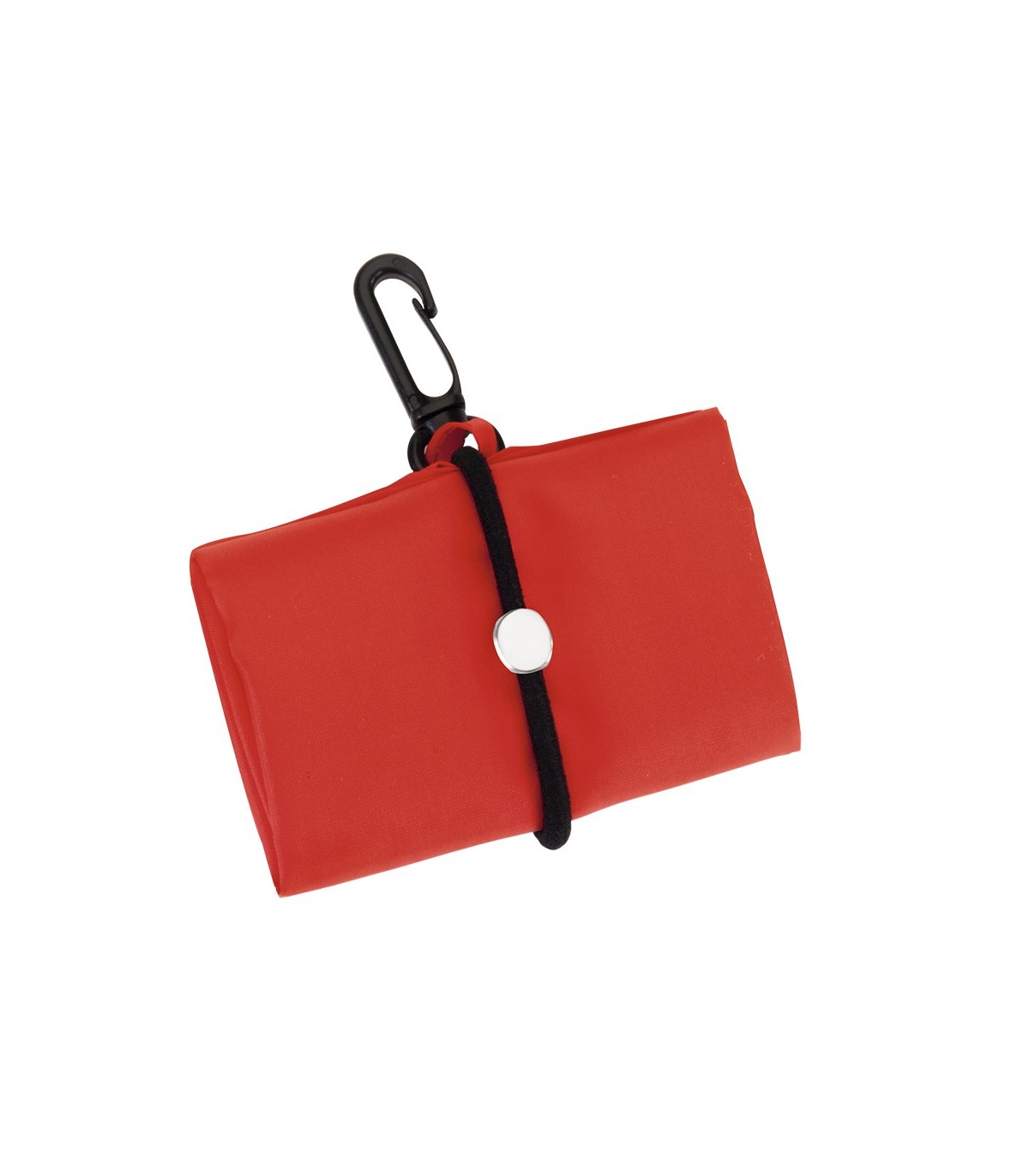 Bolsas plegables personalizadas cosidas y muy resistentes fabricadas en poliéster 190T con elástico para sujetar y mosquetón de transporte.