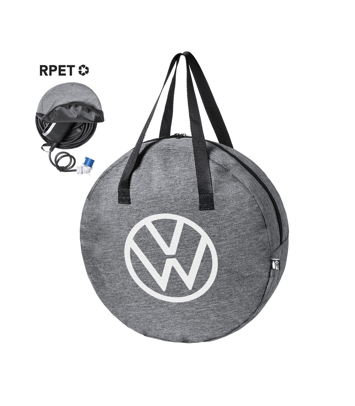 Bolsas portacables para vehículos eléctricos. de fabricación ecológica y hecho en resistente poliéster 600D RPET efecto melange, elaborado a partir de plástico reciclado, para así fomentar su reutilización de residuos plásticos y ayudar a la sostenibilidad del planeta. Con cierre de cremallera, tiradores de metal y asas de transporte reforzadas. Interior forrado, con distintivo RPET en etiqueta exterior.