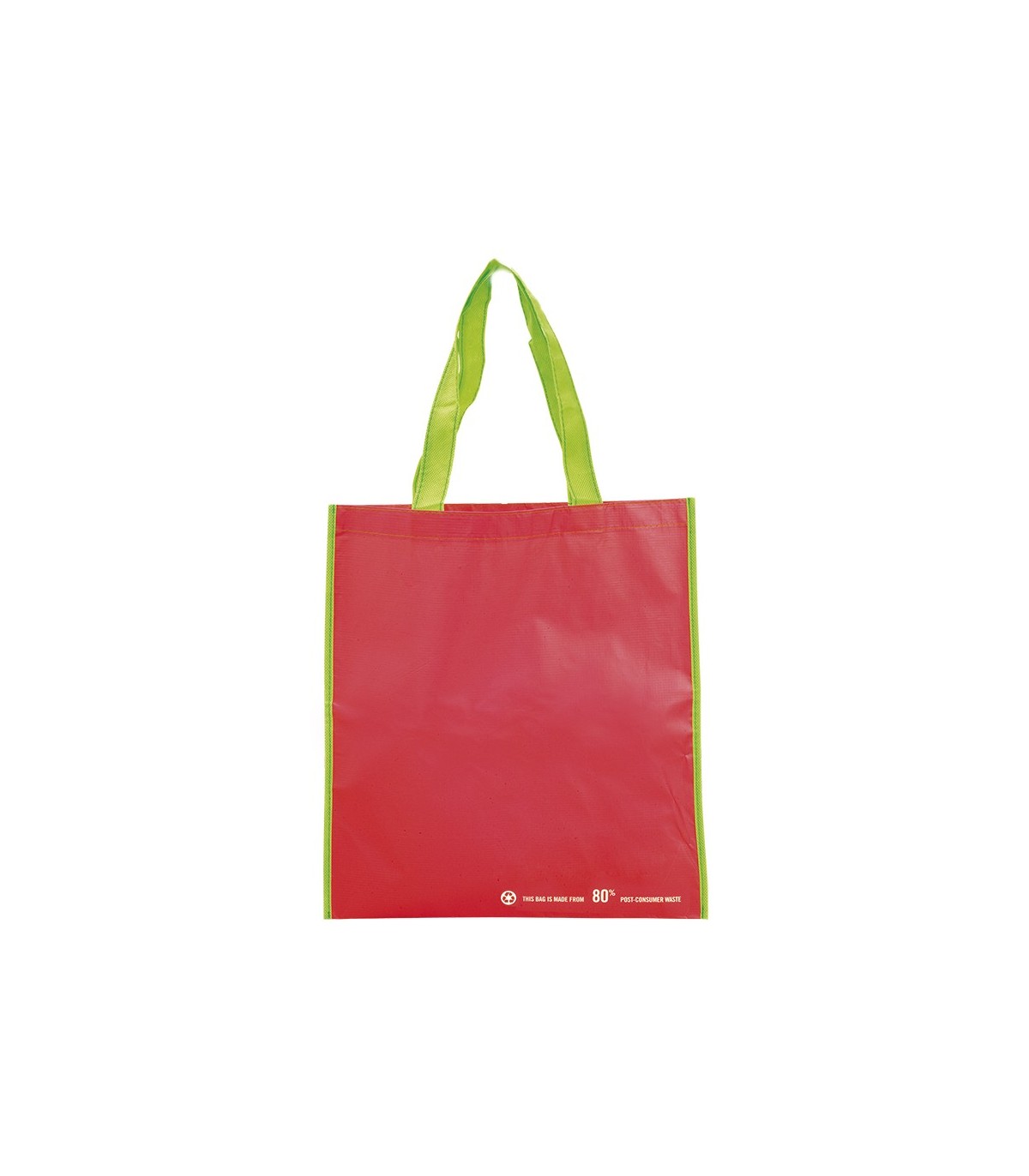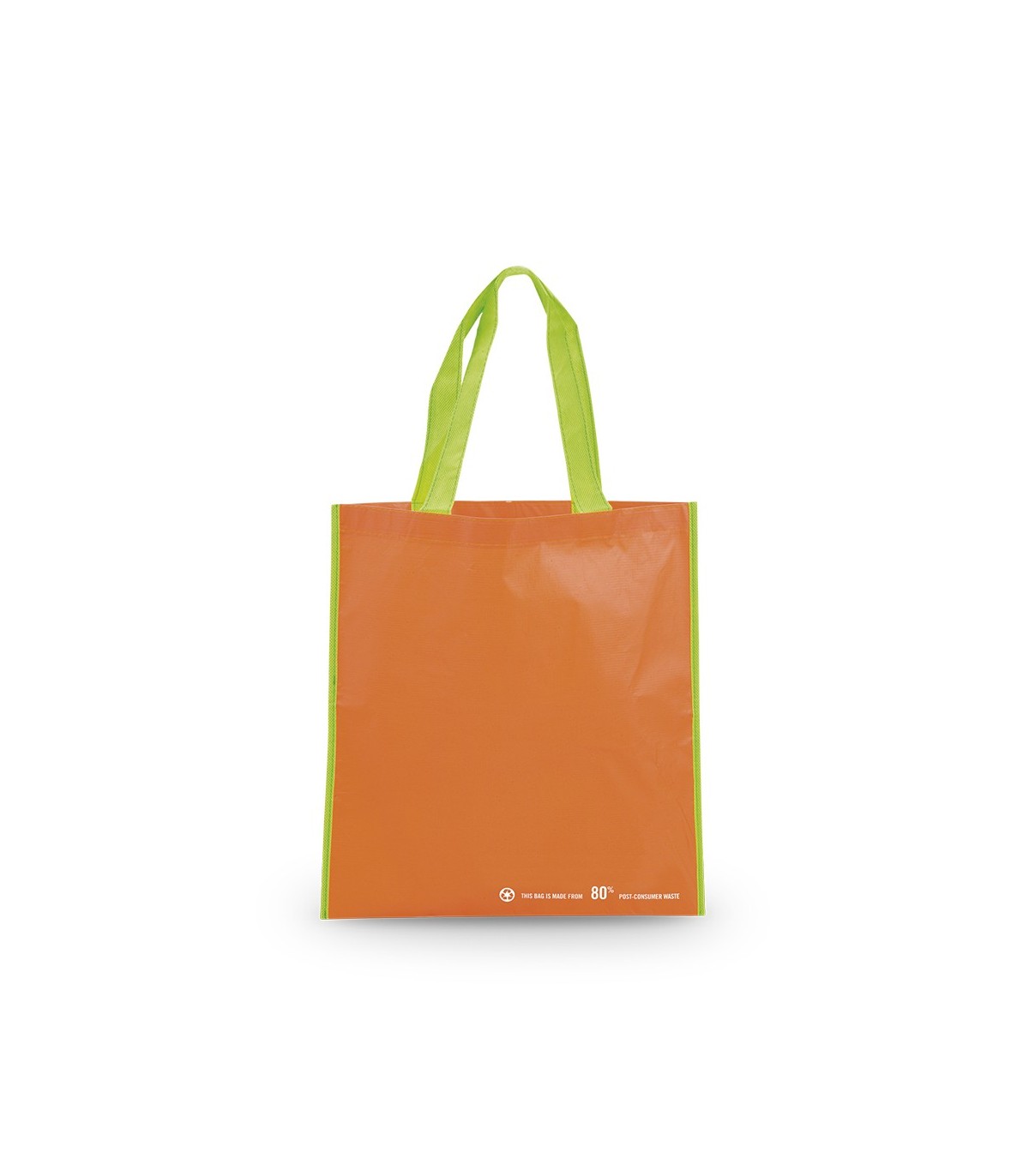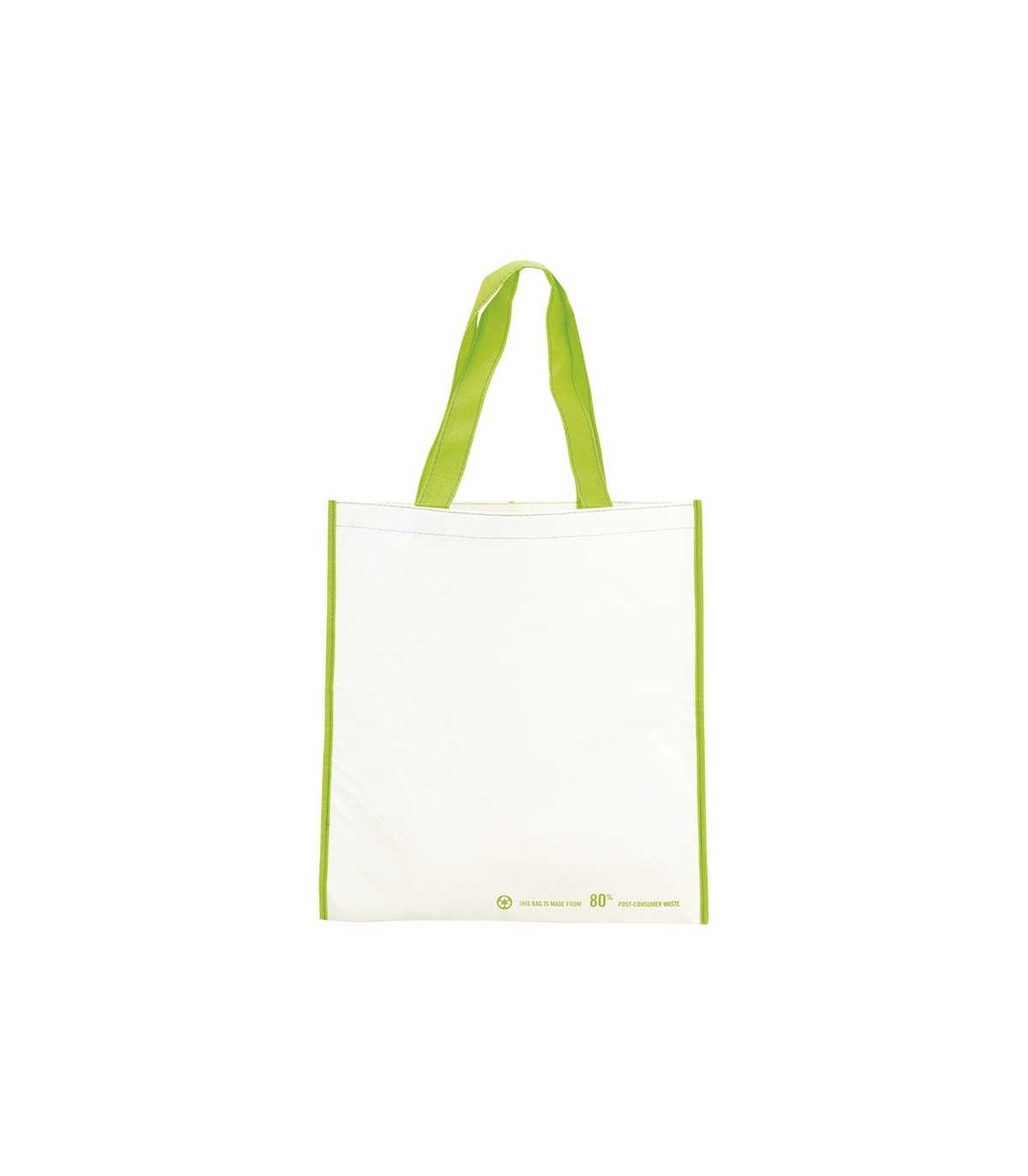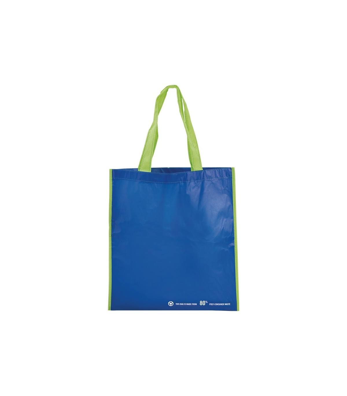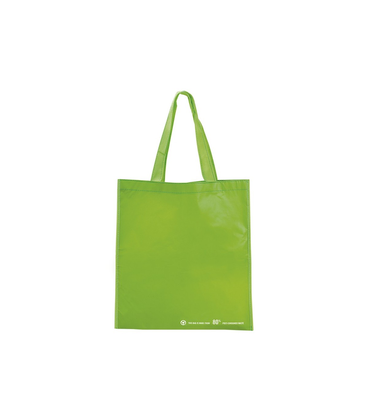 Bolsas en resistente material PET reciclado en diferentes colores llamativos para personalizar brillantes. Con asas largas de 60cm en verde y reforzadas en nylon. Fuelle en verde reforzado con ribetes. De acabado cosido y Con capacidad de almacenaje de hasta 12kg de peso.