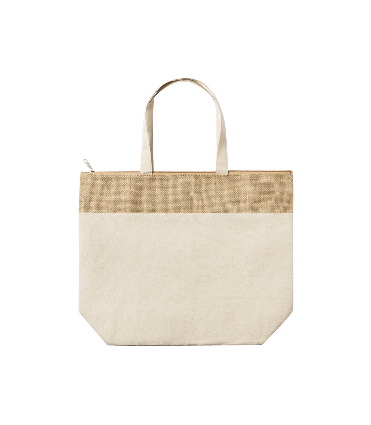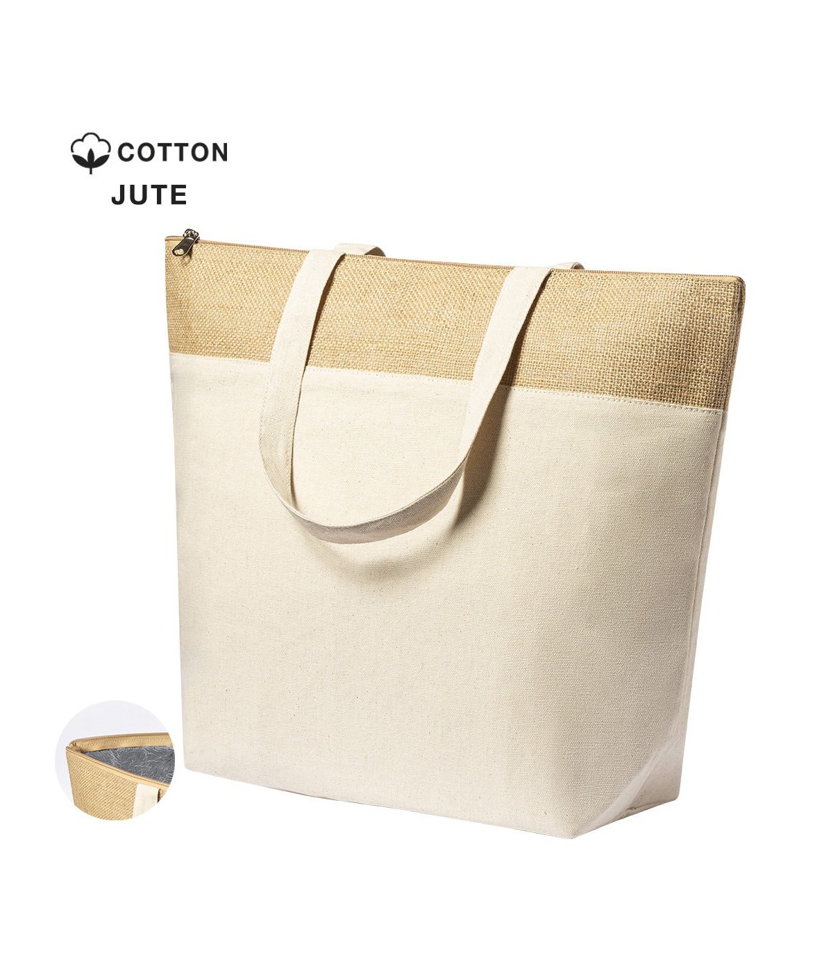 Bolsas térmica de 100% algodón de 225g/m², con parte superior en yute laminado y asas de algodón. Compartimento principal con cierre de cremallera y tirador metálico, con interior isotermo de aluminio.