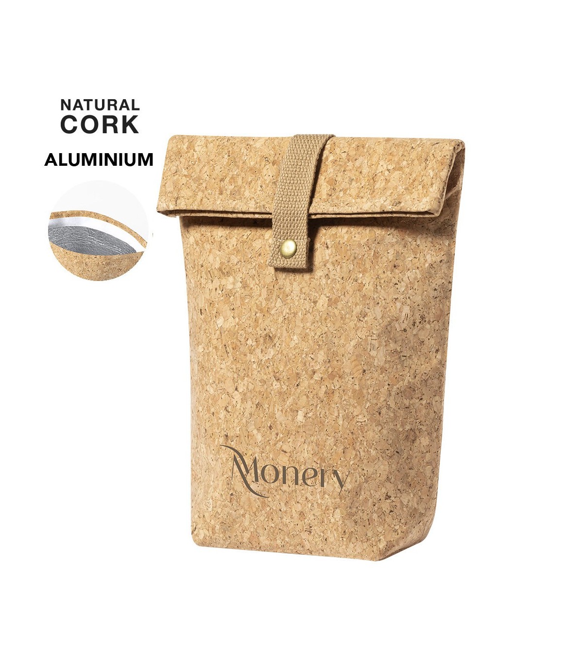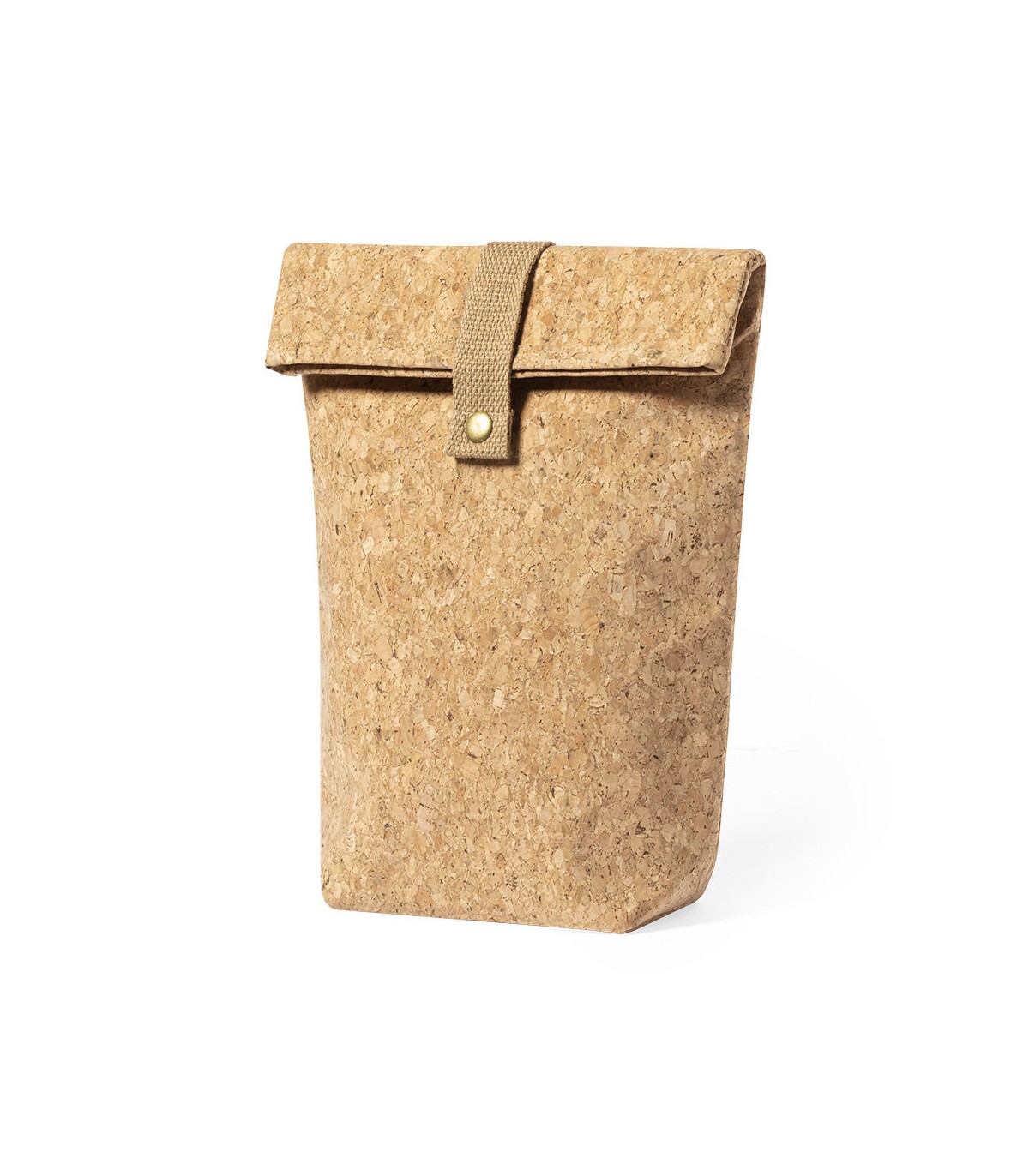 Bolsas térmica de fabricación ecológica hecho en corcho. Compartimento principal con tira de algodón y cierre de corchete, con interior isotermo de aluminio.