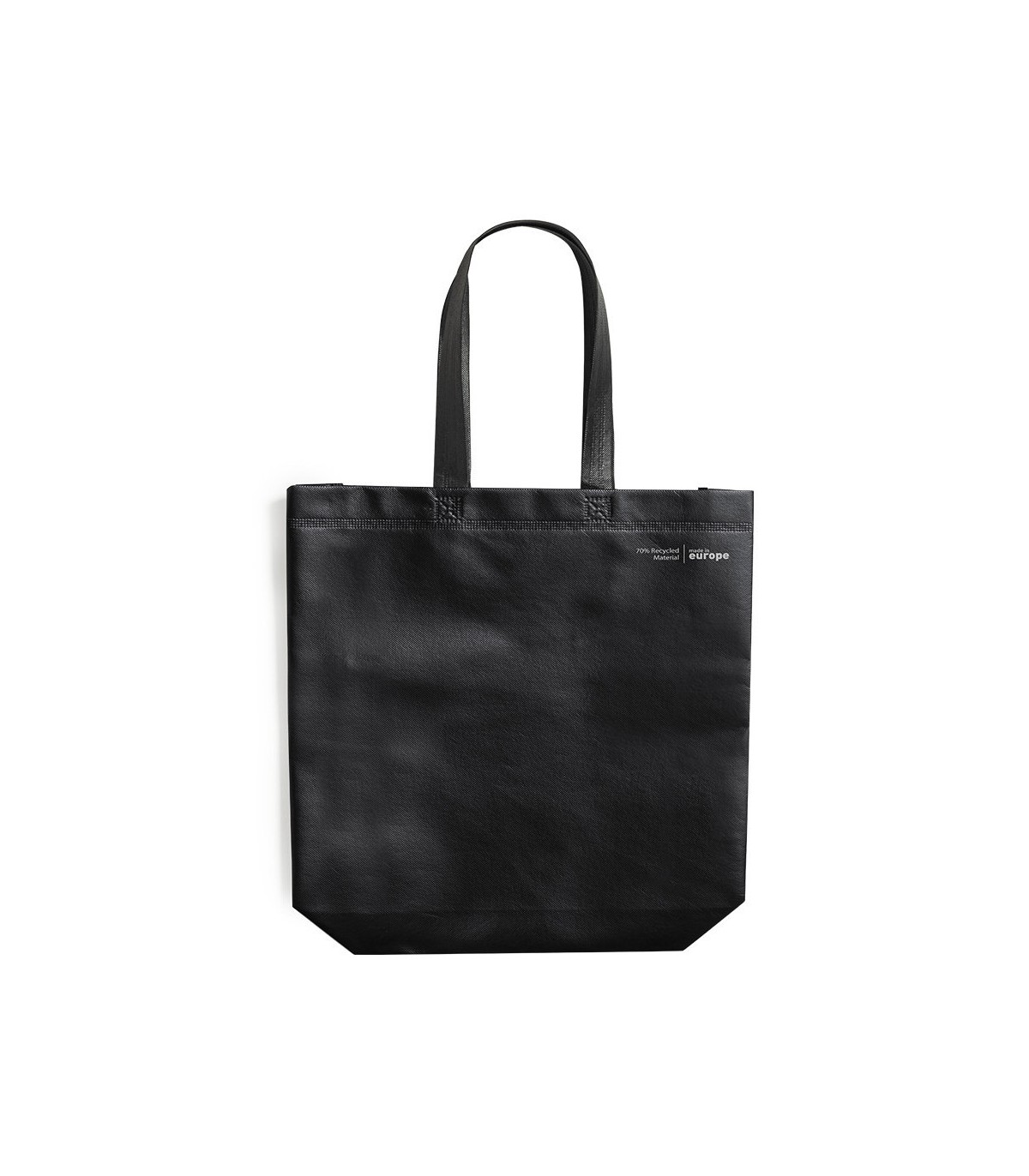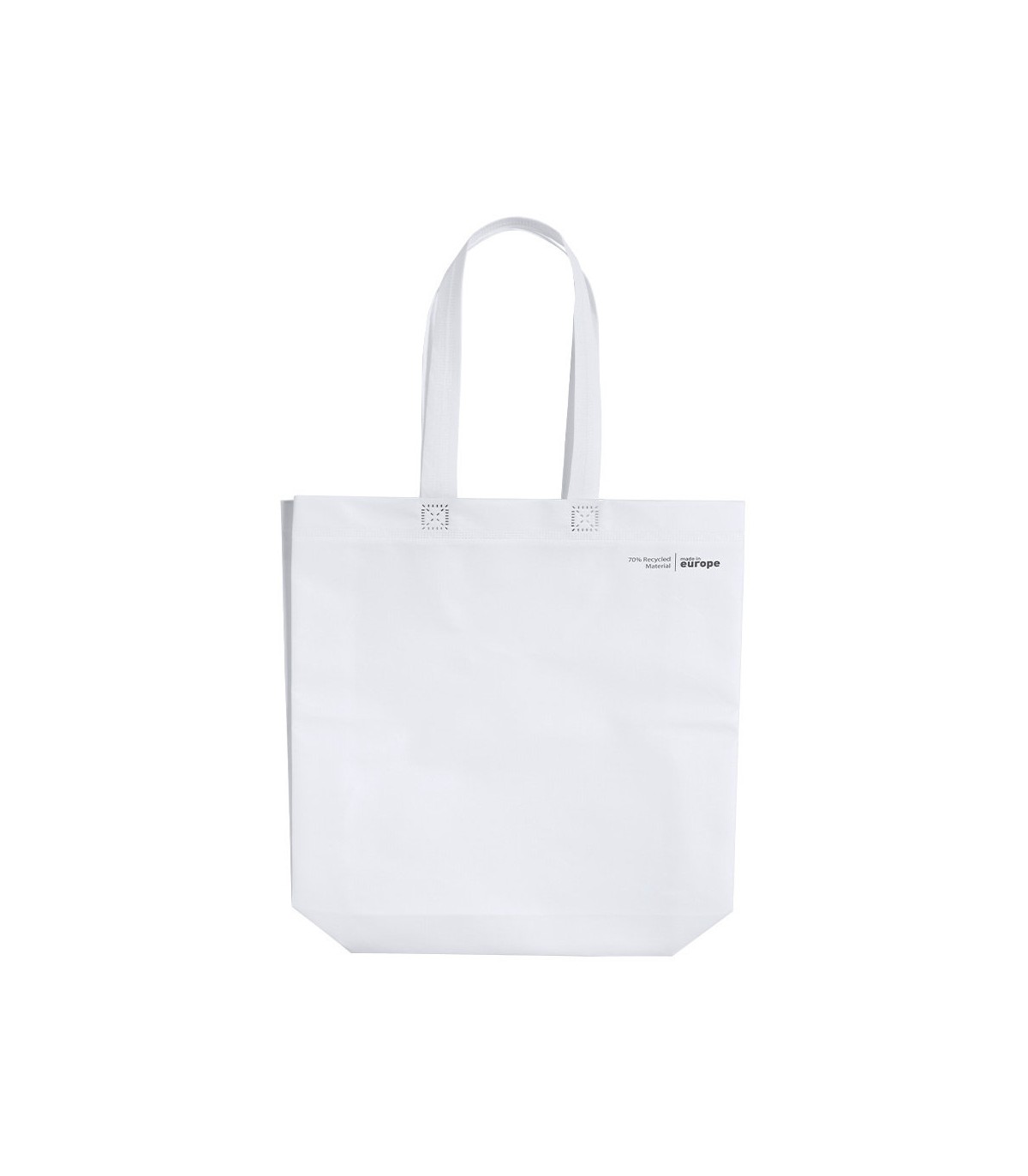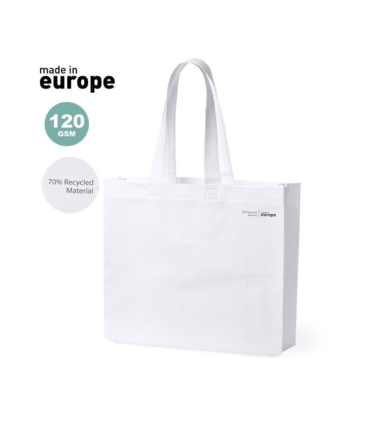 Bolsas de fabricación ecológica, hechas en non-woven laminado reciclado de 120g/m². De fabricación europea, con acabado termosellado, con fuelle, asas largas y distintivo eco/made in sobre la Bolsas.