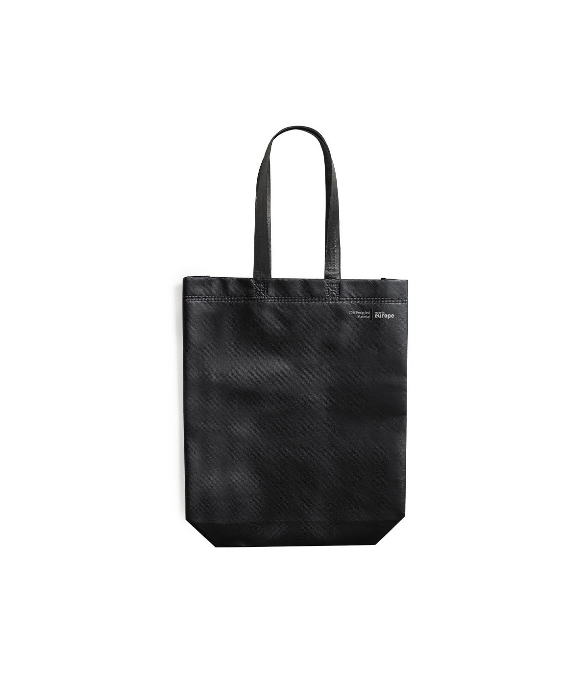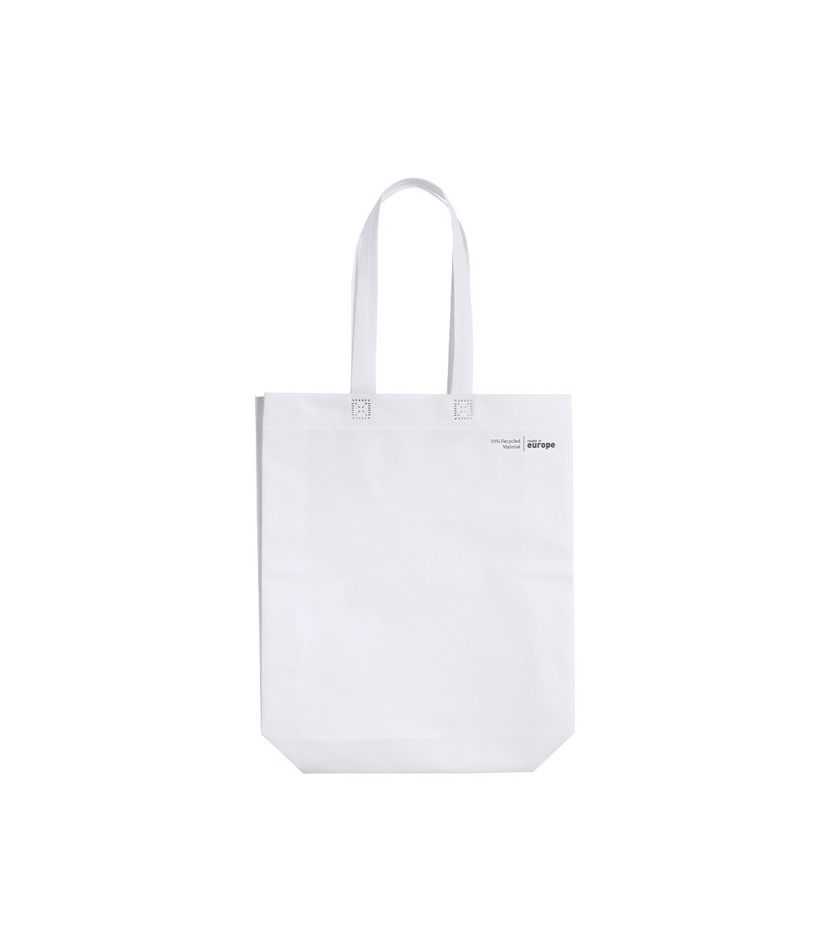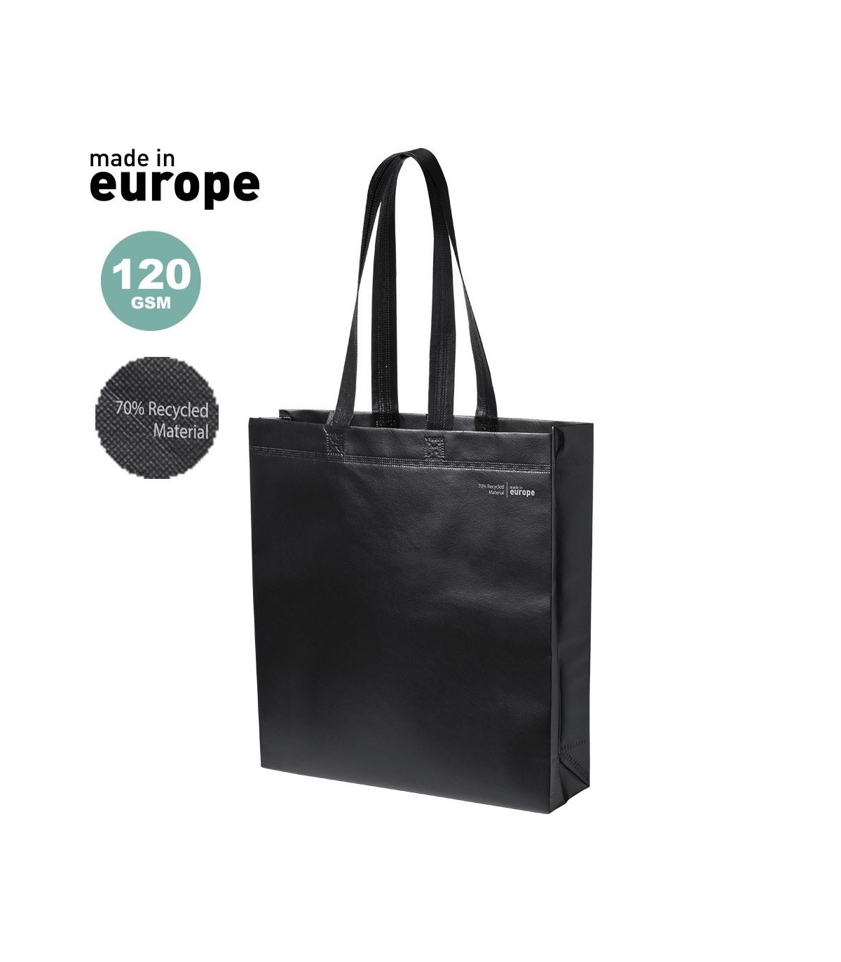 Bolsas de fabricación ecológica, hechas en non-woven laminado reciclado de 120g/m². De fabricación europea, con acabado termosellado, con fuelle, asas largas y distintivo eco/made in sobre la Bolsas.
