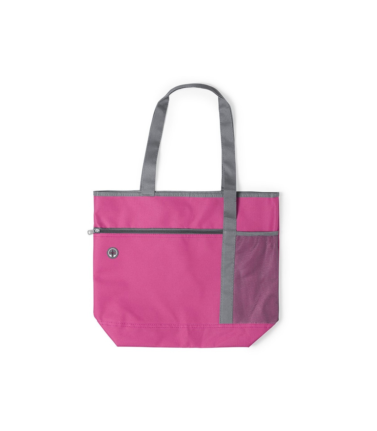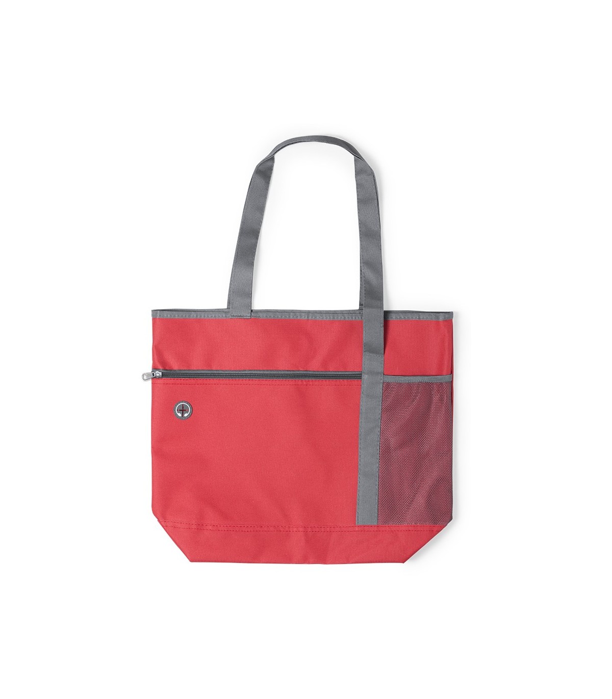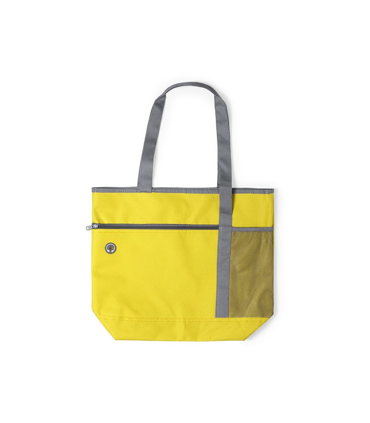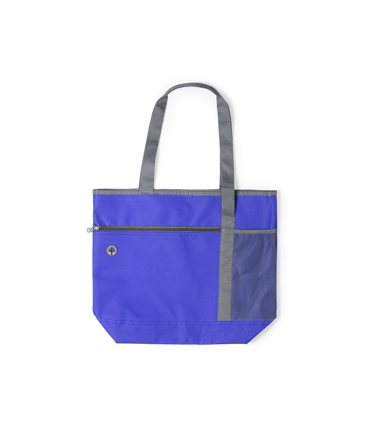Bolsas para la playa personalizadas fabricadas en poliéster 600D en bicolor. Con bolsillo exterior de redecilla, asas largas para hombro, salida de auriculares y fuelle. hasta 7kg de peso.