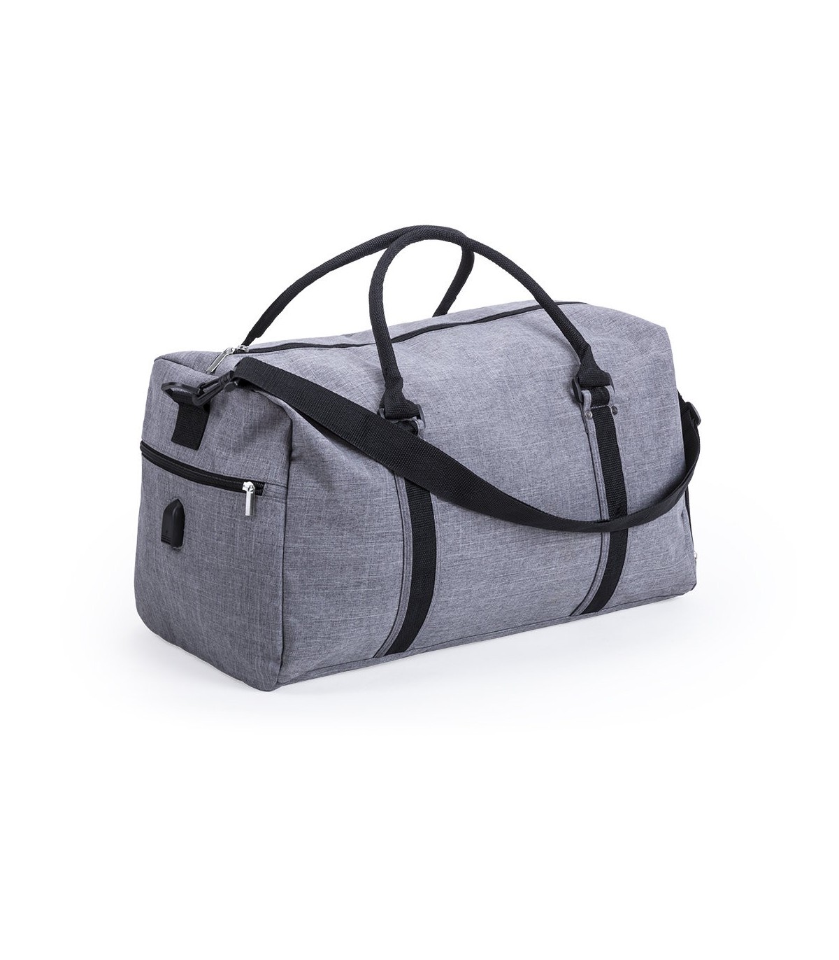 Bolso multiusos en resistente poliéster 600D de acabado denim. Con conexión USB -cable y power bank non incluidos-, compartimento independiente de cierre de cremallera para el calzado y bolsillo lateral de cremallera. Compartimento principal con cierre de cremallera de doble tirador y asas de transporte reforzadas con acolchado. Refuerzo de nylon alrededor del cuerpo y cinta bandolera ajustable de doble cierre de mosquetón.