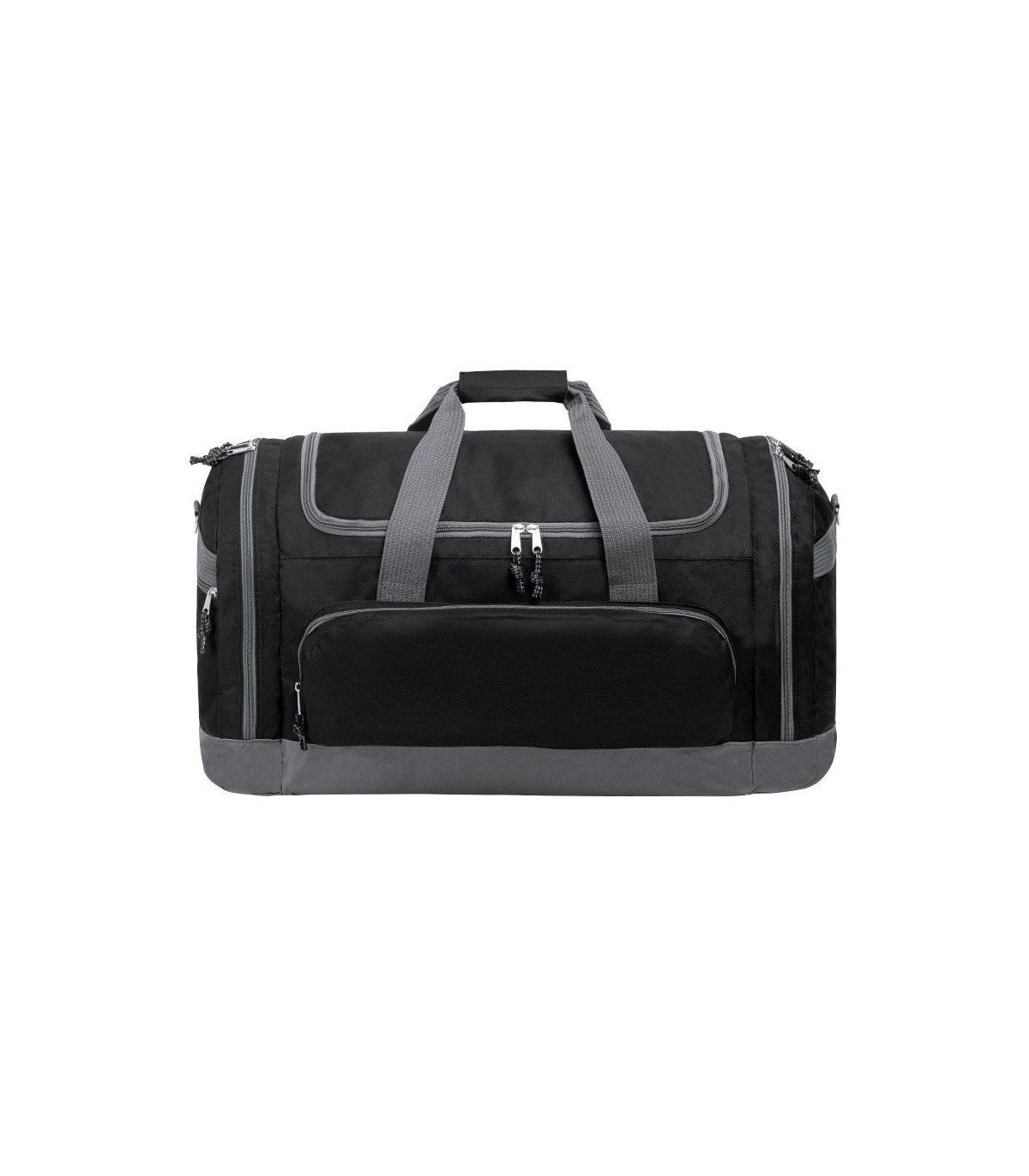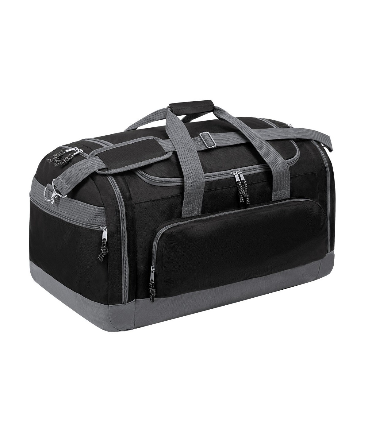 Bolso multiusos de gran capacidad en resistente poliéster 600D. De diseño bicolor, con base y detalles en color gris. Compartimento principal y bolsillos laterales con cierre de cremallera. Resistentes asas de transporte en nylon, con cierre de velcro a juego. Incluye cinta bandolera ajustable con cierre mosquetón y almohadilla de protección para el hombro a juego. Base reforzada.