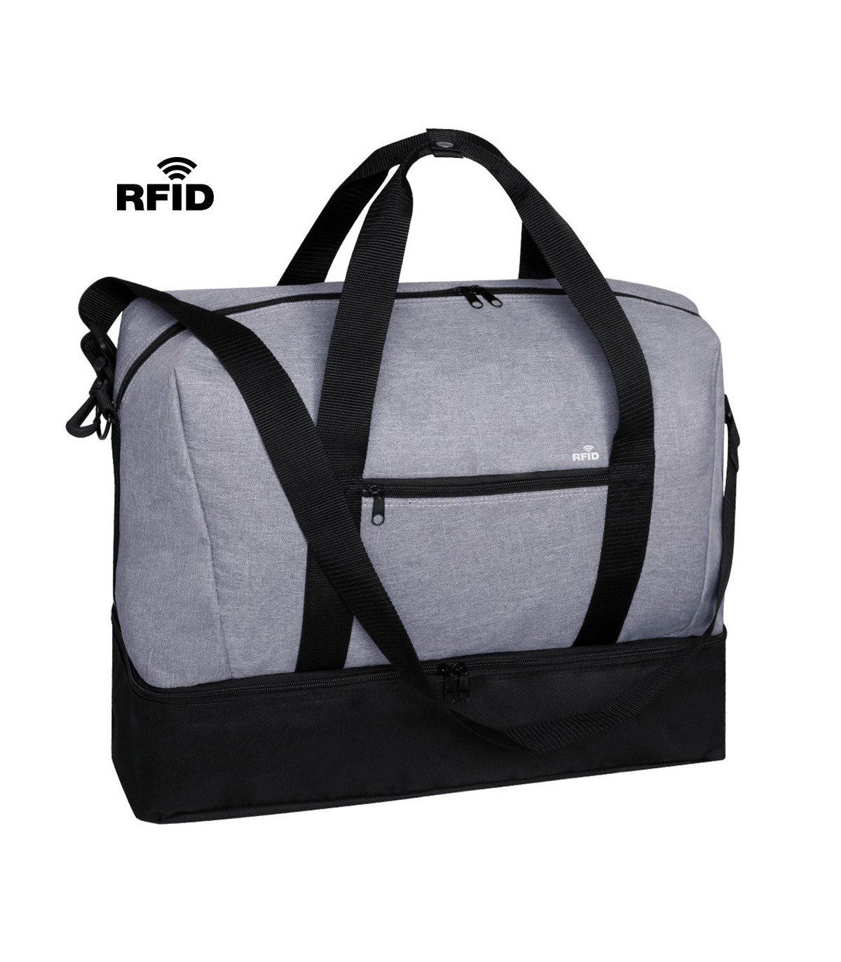 Bolso multiusos en resistente poliéster 600D de acabado denim. De diseño urbano, incluye bolsillo con tecnología de seguridad RFID (Identificación por Radio Frecuencia) que mantiene seguros tus dispositivos de transmisión de identidad. Compartimento independiente de cierre de cremallera para el calzado y bolsillo lateral de cremallera. Compartimento principal con cierre de cremallera de doble tirador y asas de transporte reforzadas, con cierre de botón. Refuerzo de nylon alrededor del cuerpo y cinta bandolera ajustable.