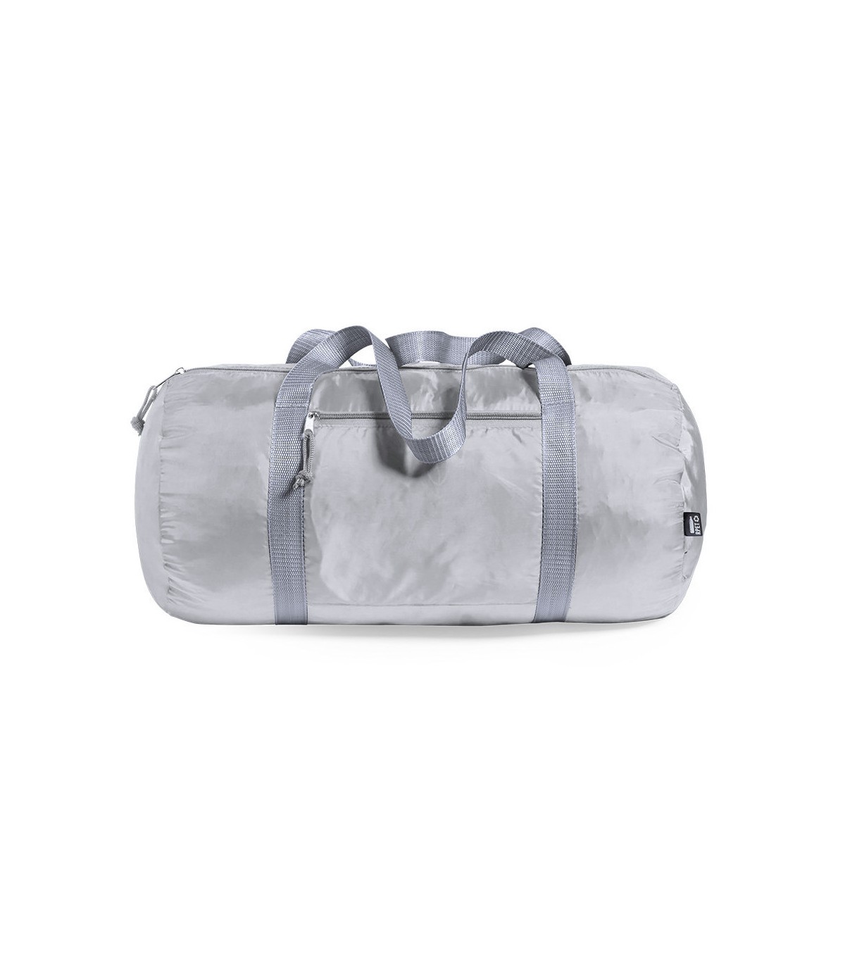 Bolso multiusos en suave poliéster 290T RPET, con bolsillo principal y frontal con cierres de cremallera y tiradores con cuerdas. Resistentes asas de nylon en contraste alrededor del cuerpo en color gris.
