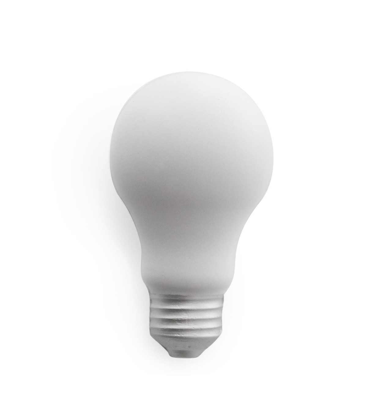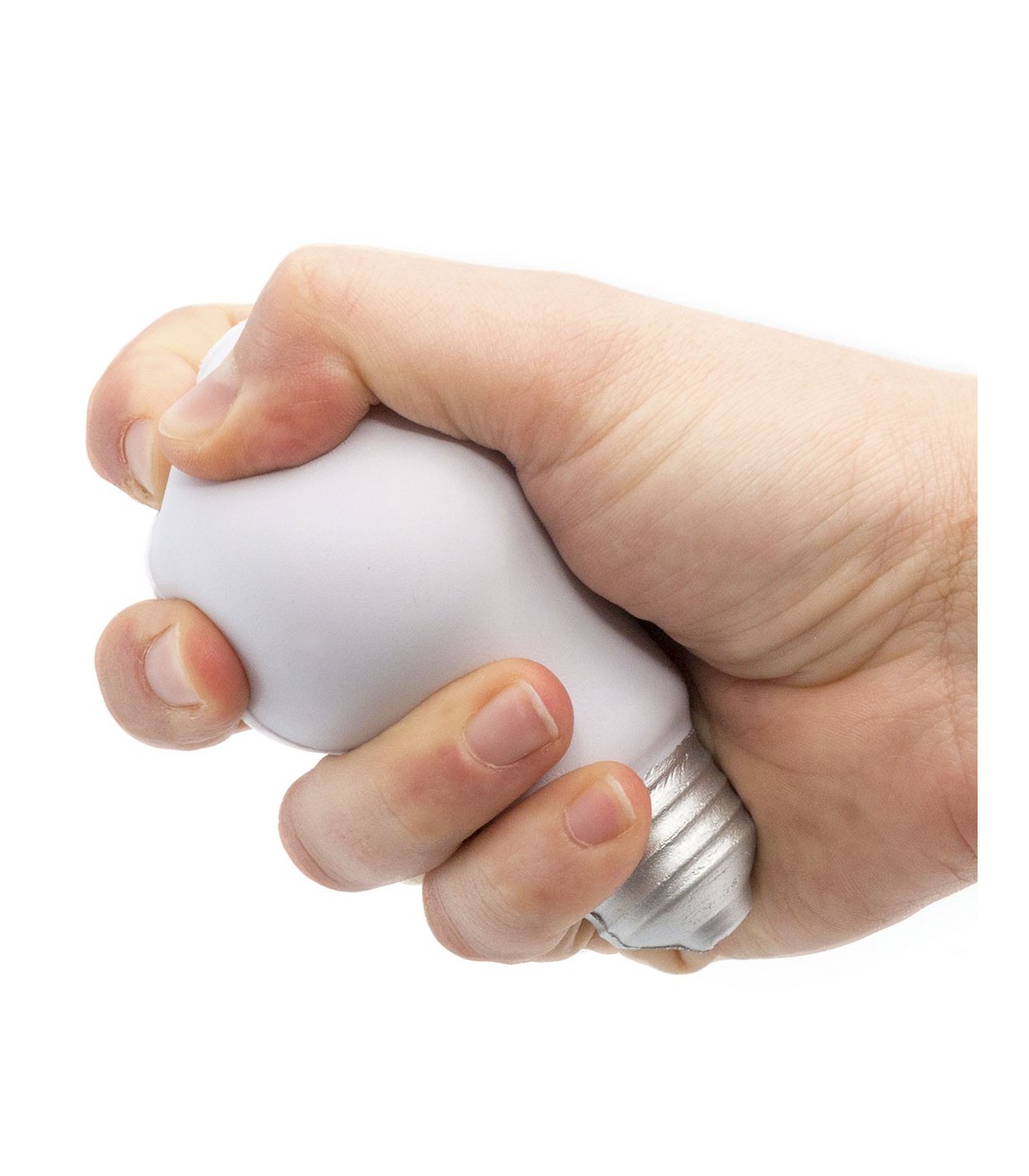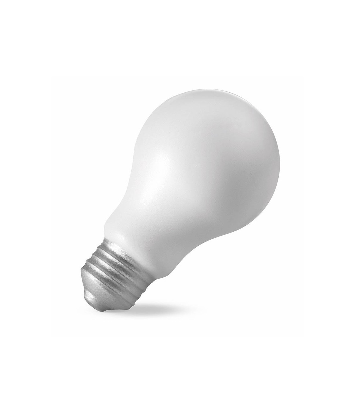 Artículos antiestres personalizados originales en forma de bombilla de colores blanco en el cuerpo y gris, fabricados en poliuretano y marcados con tu logo.