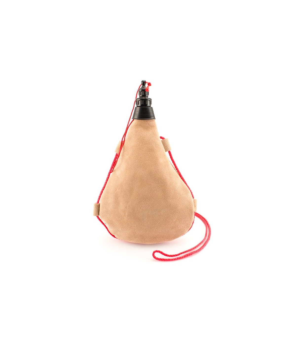 Bota de vino de 1l de capacidad en piel de serraje. Con tapón de seguridad a rosca y cinta bandolera. Homologada para uso alimentario.