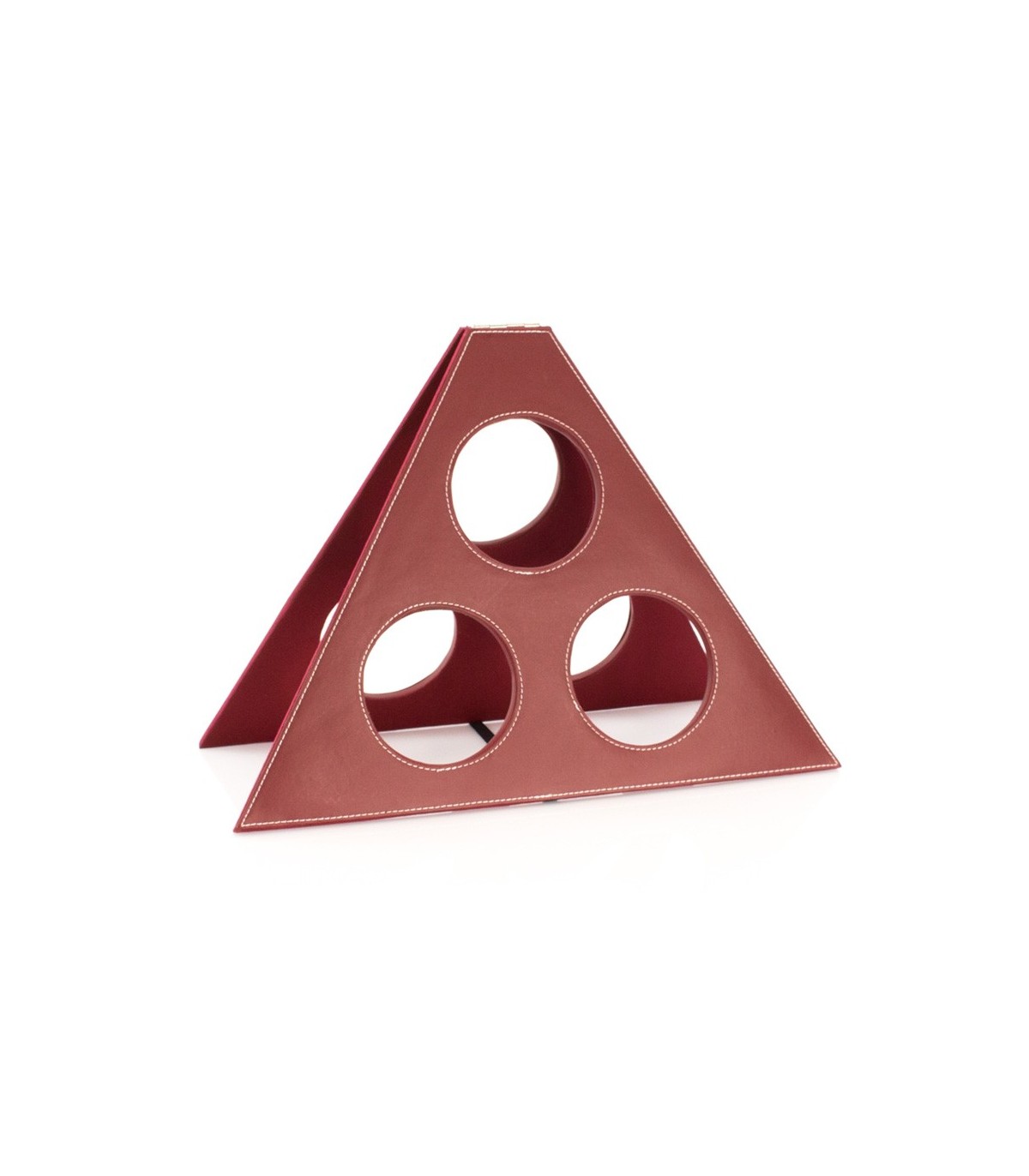 Botellero plegable con capacidad para 3 botellas en elegante polipiel de sobrios colores rosado y tinto. Con pespuntes de refuerzo en color blanco.