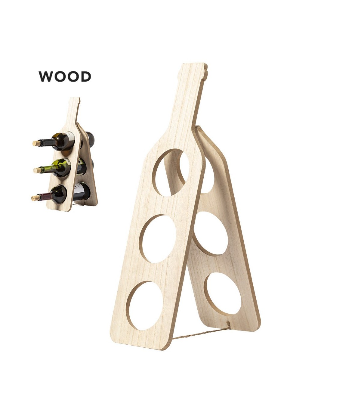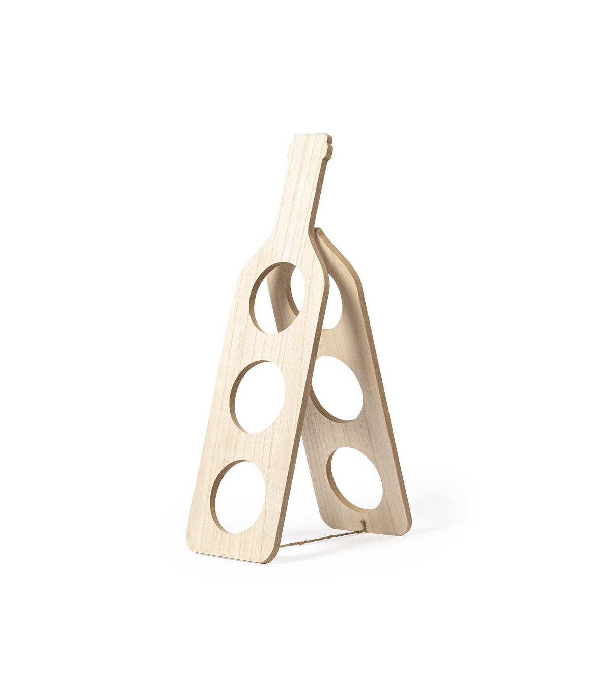 Botelleros plegables en forma de botella y fabricado en madera. Con capacidad para 3 botellas de 75cl y presentado en atractiva caja de diseño.