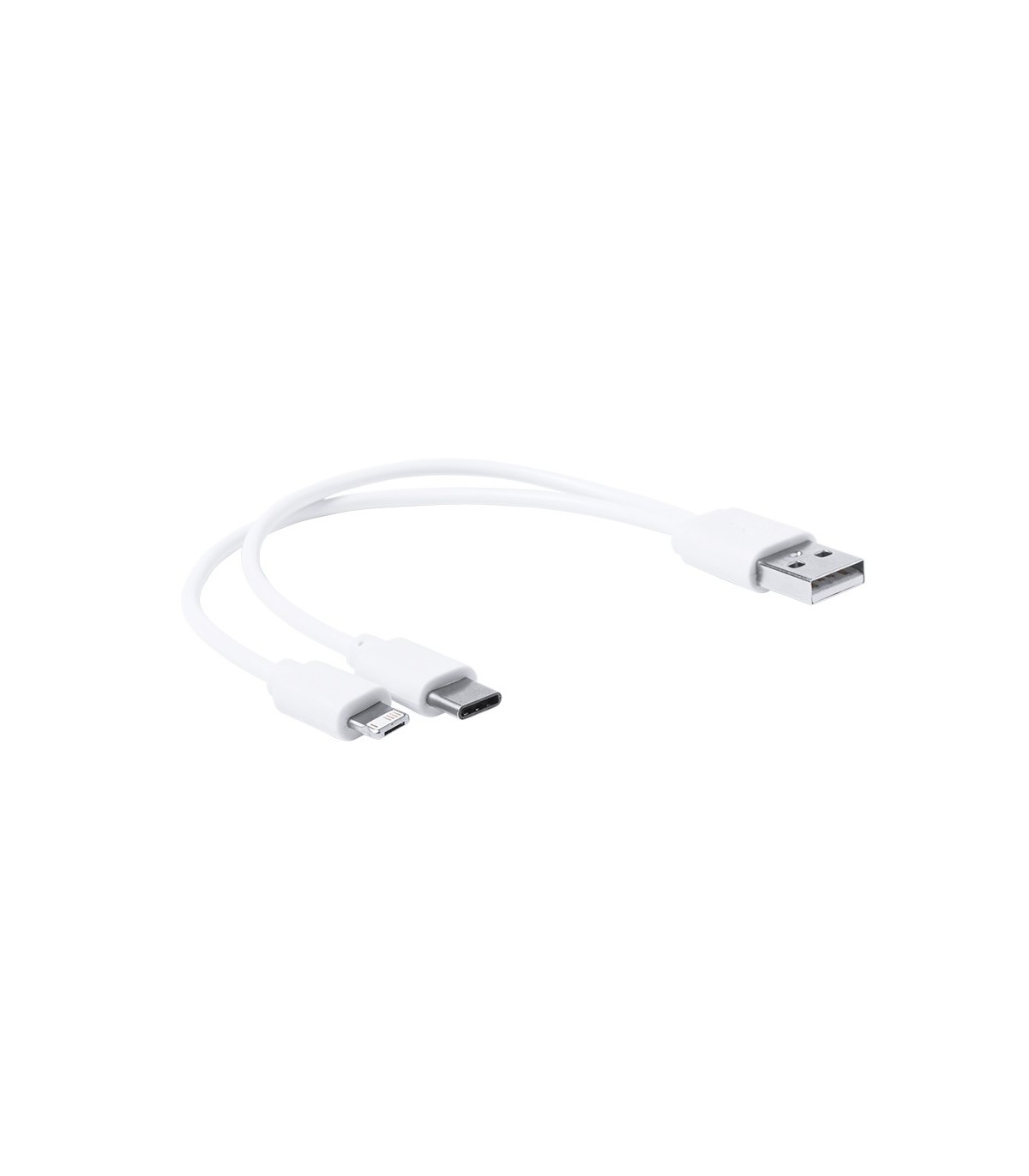 Cable cargador USB con conexiones tipo C y dual micro USB/Lightning, personalizados para regalos promocionales de empresas.