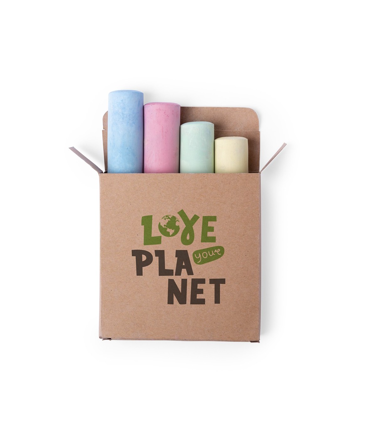 Caja de tizas tamaño XL. Estuche en cartón reciclado, con 4 tizas en colores azul, rojizo, verde y amarillo.