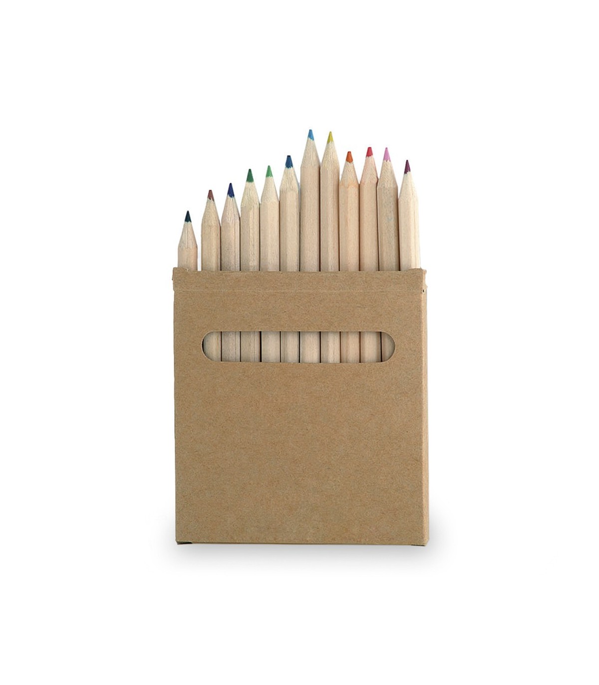 Set de 12 lápices en caja de cartón natural con ventana. Lápices de madera con cuerpo hexagonal de acabado natural y minas en diversa gama de colores.