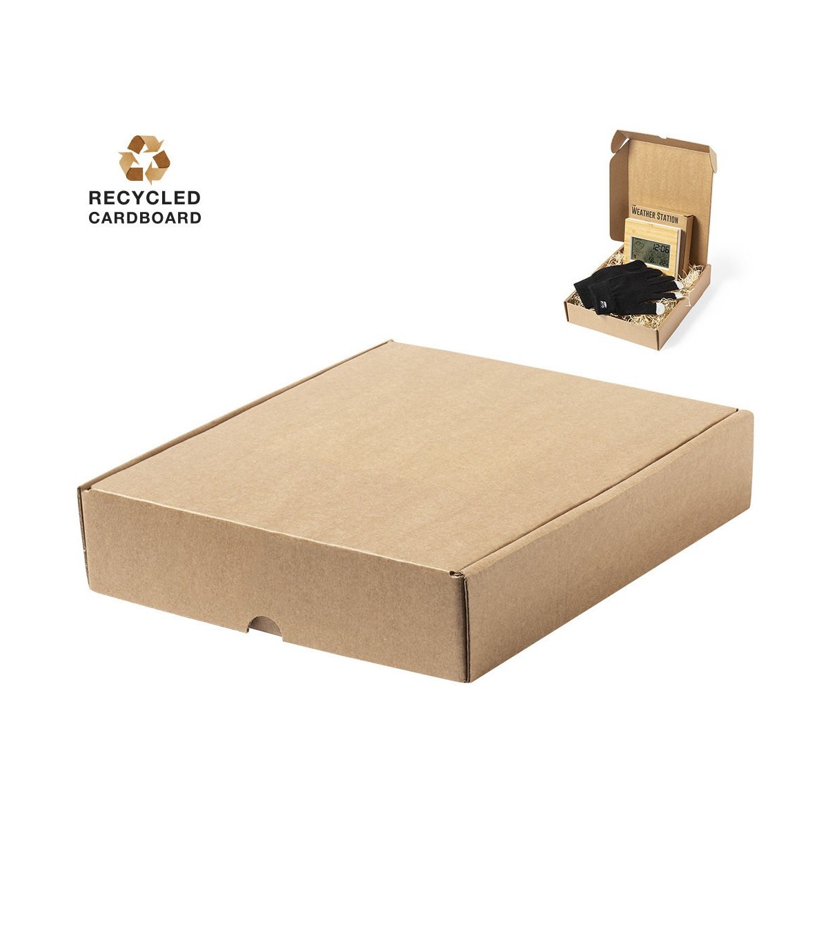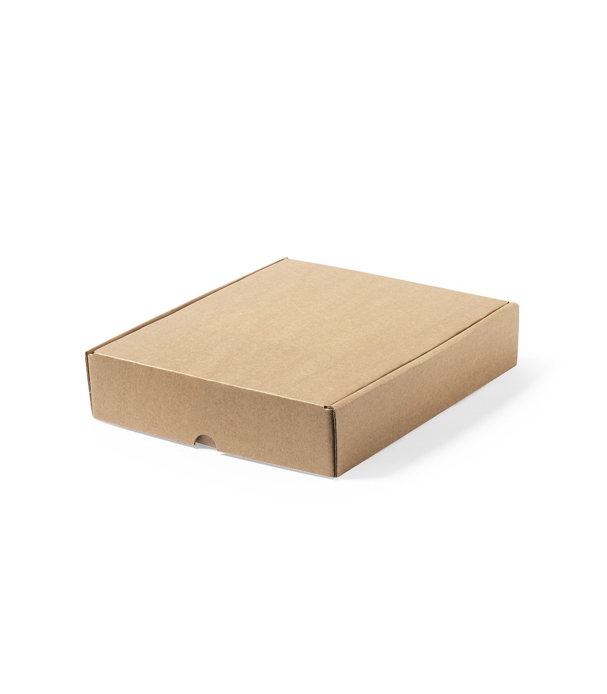 Caja de presentación tamaño mediano elaborado en cartón reciclado corrugado. De acabado kraft. En línea con la tendencia del mercado hacia la sostenibilidad integral del regalo, ofreciendo soluciones de origen reciclado con el fin de ayudar a la mejora y conservación de nuestro planeta.