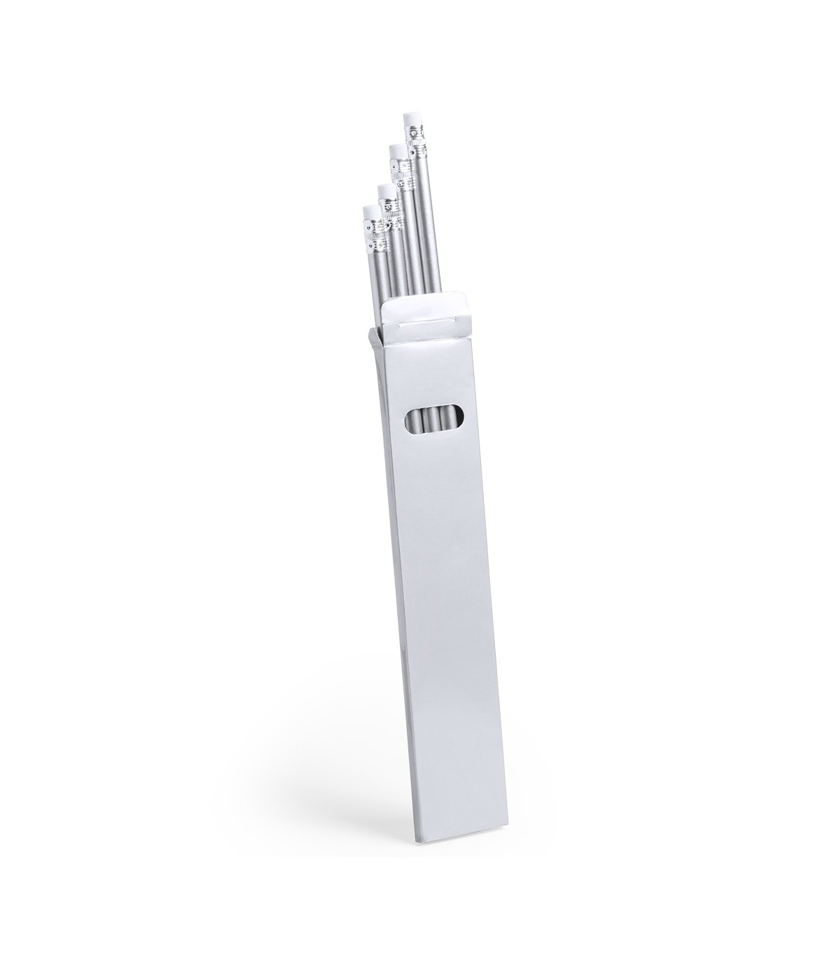 Set de 5 lápices en elegante caja de cartón con ventana y de acabado plateado brillante. Lápices en madera con acabado en color plateado brillante, mina negra y goma de borrar.