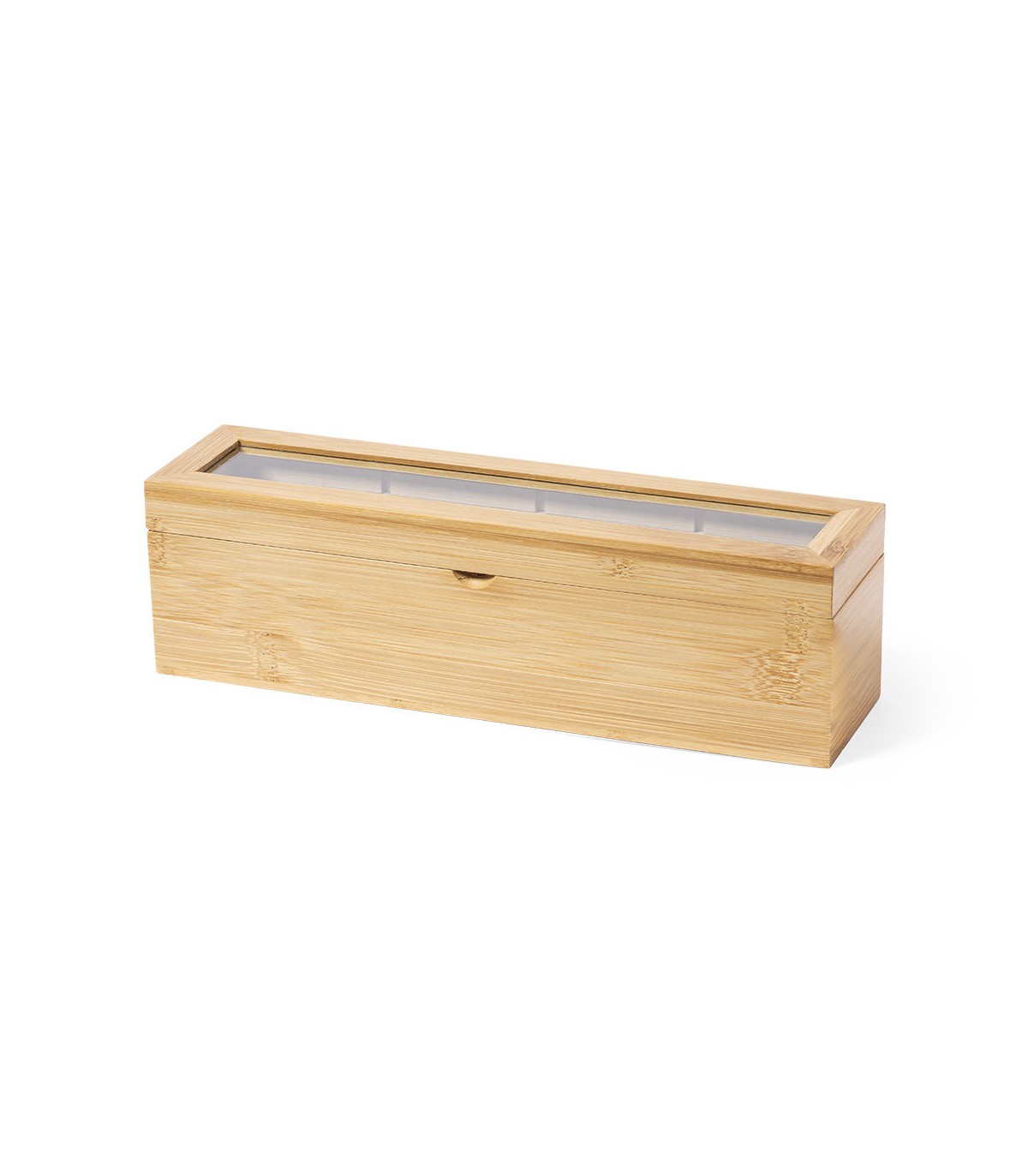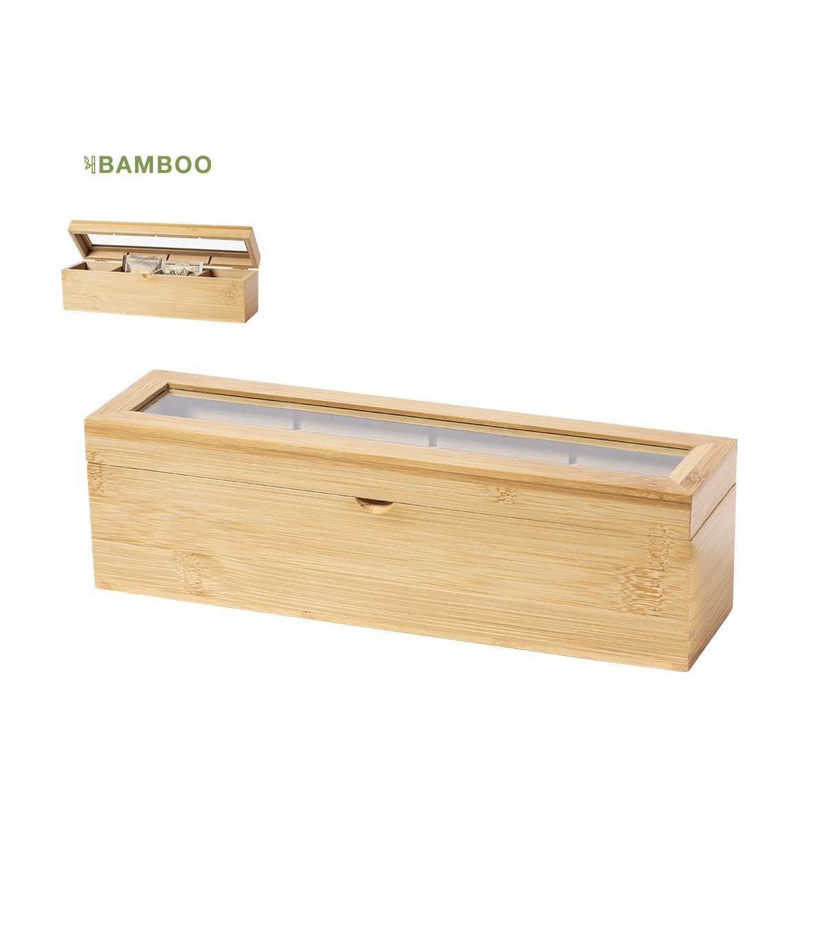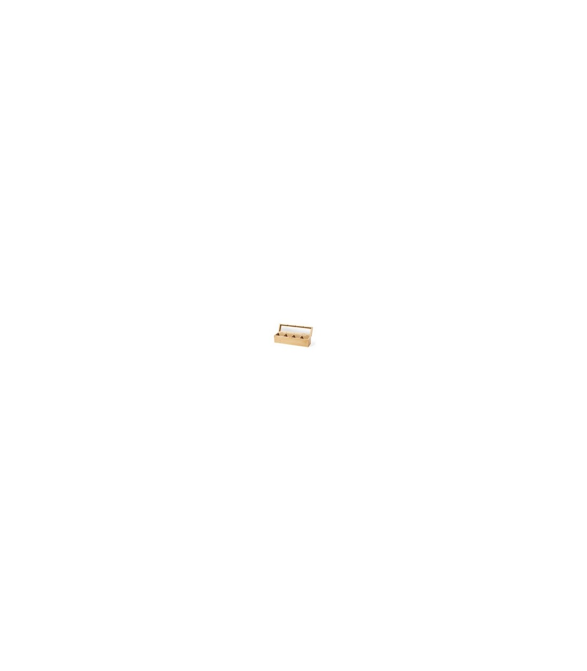Caja para té de fabricación ecológica, elaborada en bambú, con cristal en tapa. Incluye 4 compartimentos para almacenar distintos tipos de té. Presentada en atractiva caja de diseño eco.