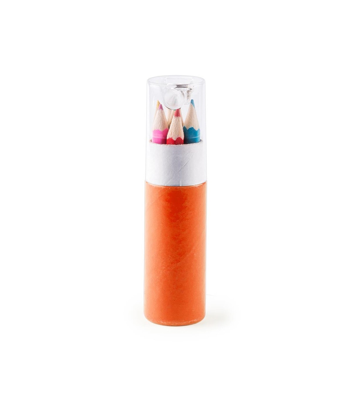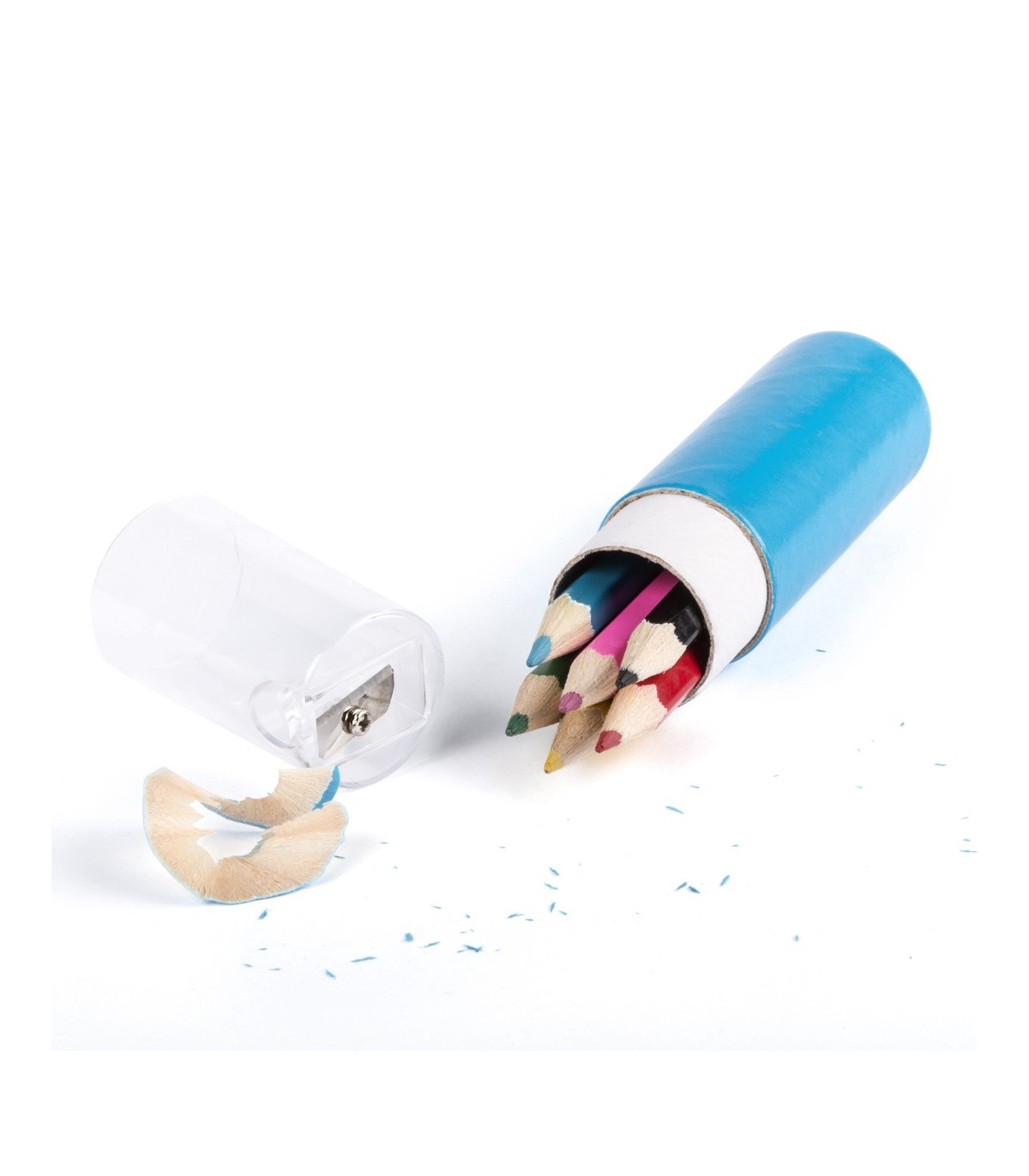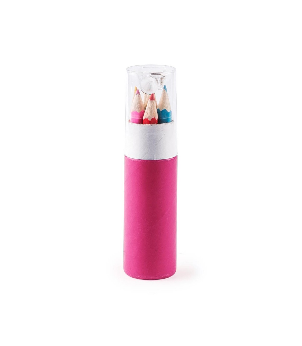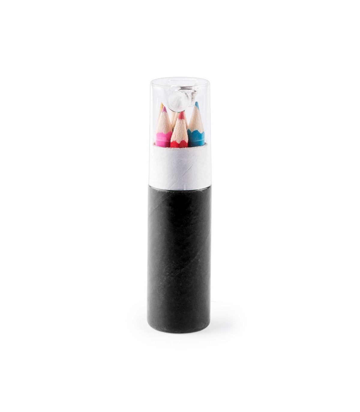Set de 6 lápices de madera con cuerpo hexagonal de acabado brillante y minas en colores azul, rosa, negro, rojo, amarillo y verde. Con sacapuntas integrado en la capucha y presentado en estuche de cartón de llamativos colores.