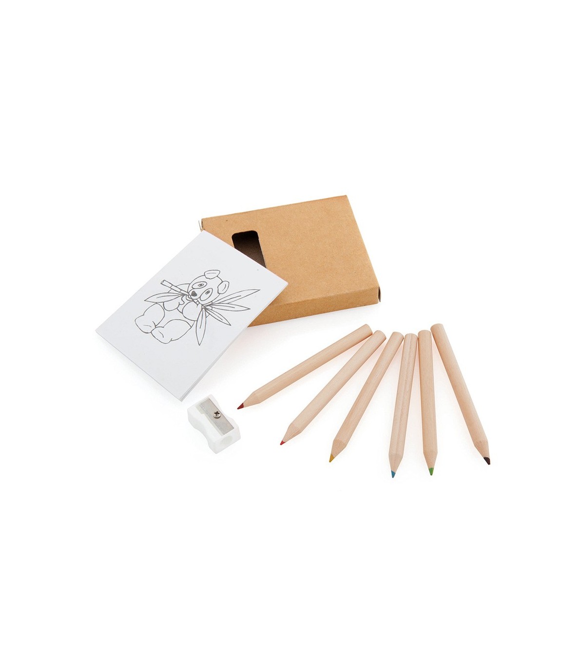 Set de 8 piezas en caja de cartón de acabado natural con ventana. Incluye bloc con dibujos para colorear, sacapuntas y 6 lápices de madera con cuerpo cilíndrico y minas en variados colores.