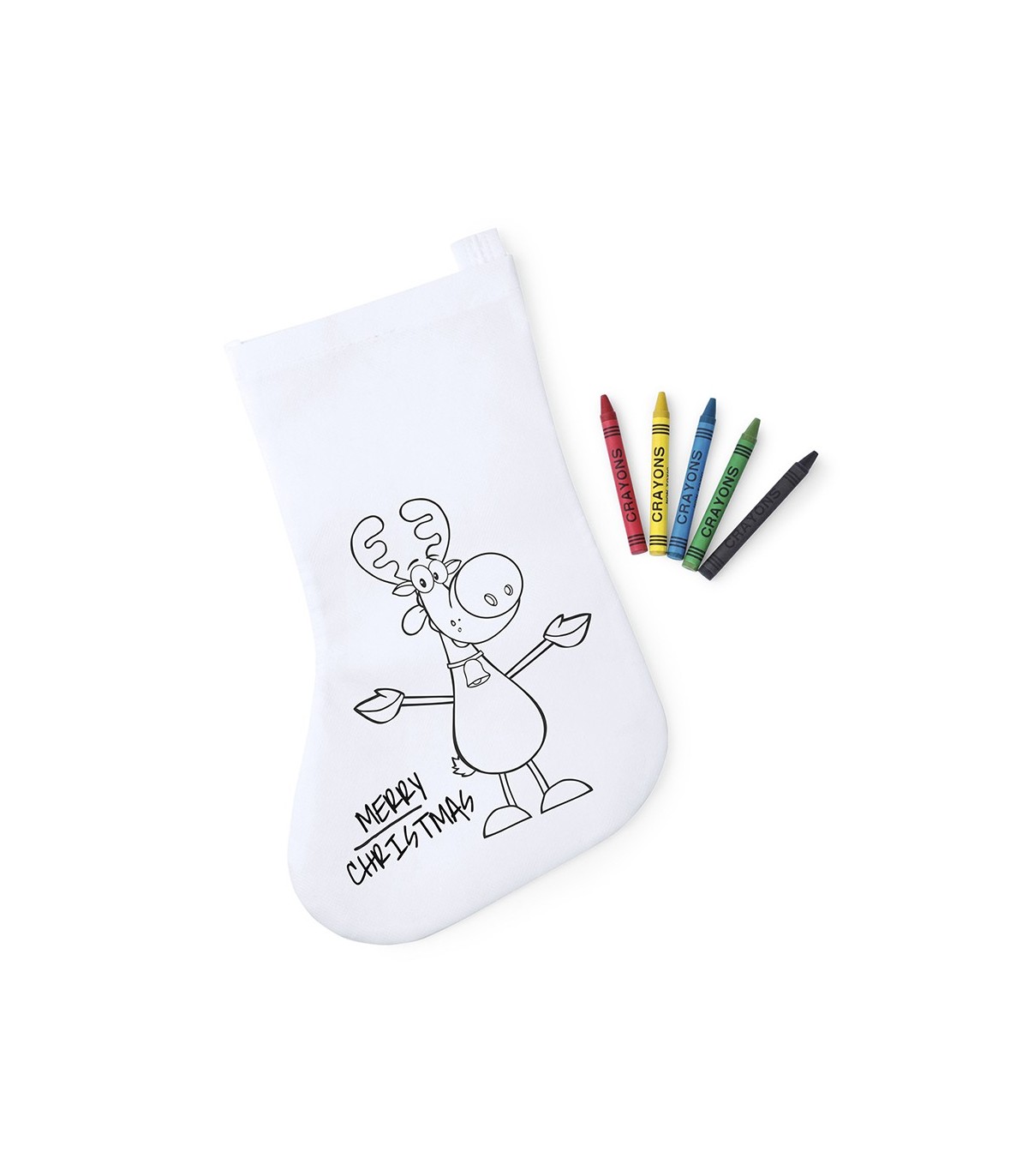 Llamativo calcetín de colgar fabricado en tela con diseño de reno en el frontal para colorear con ceras de colores incluidas, para regalos infantiles de empresa.