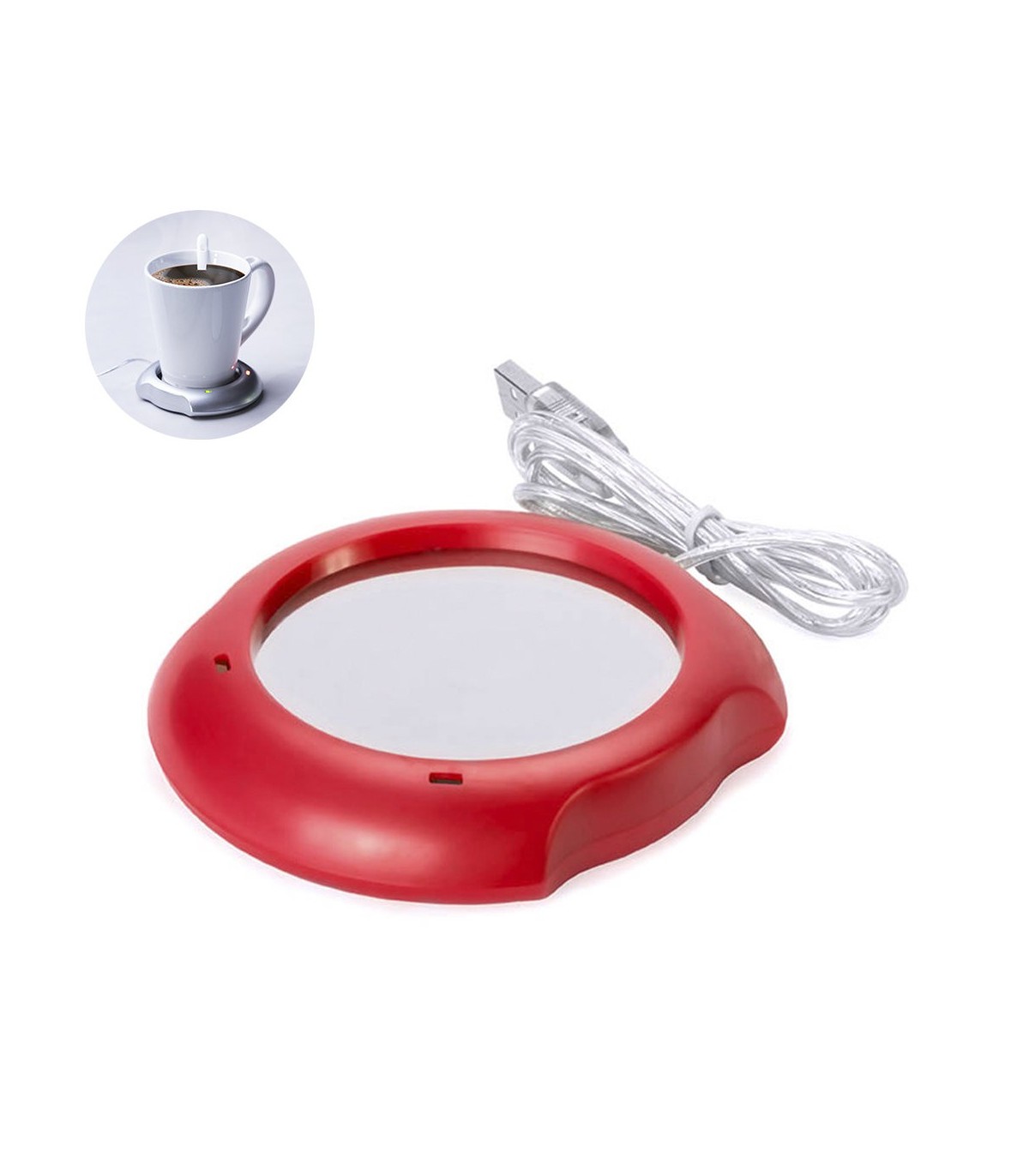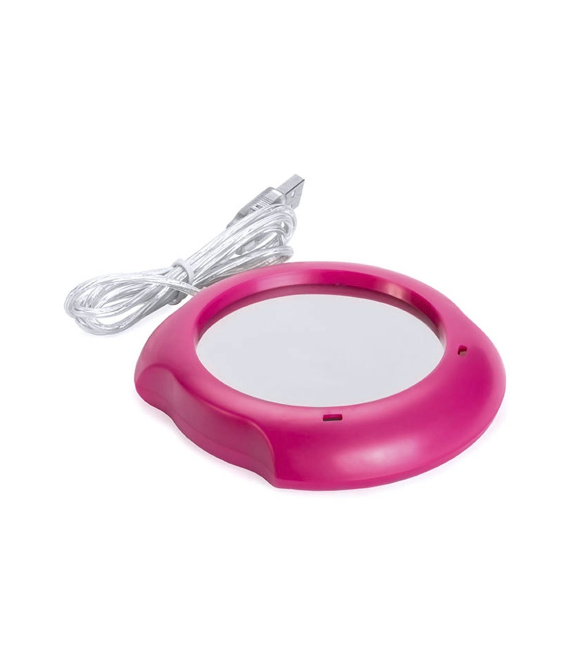 calentador de tazas con conexión usb que pude ir conectado a la corriente eléctrica o al ordenador, ideal para regalos de oficina promocionales.