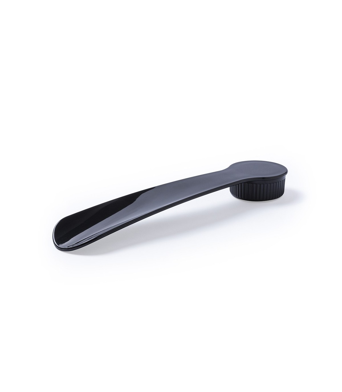 Calzador 2 en 1 en sobrios colores. Con esponja limpiadora de zapatos integrada y tapón con cierre de rosca.