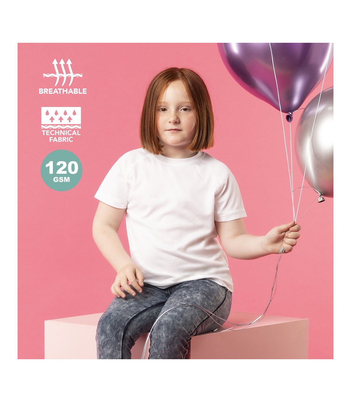 Camiseta para niño en material 100% poliéster de 120g/m2 con tratamiento refrigerante SoftCool Extreme. Disponible en color blanco y en tallas 4-5, 6-8, 10-12.