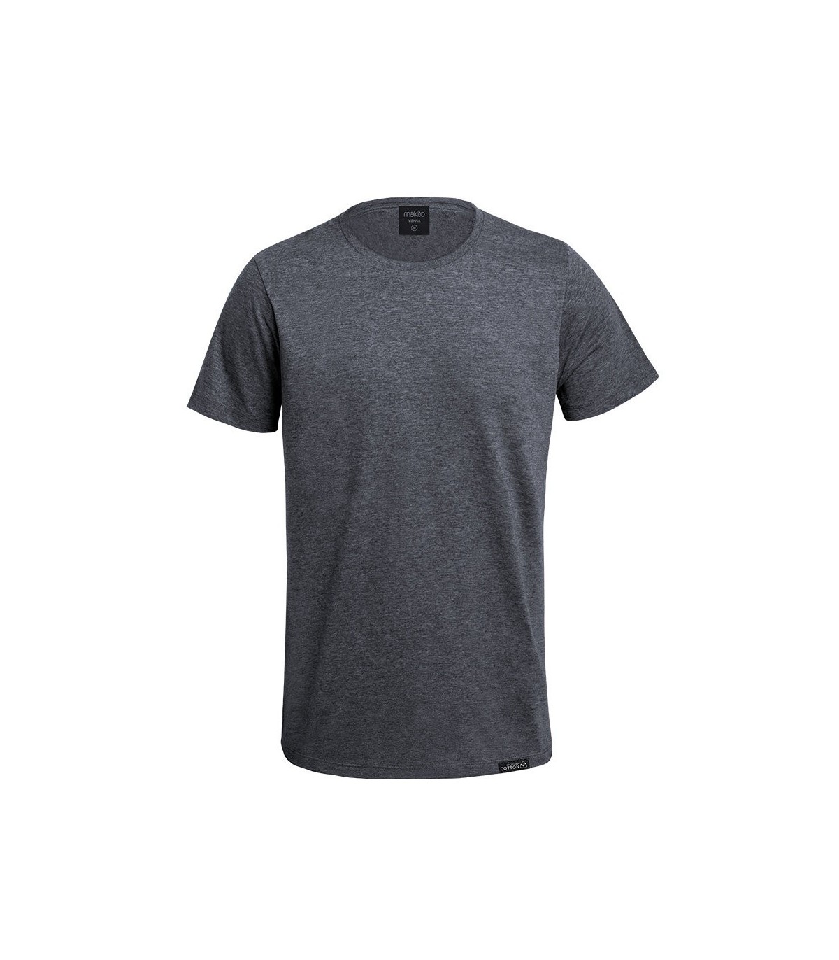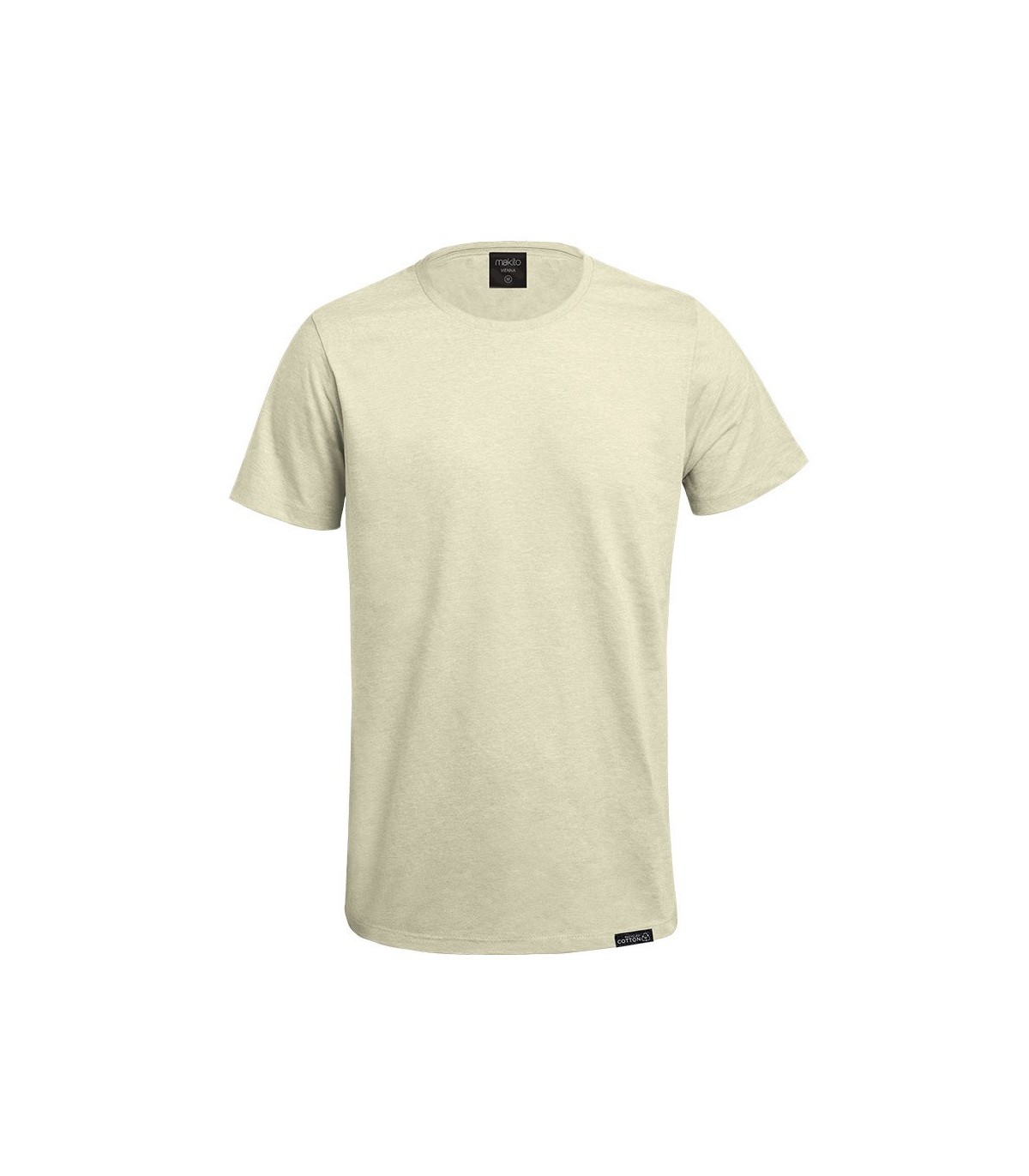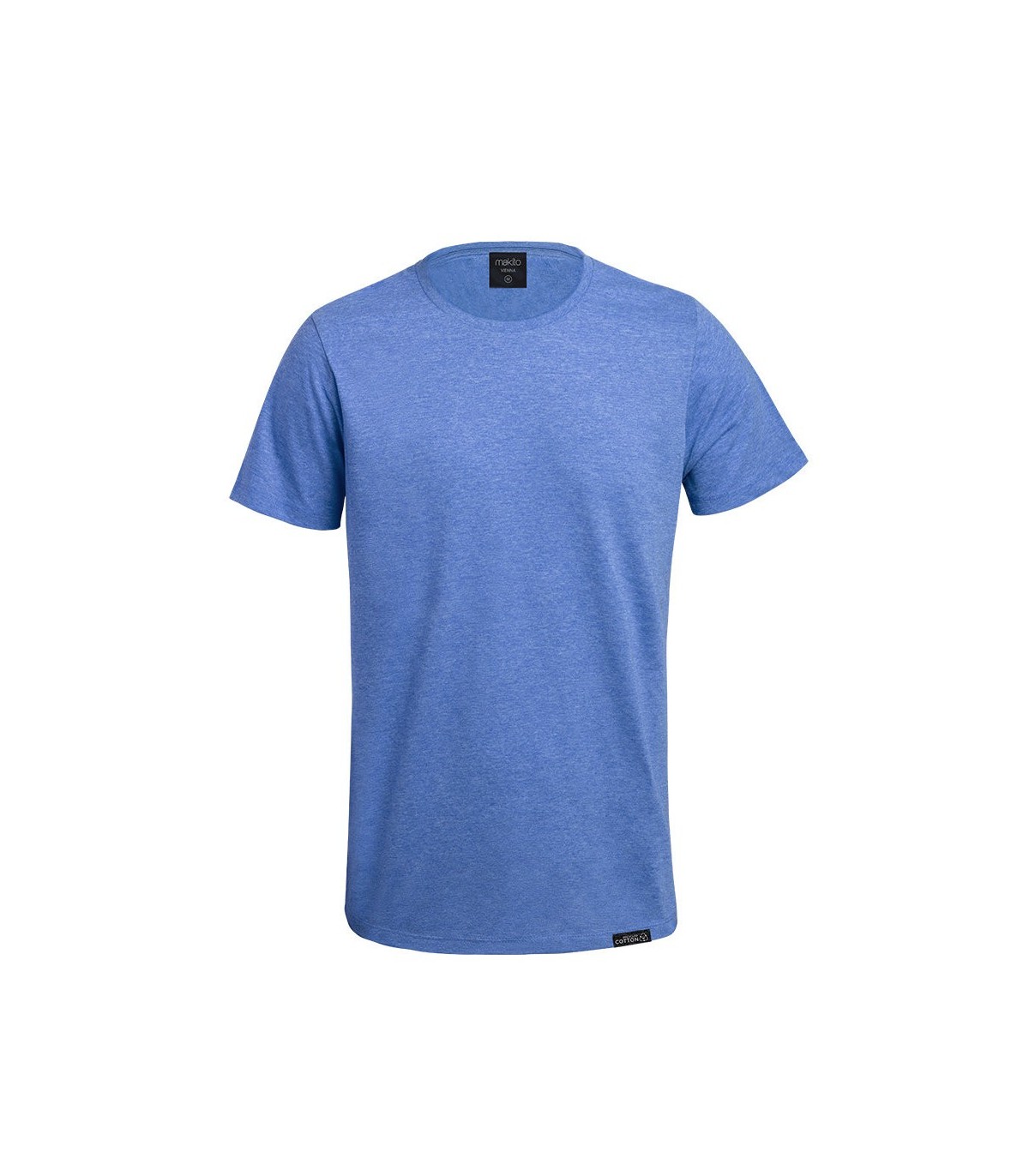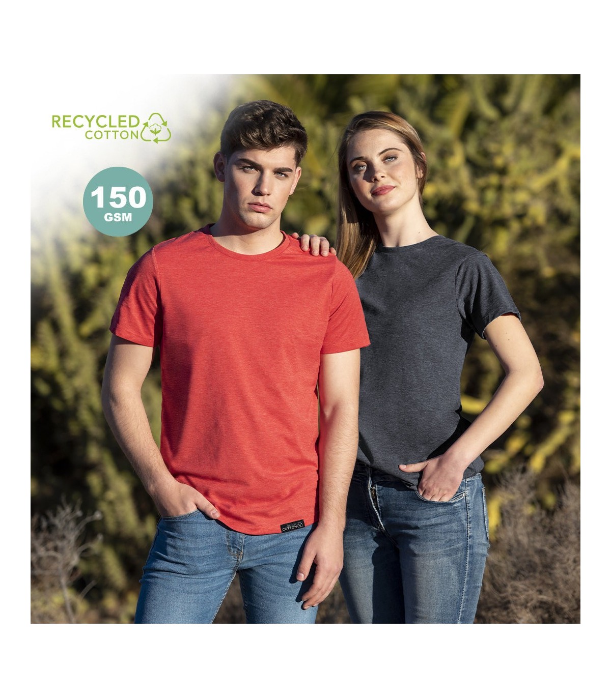 Camiseta unisex para adulto. Hecha en 100% algodón reciclado con efecto jaspeado de 150g/m2 y disponible en colores natural, negro, rojo y azul. Disponible en tallas S, M, L, XL, XXL.