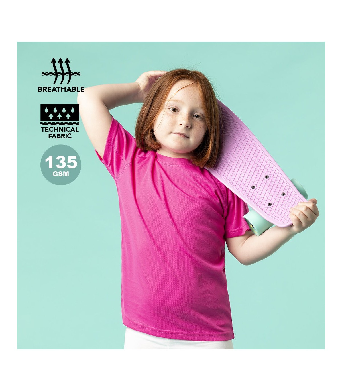 Camiseta técnica para niño en material 100% poliéster transpirable de 135g/m². Disponible en originales colores para imprimir con tu diseño y en tallas 4-5, 6-8, 10-12.