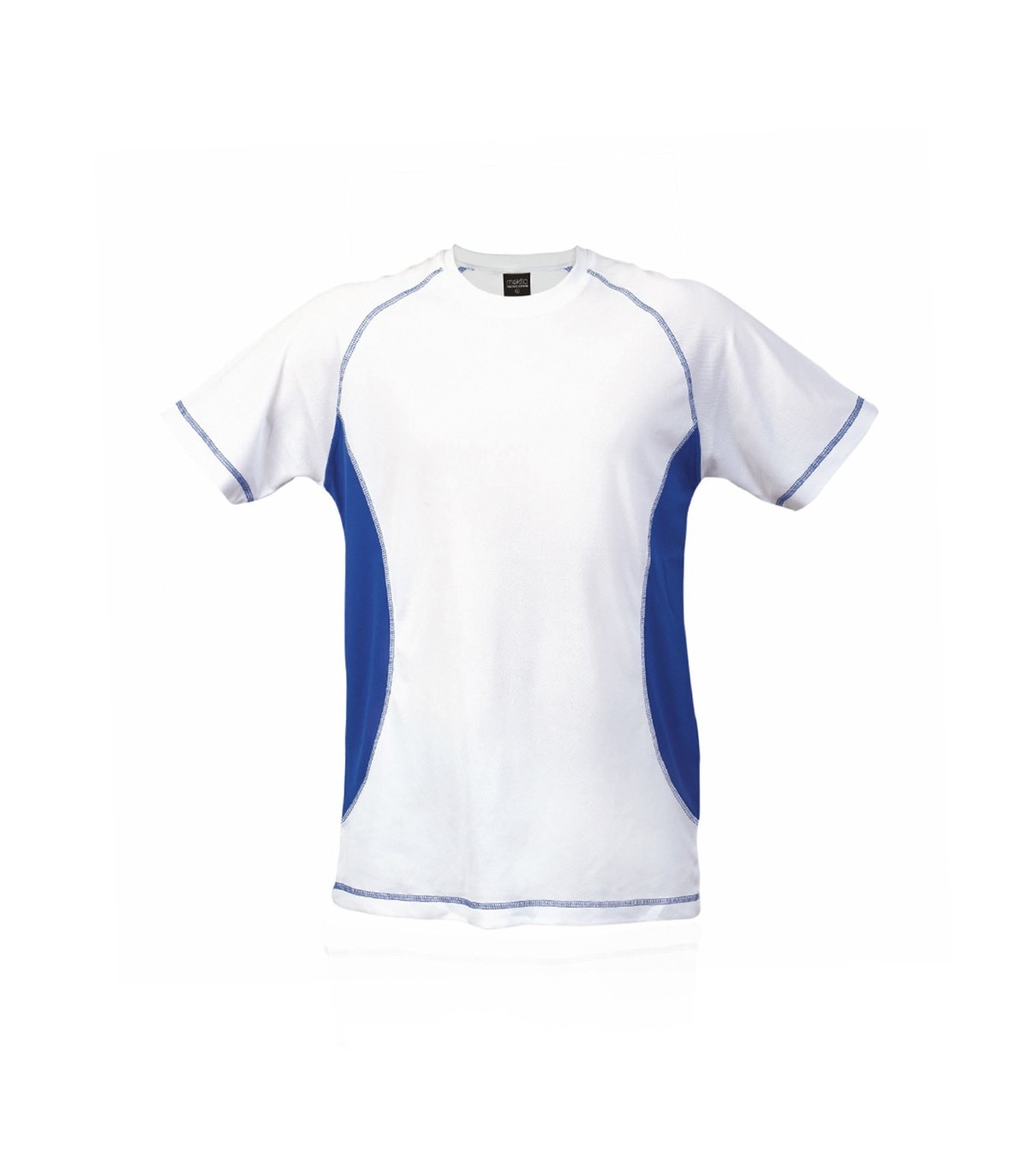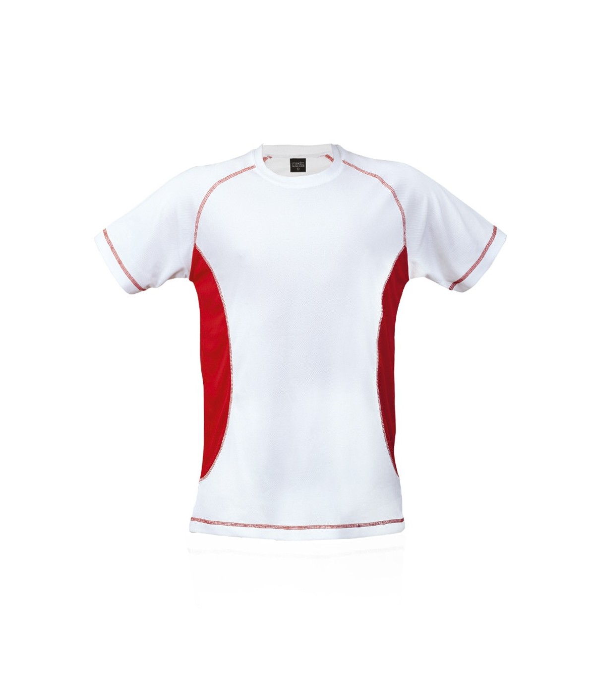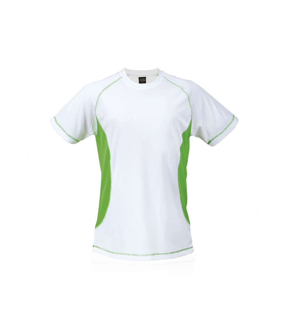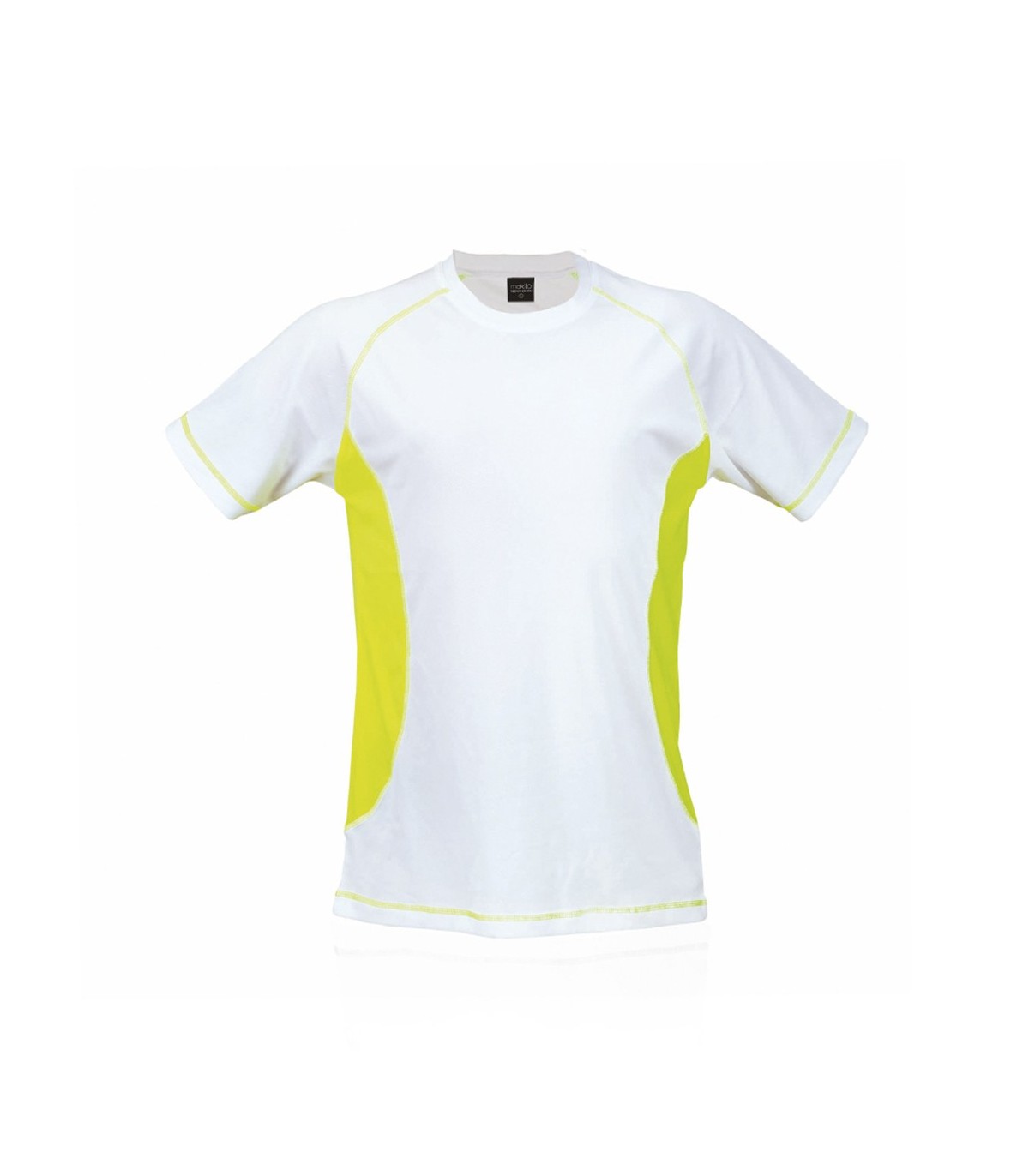 Camiseta técnica para adulto en material 100% poliéster transpirable de 135g/m². Diseño en color blanco con costuras de refuerzo y laterales en vivos colores. Disponible en tallas S, M, L, XL, XXL.