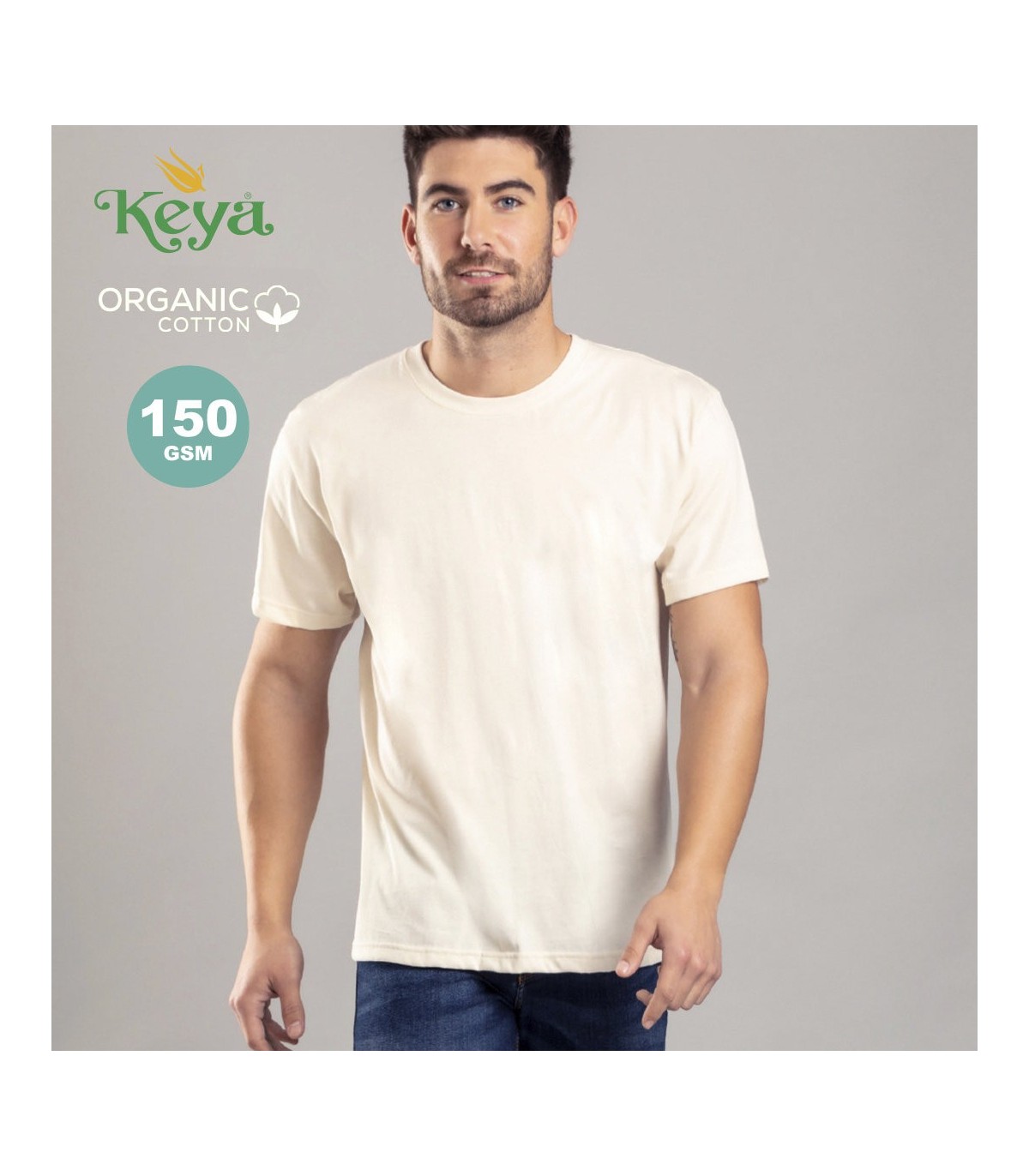 Camiseta para adulto Keya Organic MC 150. En material 100% algodón orgánico, single jersey de 150g/m2. En color natural y en tallas S, M, L, XL, XXL. Distintivo organic en etiqueta.
