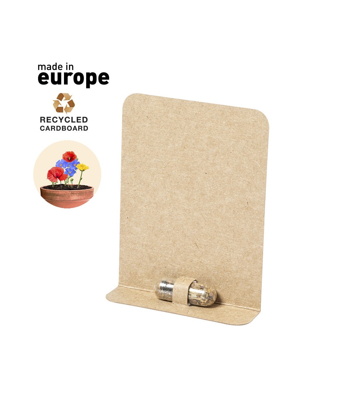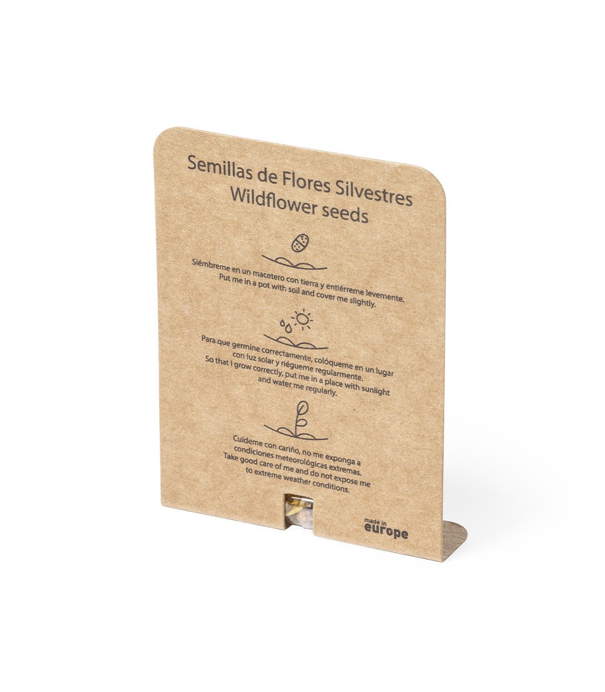 Cápsula de semillas para regalos de empresas, presentada en estuche de cartón reciclado con instrucciones de plantado y distintivo Made in Europe. Flores silvestres en colores surtidos.