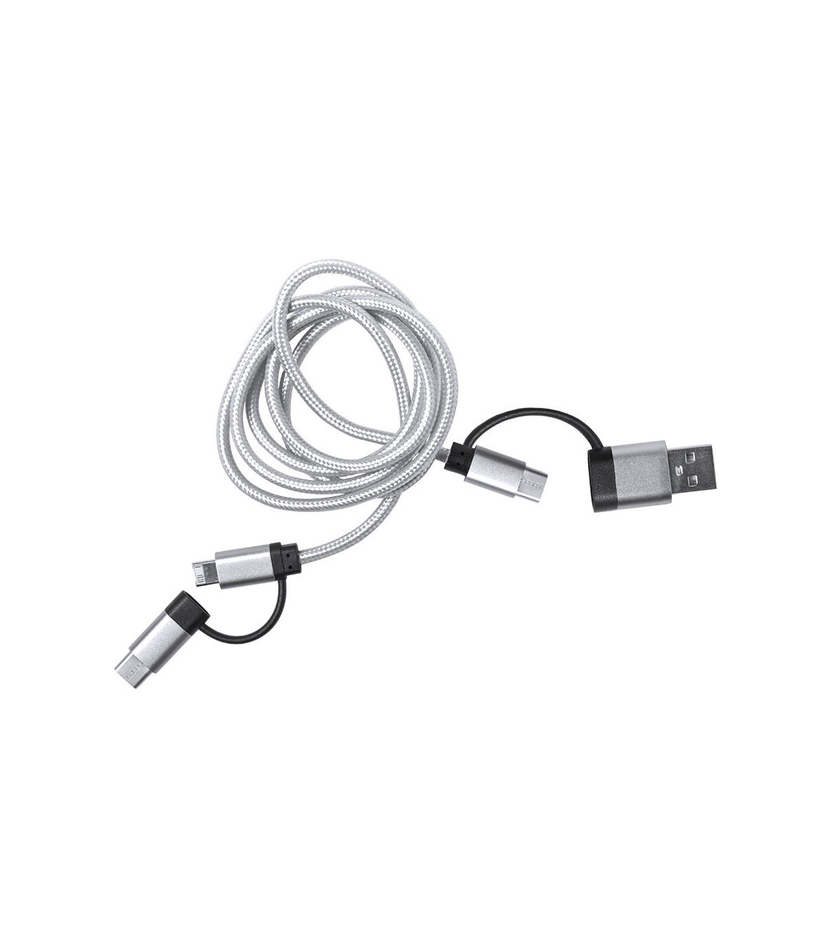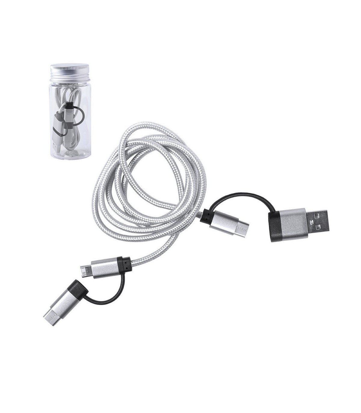 Cable cargador con conexión dual micro USB/Lightning y tipo C (entrada y salida). De 100cm de longitud, con conectores de aluminio y especialmente diseñado para marcaje en láser. Presentado en atractivo bote transparente con tapa a rosca.