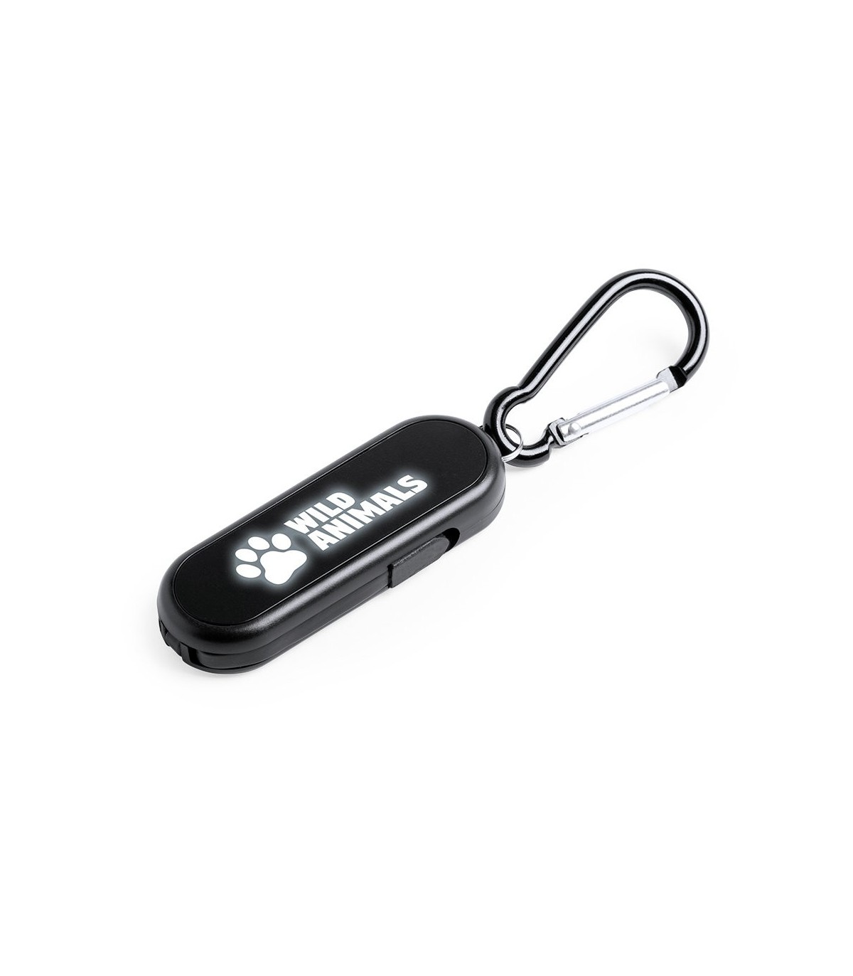 Cargador con mosquetón de aluminio y cuerpo en plástico ABS, de tamaño compacto y portable. Con mosquetón a juego de transporte, conexiones micro USB, Tipo C y Lightning. En elegante color negro, con luz led interior y un recubrimiento exterior especialmente diseñado para marcaje en láser, con el que conseguirá que su publicidad o marca quede iluminada con luz blanca. Presentado en bolsa auto cierre de diseño.