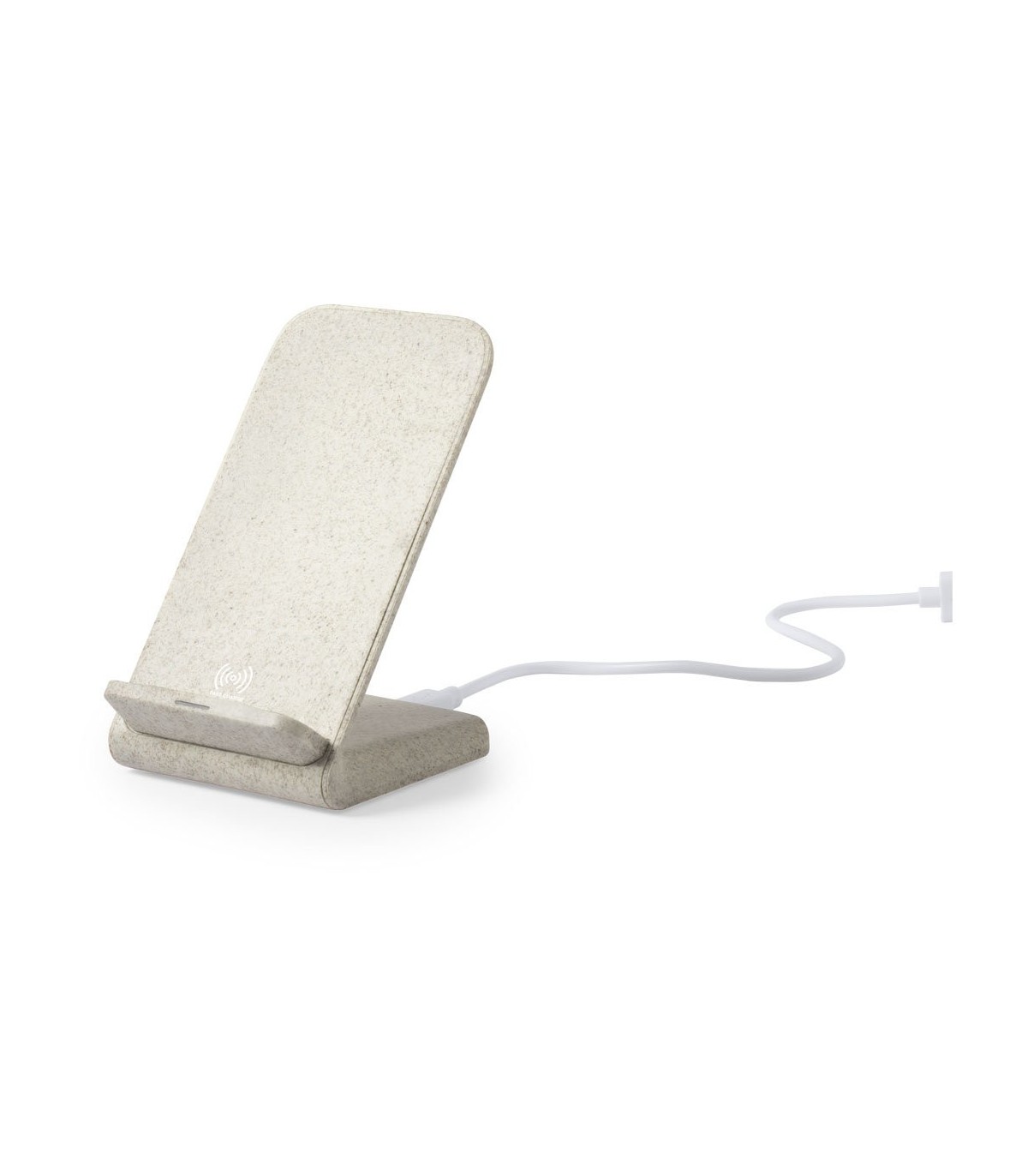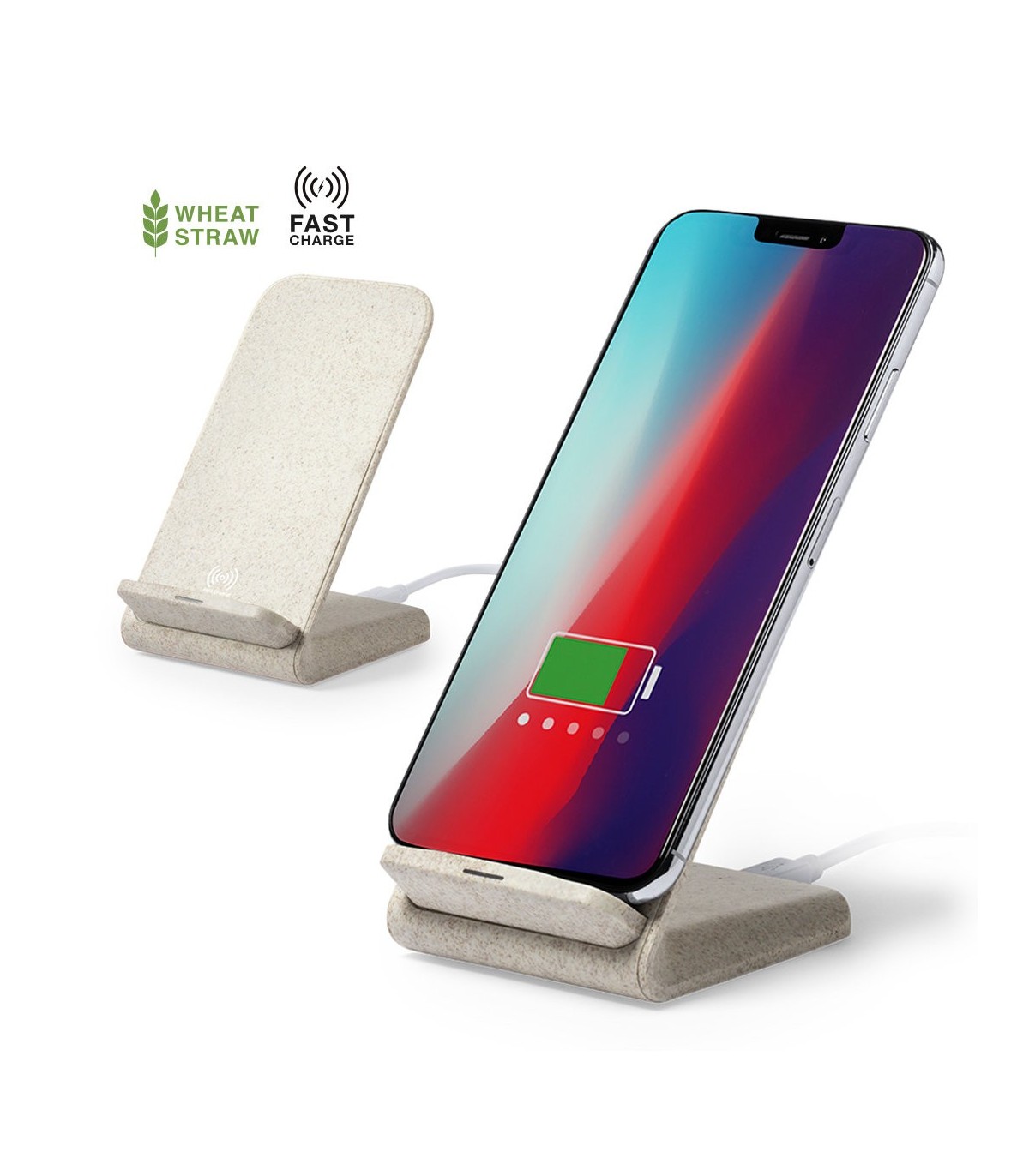 Cargador inalámbrico de línea ecológica con función soporte para móvil. Carcasa en caña de trigo, para así fomentar la utilización de materias primas naturales y reducir las emisiones contaminantes. Con función carga rápida de 10W y compatible con dispositivos equipados con tecnología de carga inalámbrica. Con luz indicadora de estado de carga y cable de 100 cm. Amplia superficie de marcaje, presentado en atractiva caja de diseño eco.