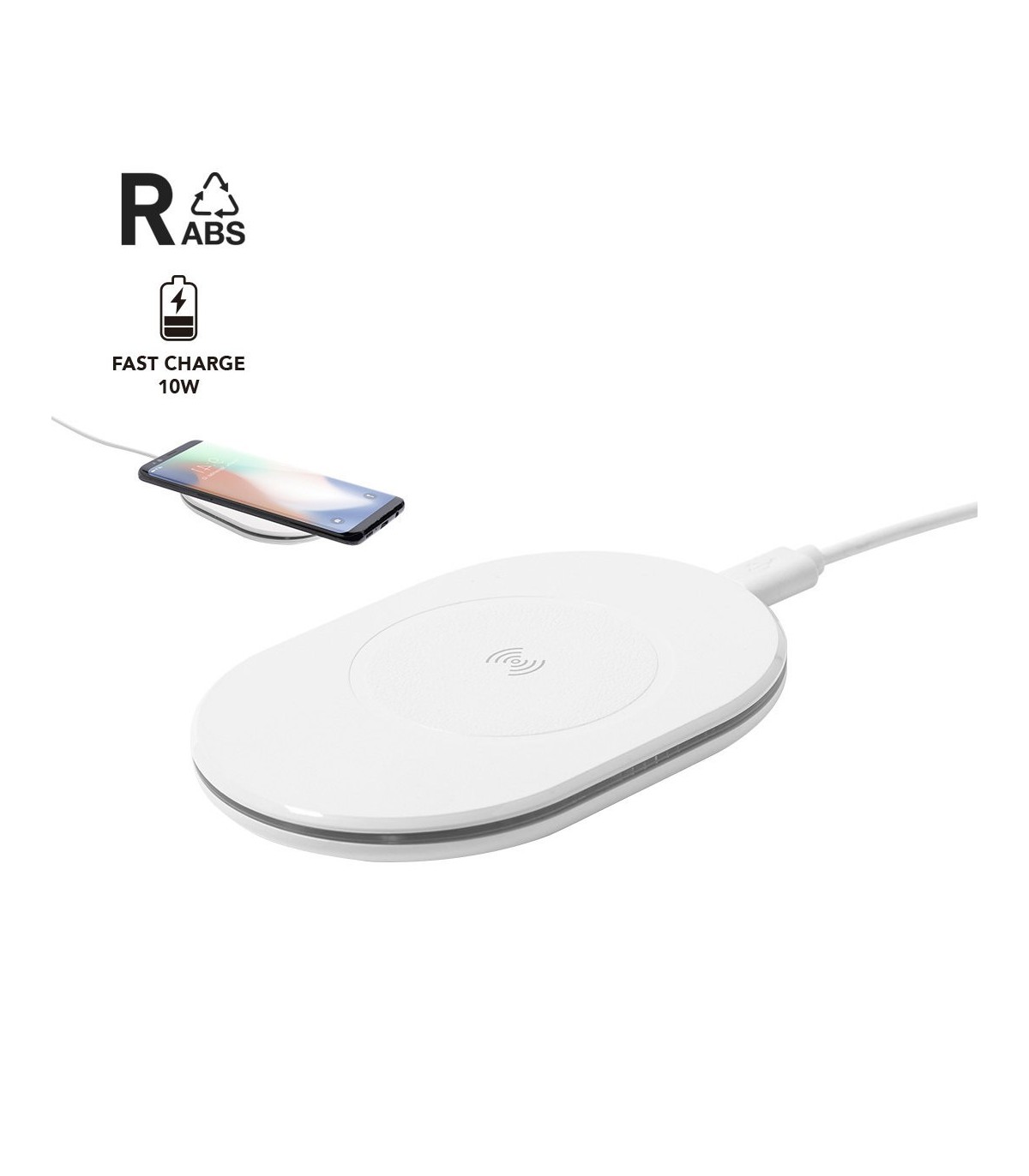 Cargadores inalámbricos 10W de elaboración ecológica con práctico diseño ovalado. Carcasa en ABS reciclado (RABS) y con certificación RCS, que garantiza el origen reciclado del mismo. Cable de carga incluido, base antideslizante y compatible con dispositivos equipados con tecnología de carga inalámbrica. Presentado en atractiva caja de diseño eco. Disponible manual de instrucciones en español e inglés.