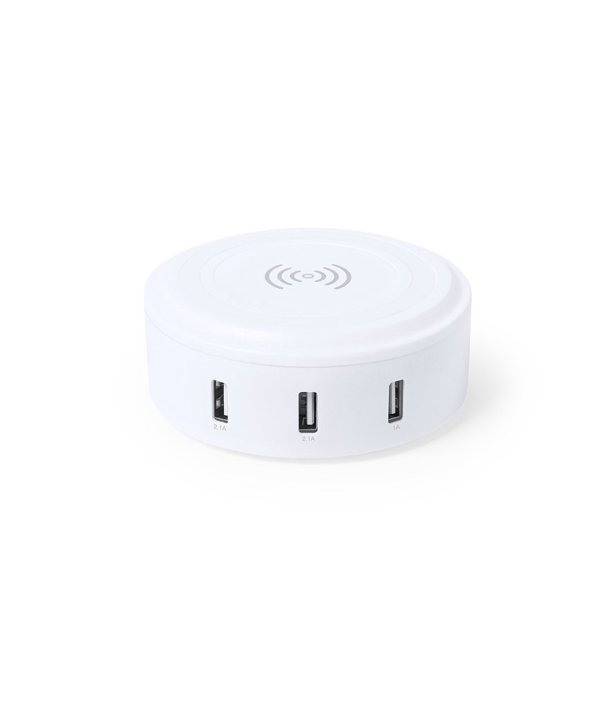 Cargador inalámbrico circular de 3.100mAh de capacidad de carga. Cuerpo en elegante acabado de color blanco. Con superficie y base antideslizante e indicador led de estado de carga. Incluye 3 salidas USB: 2x2.1A y 1x1A. Compatible con dispositivos equipados con tecnología de carga inalámbrica y presentado en atractiva caja de diseño.